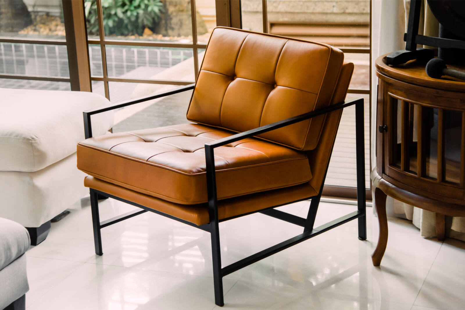 Relax in this armchair to get some reading done or to entertain guests. Leather upholstered cushions along with steel frames make this armchair stylish, comfortable, and sturdy. Customize the leather color and dimensions to make this chair a good fit for you and your home.