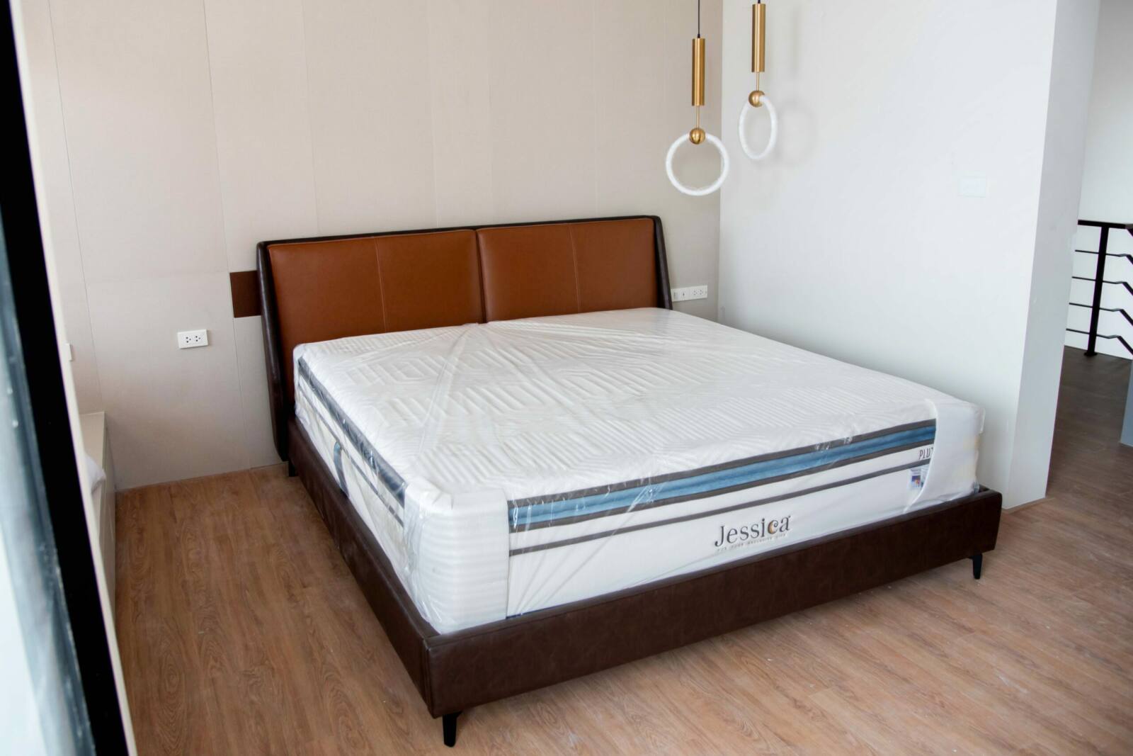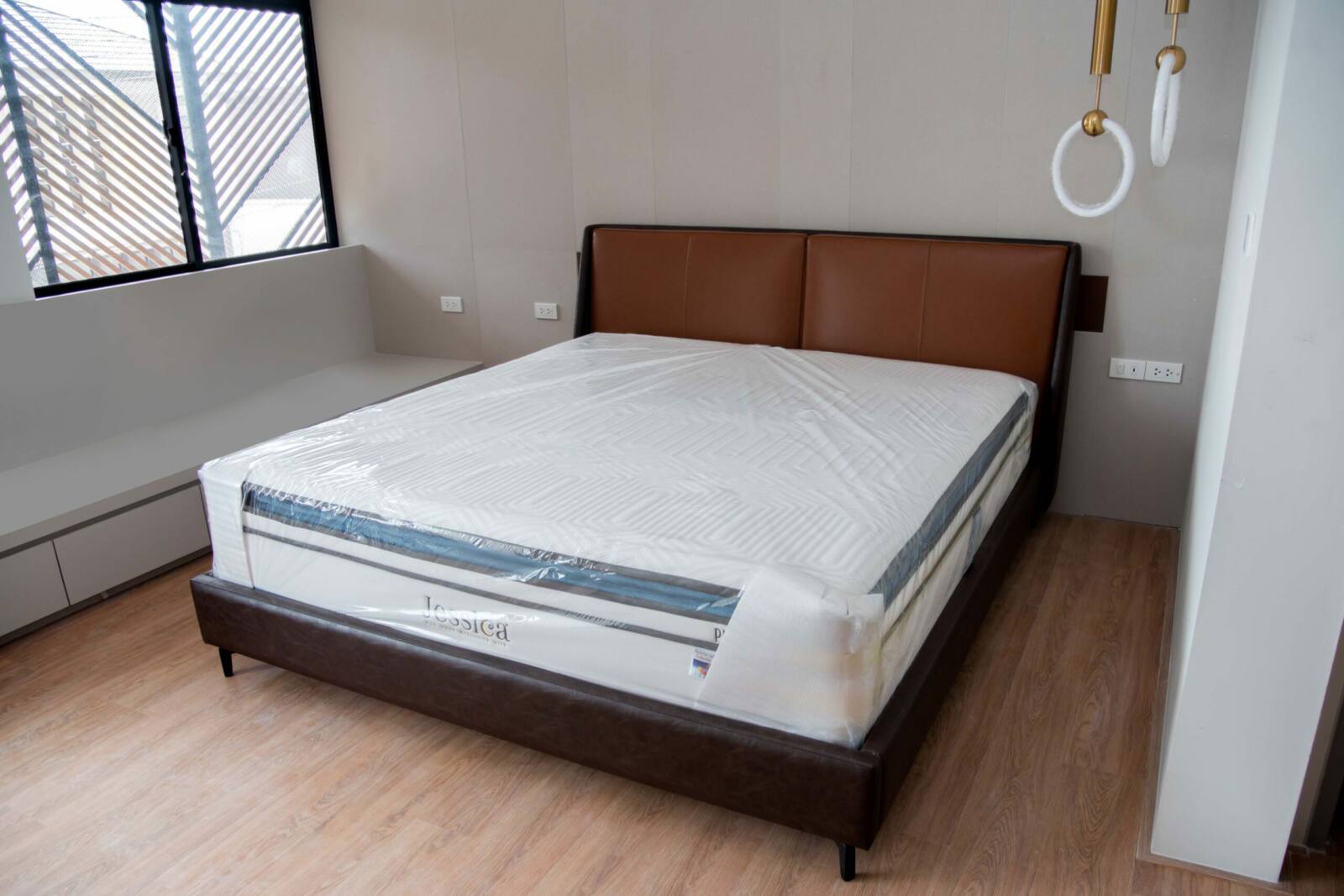 Introducing our wood framed bed with luxurious leather detailing, a perfect combination of sophistication and comfort. The sturdy wood frame provides solid support while the leather upholstery adds a touch of elegance to your bedroom décor. With customizable dimensions, wood types, and leather colors, you can create a truly personalized and unique piece that complements your style and enhances your sleep sanctuary.