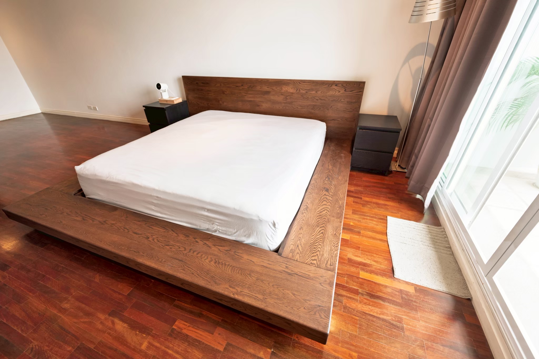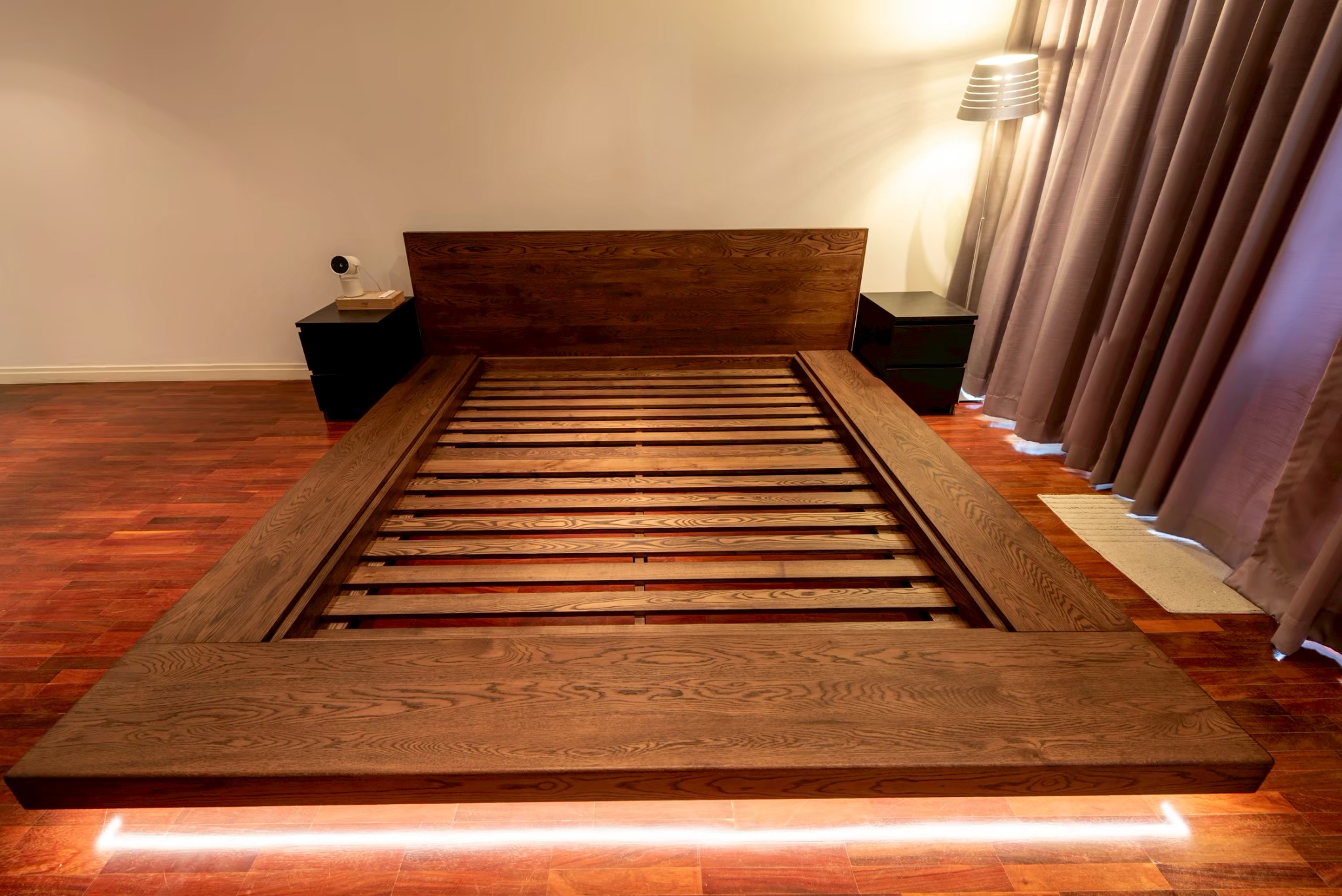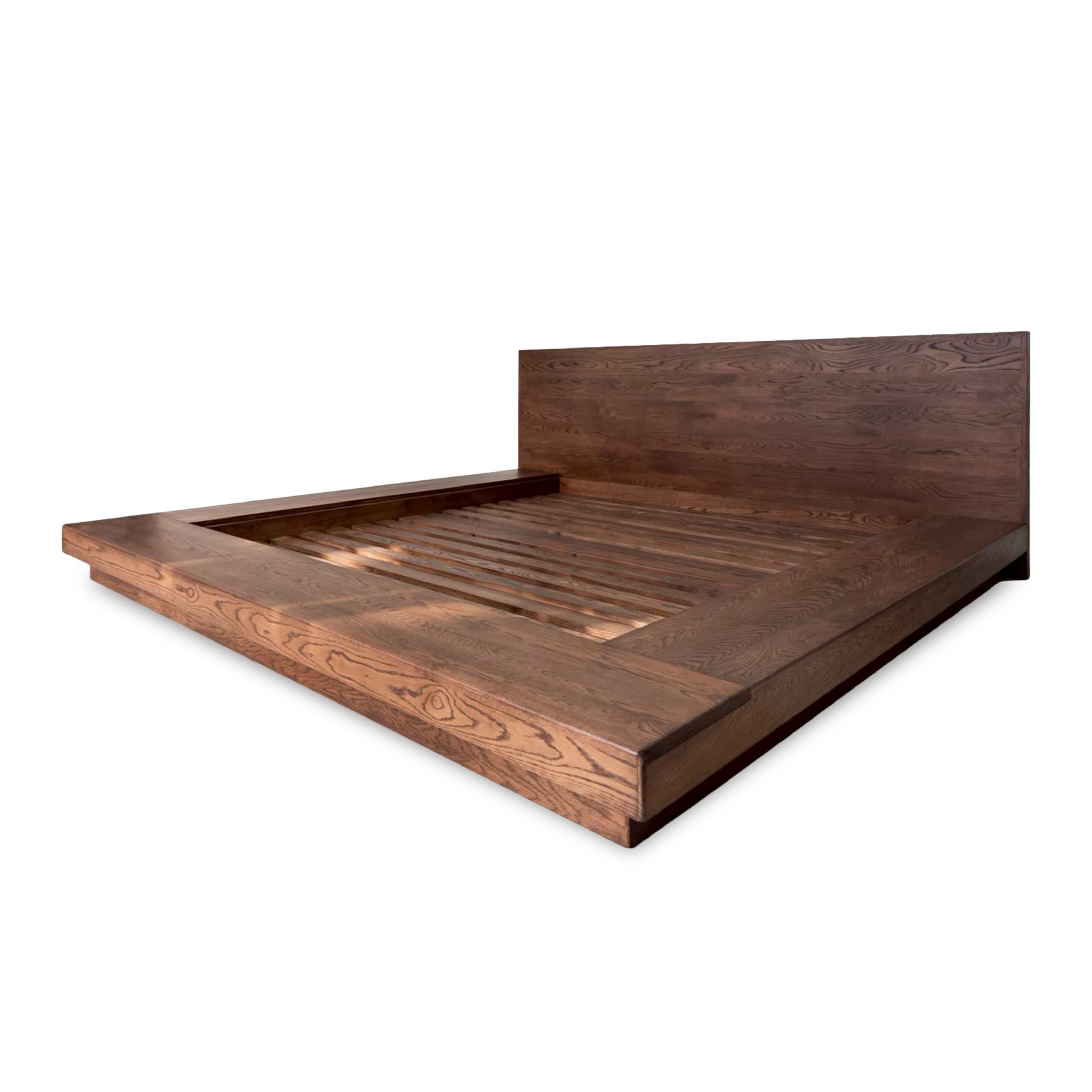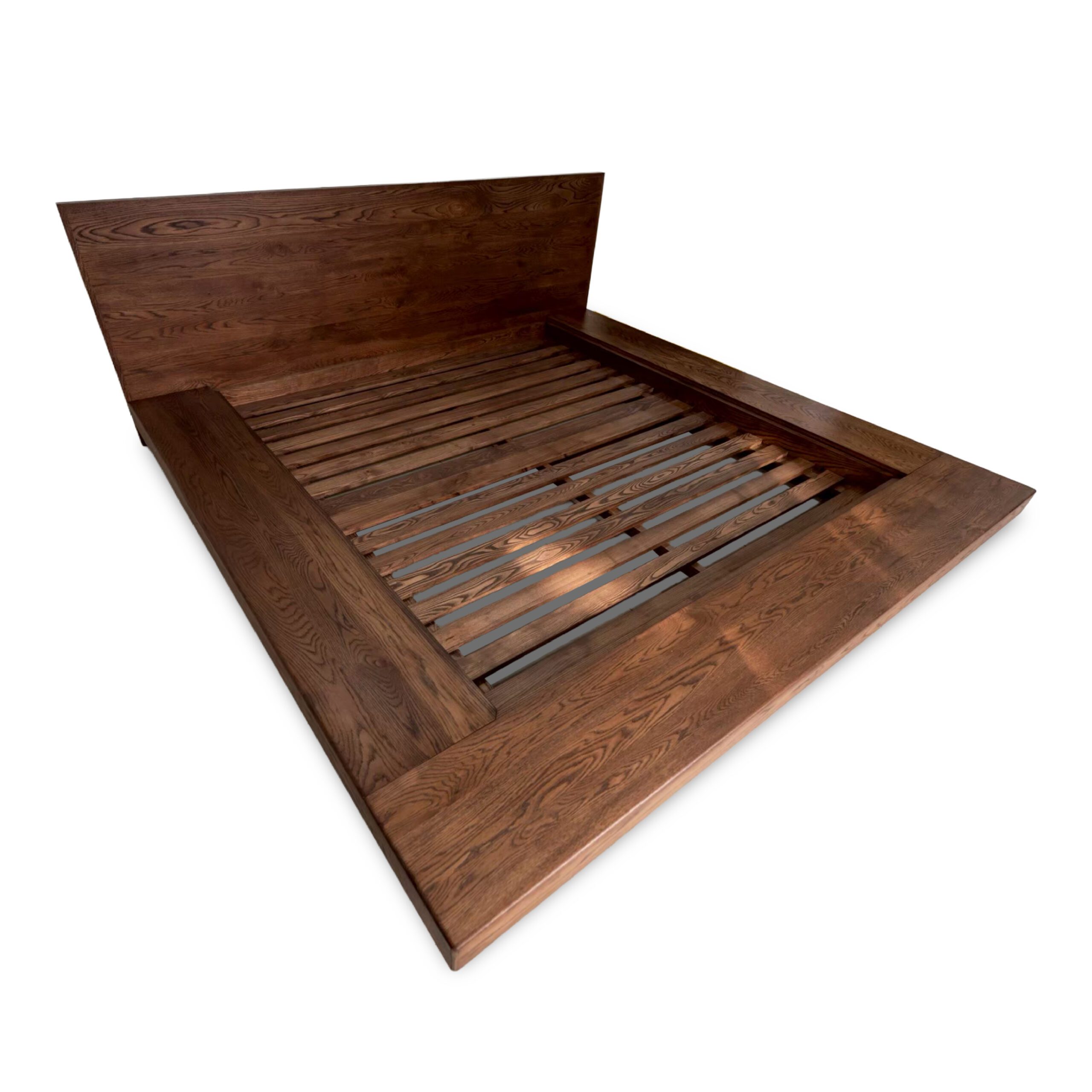 The Bed offers a luxurious and enduring sleep experience. This powerful, minimalist platform design is meticulously crafted entirely from premium solid wood. The rich brown finish and pronounced wood grain visible across the headboard and frame exude genuine premium quality and timeless elegance. Its robust structure is engineered for exceptional longevity, while the standardized slatted base ensures perfect mattress support. This bed is a true Investment Piece that brings a serene and tasteful atmosphere to your sanctuary.