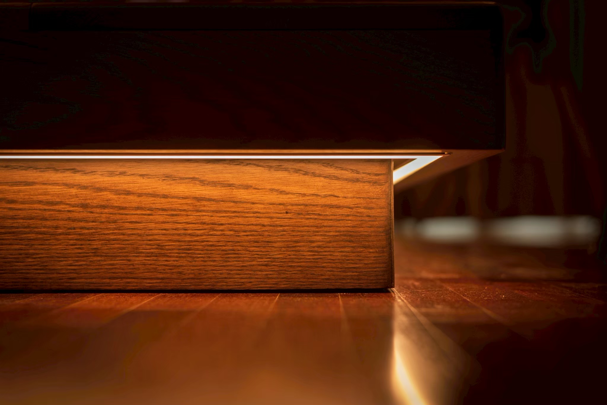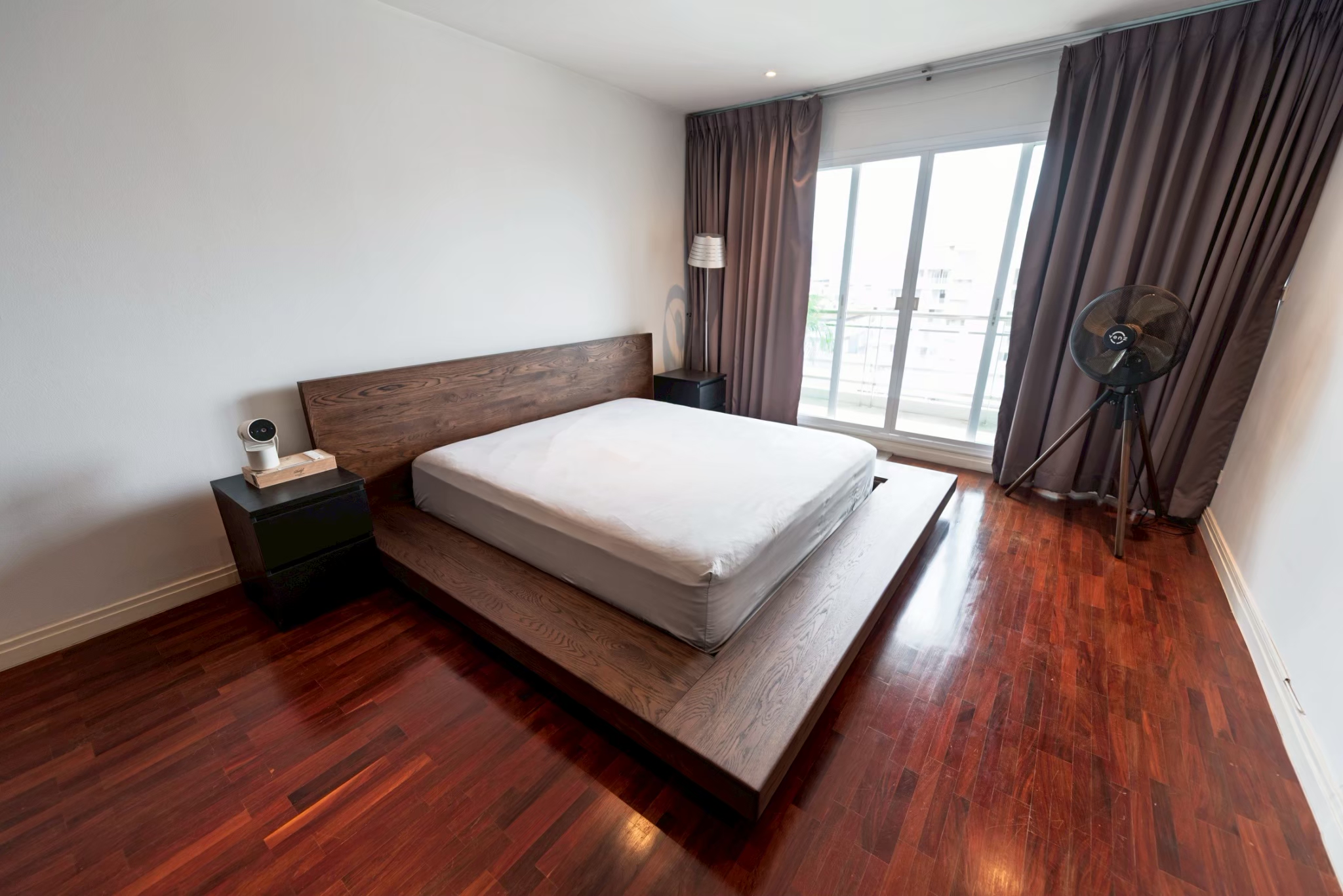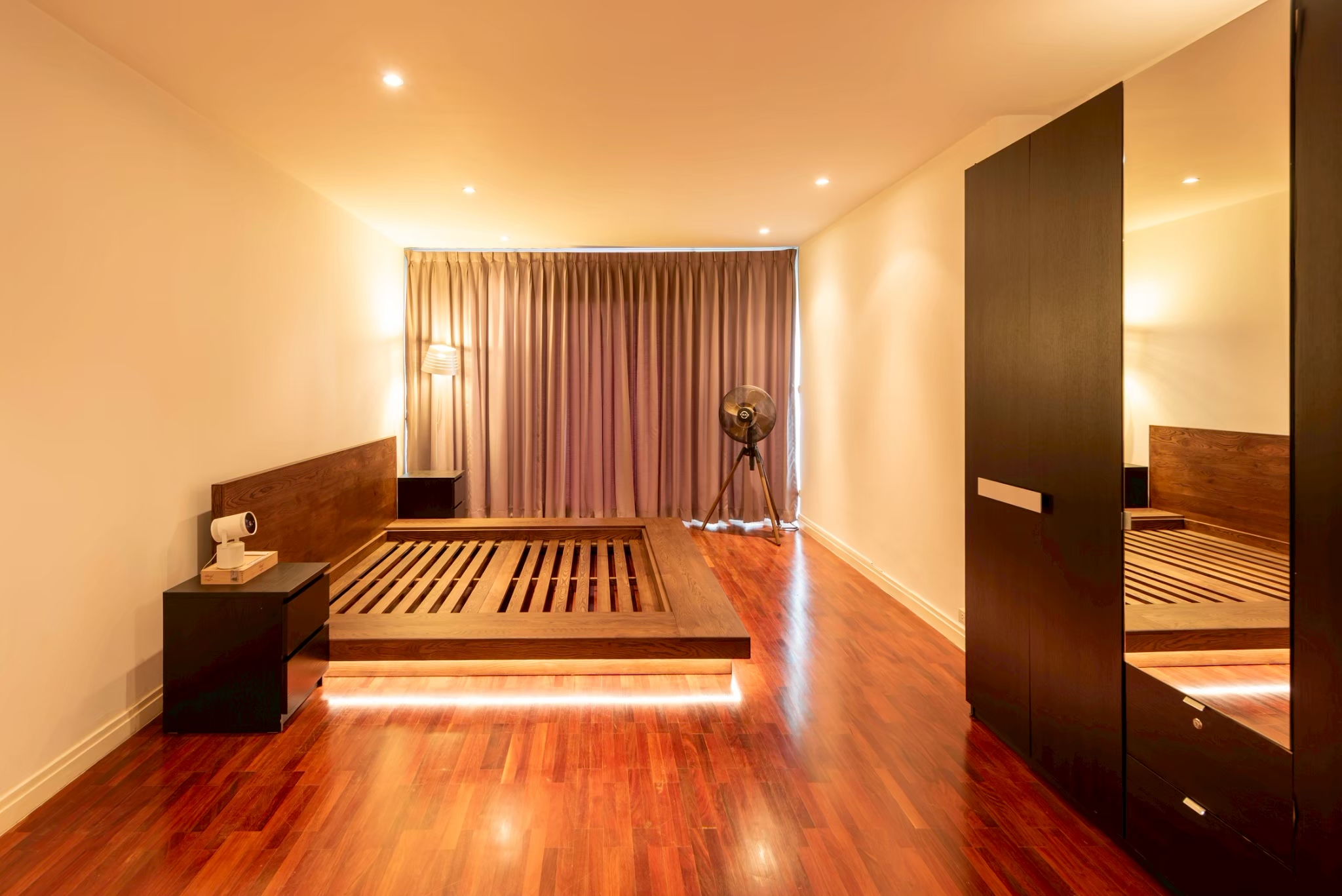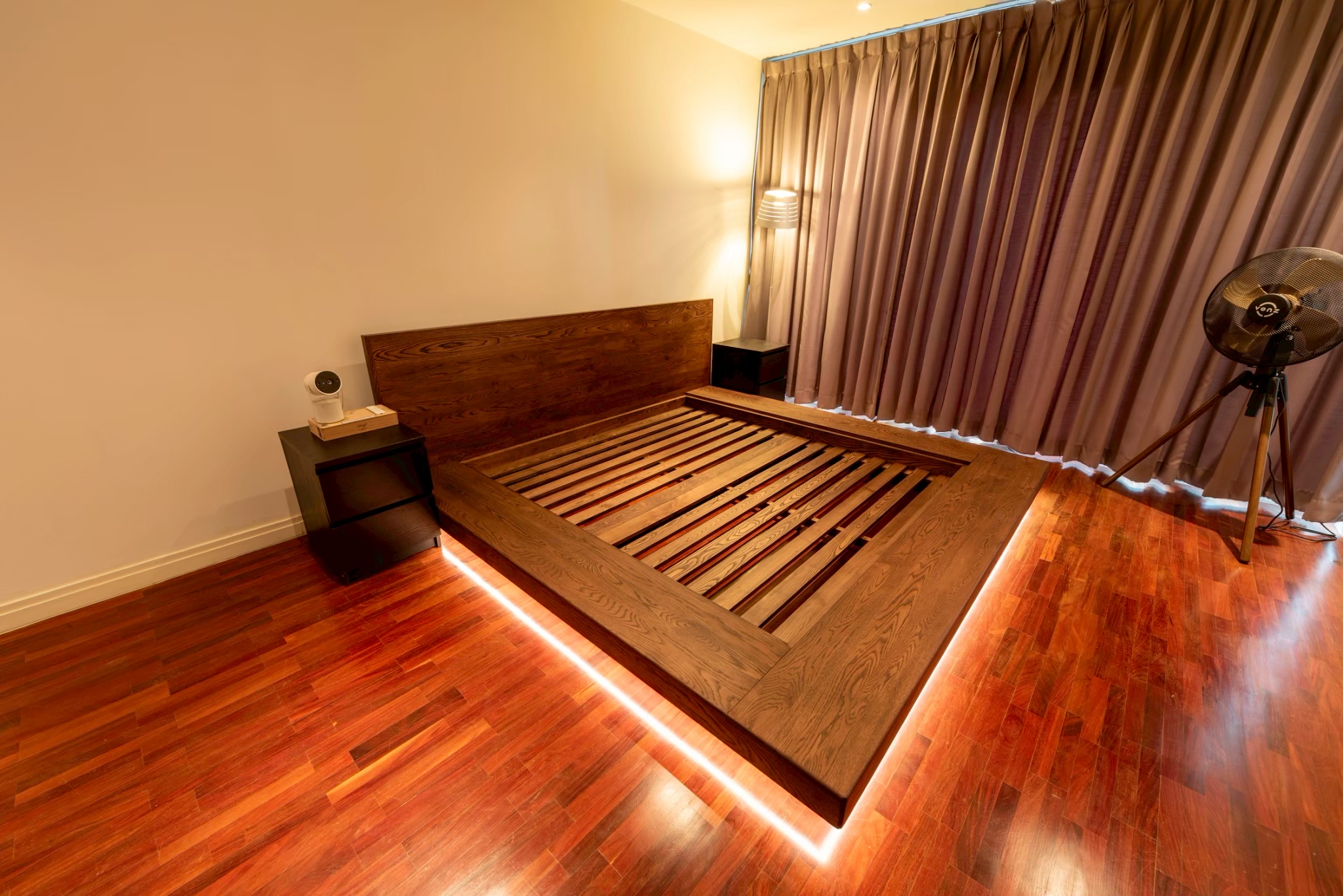 The Bed offers a luxurious and enduring sleep experience. This powerful, minimalist platform design is meticulously crafted entirely from premium solid wood. The rich brown finish and pronounced wood grain visible across the headboard and frame exude genuine premium quality and timeless elegance. Its robust structure is engineered for exceptional longevity, while the standardized slatted base ensures perfect mattress support. This bed is a true Investment Piece that brings a serene and tasteful atmosphere to your sanctuary.