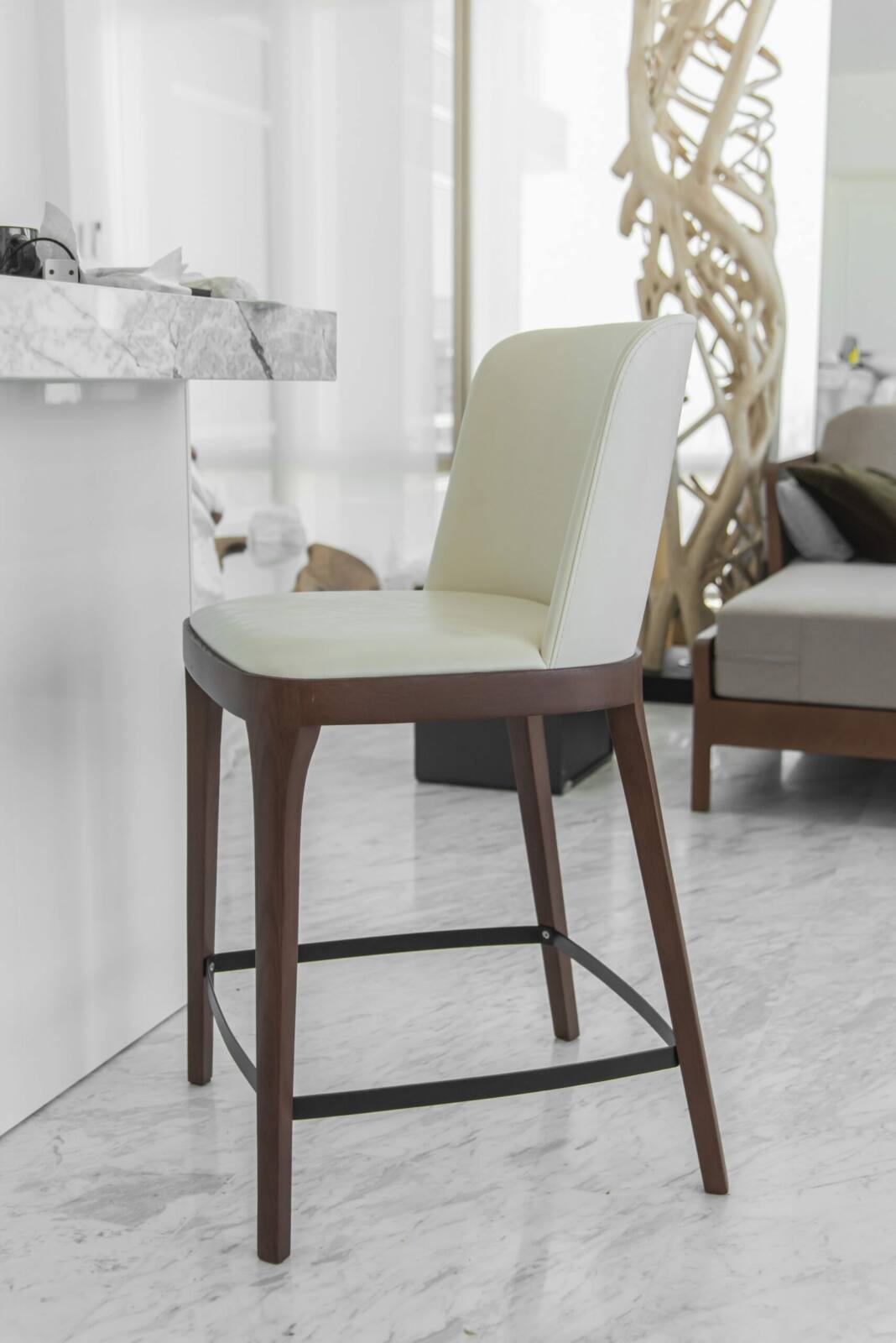 Elevate your space with our leather upholstered barstool. The comfortable backrest provides added support, while the solid wood base and legs guarantee durability and timeless style. Effortlessly integrate the barstool into your existing decor by customizing the wood type and finish, and personalize it further with customizable leather colors to create a truly unique and distinctive look. Indulge in ultimate comfort and transform your space with our leather upholstered barstool – the epitome of style and functionality.