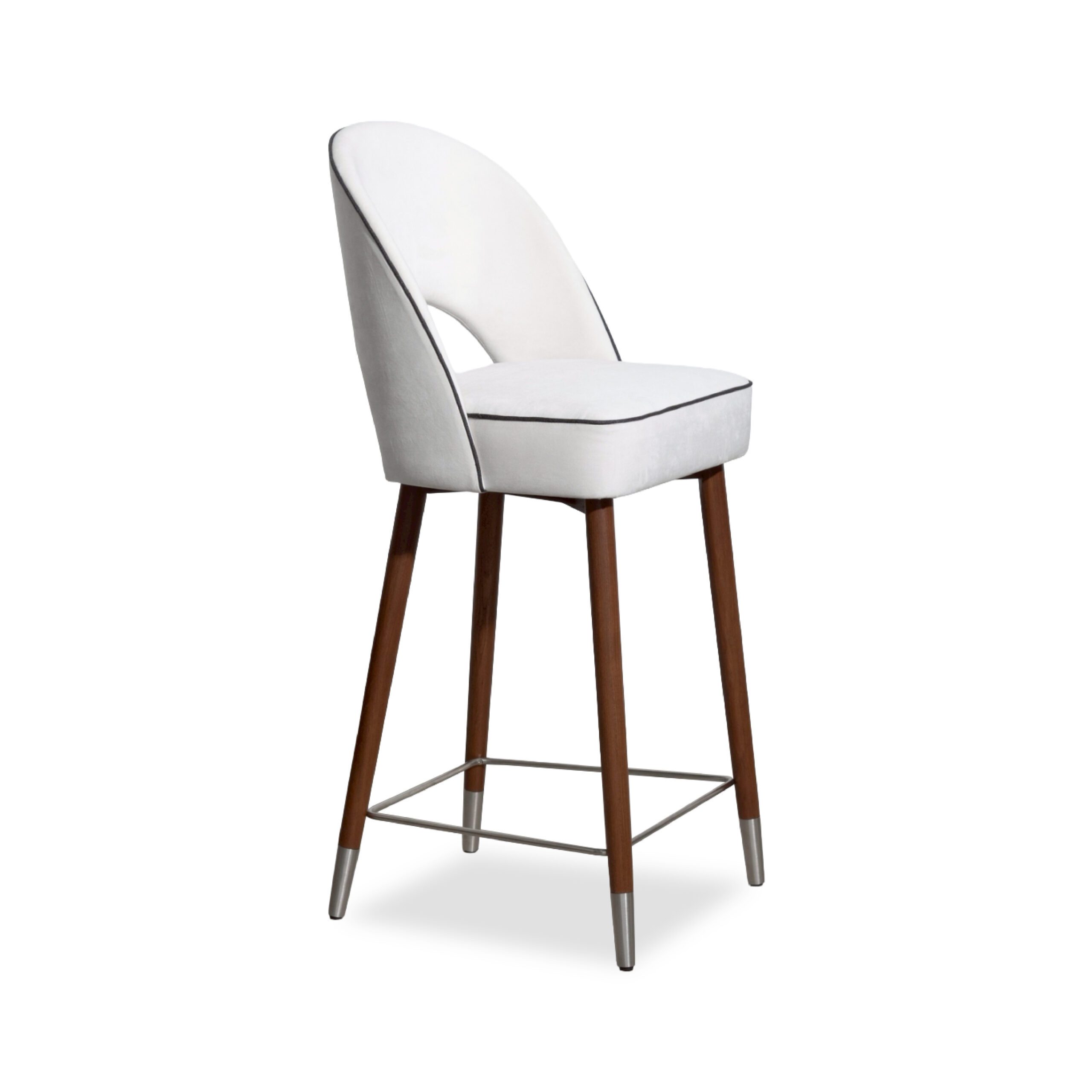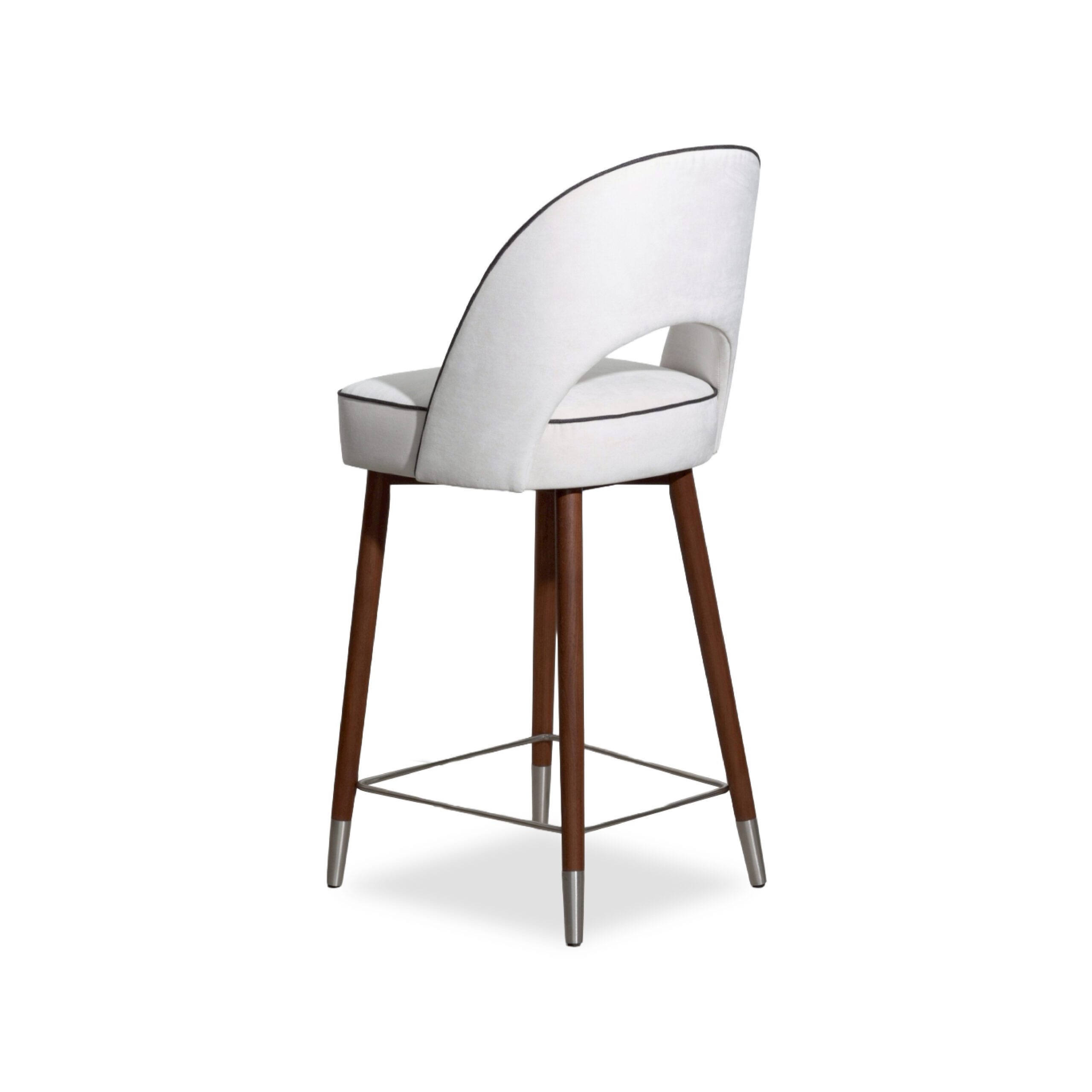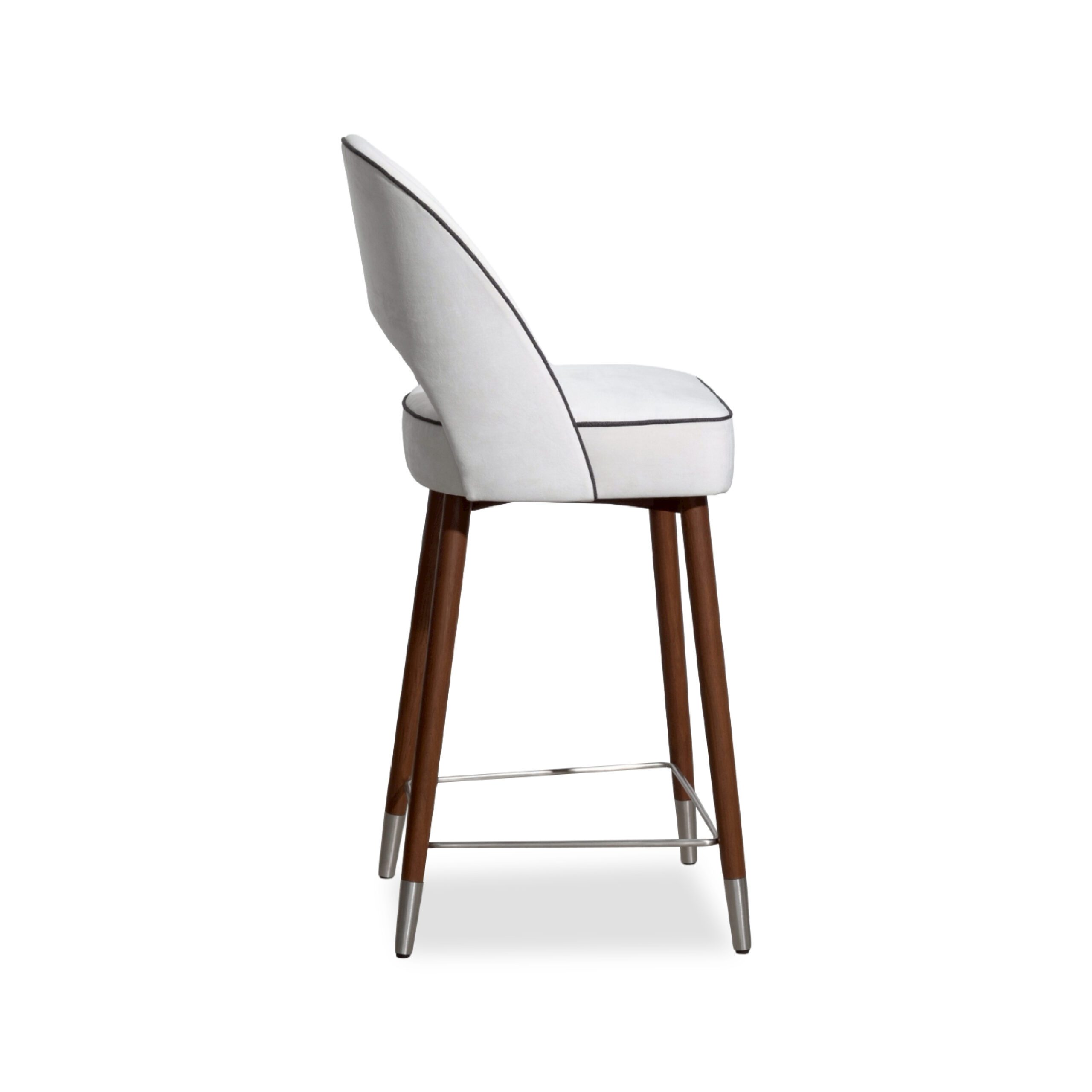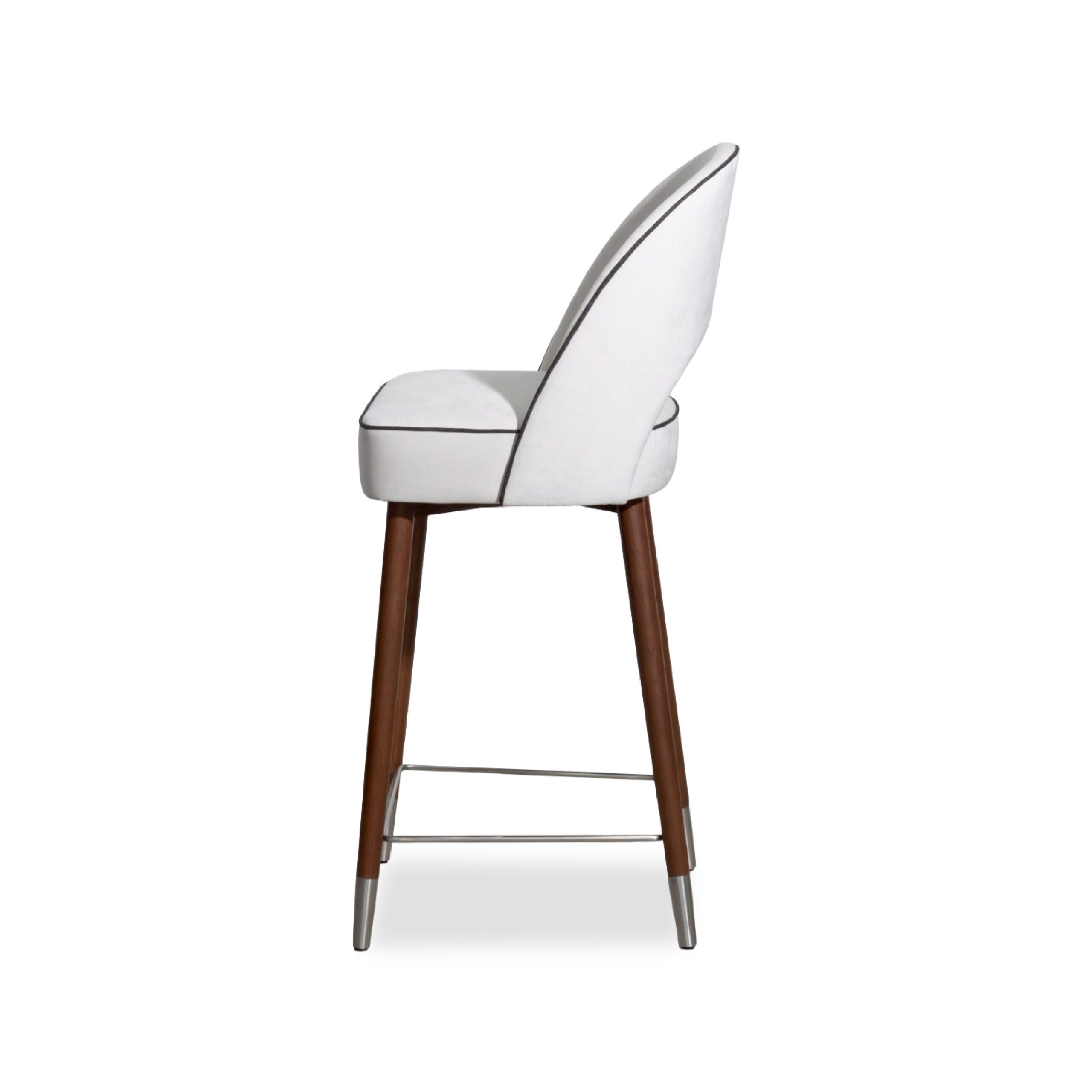 A sleek, refined chair that blends the warmth of genuine teak wood with high-quality upholstery. Solid teak legs provide strength, stability, and a timeless natural grain, complemented by a metal underframe for added durability and a contemporary touch. The seat and backrest are upholstered in light-colored fabric for a soft, comfortable feel and good ergonomic support, with seam-edge detailing that enhances refinement and luxury from every angle. The overall design feels modern, warm, and well-balanced—ideal for bar counters, dining rooms, or lounge areas that require furniture that is both beautiful and functional.