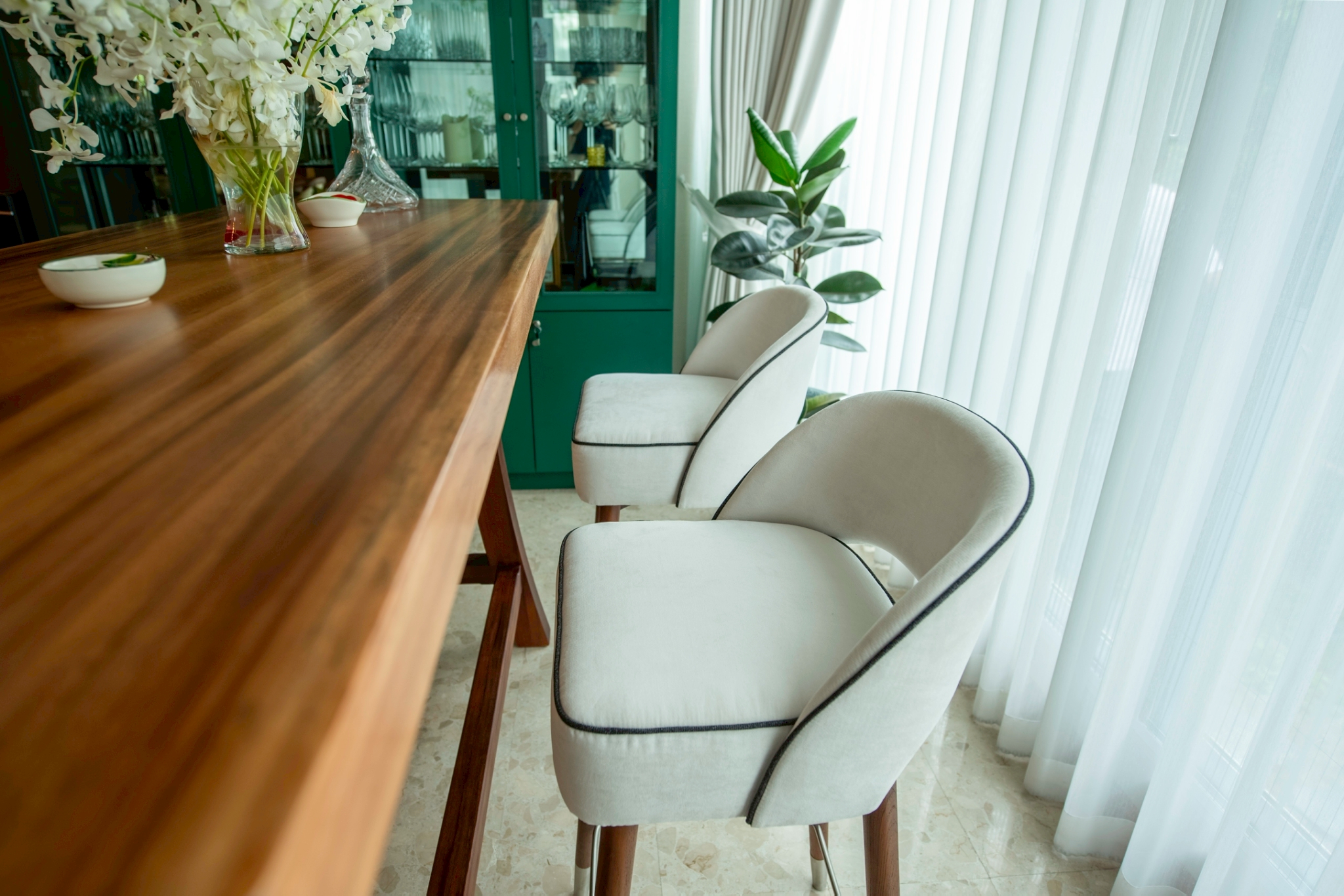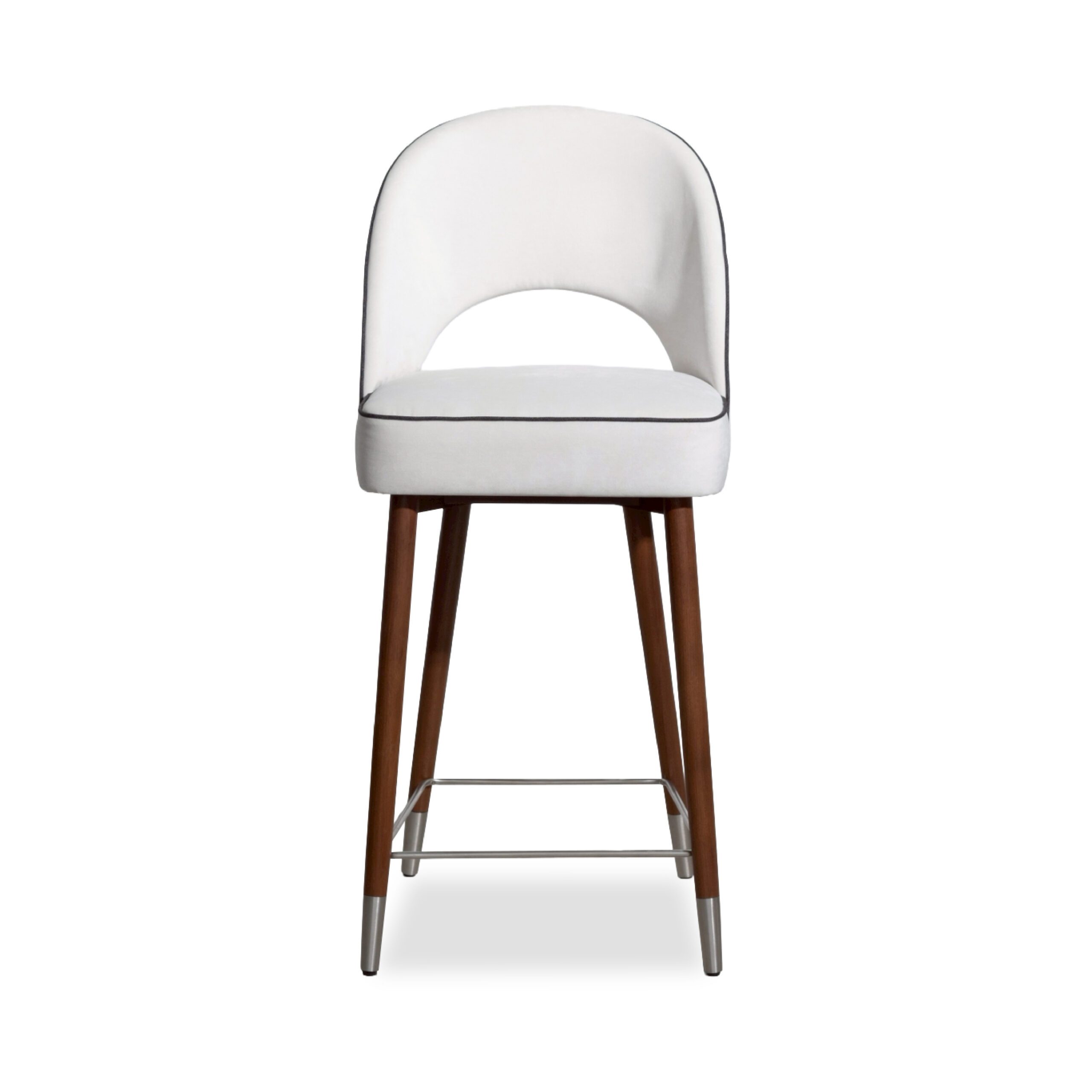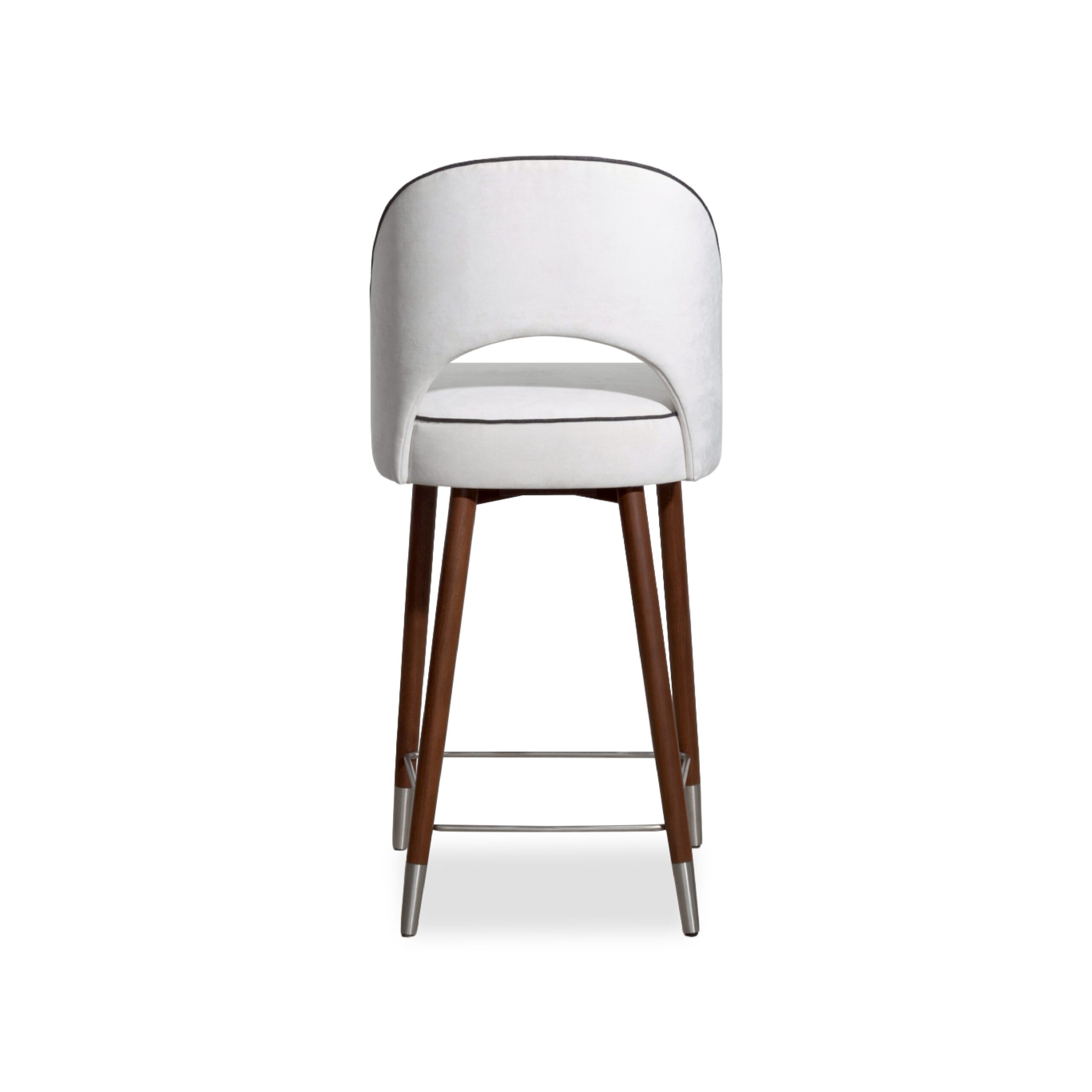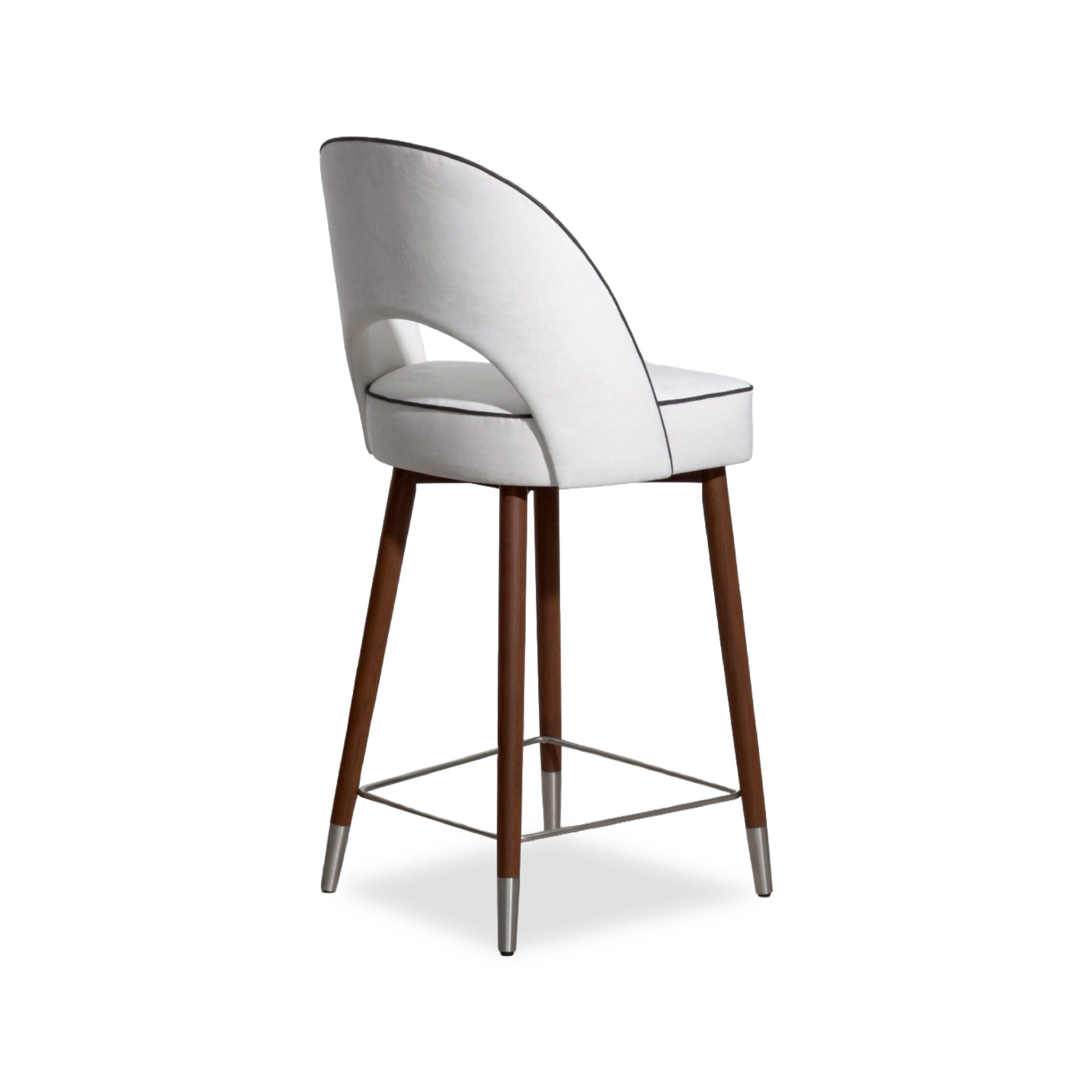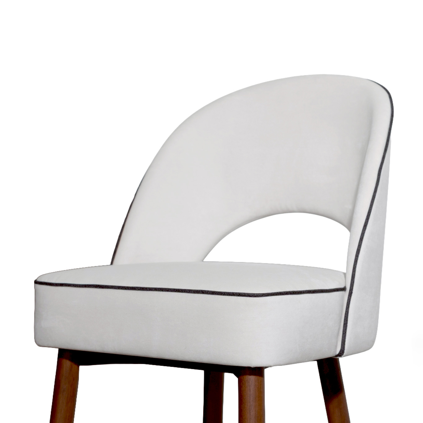 A sleek, refined chair that blends the warmth of genuine teak wood with high-quality upholstery. Solid teak legs provide strength, stability, and a timeless natural grain, complemented by a metal underframe for added durability and a contemporary touch. The seat and backrest are upholstered in light-colored fabric for a soft, comfortable feel and good ergonomic support, with seam-edge detailing that enhances refinement and luxury from every angle. The overall design feels modern, warm, and well-balanced—ideal for bar counters, dining rooms, or lounge areas that require furniture that is both beautiful and functional.