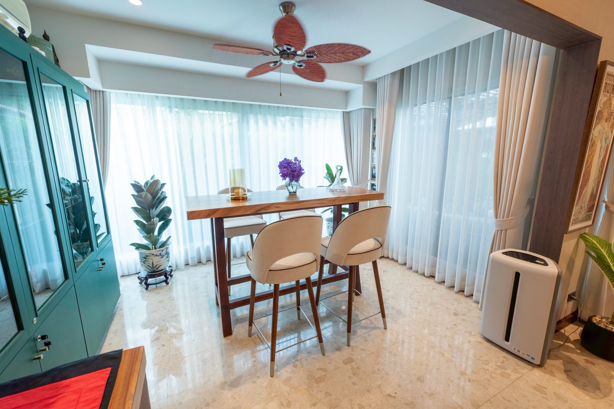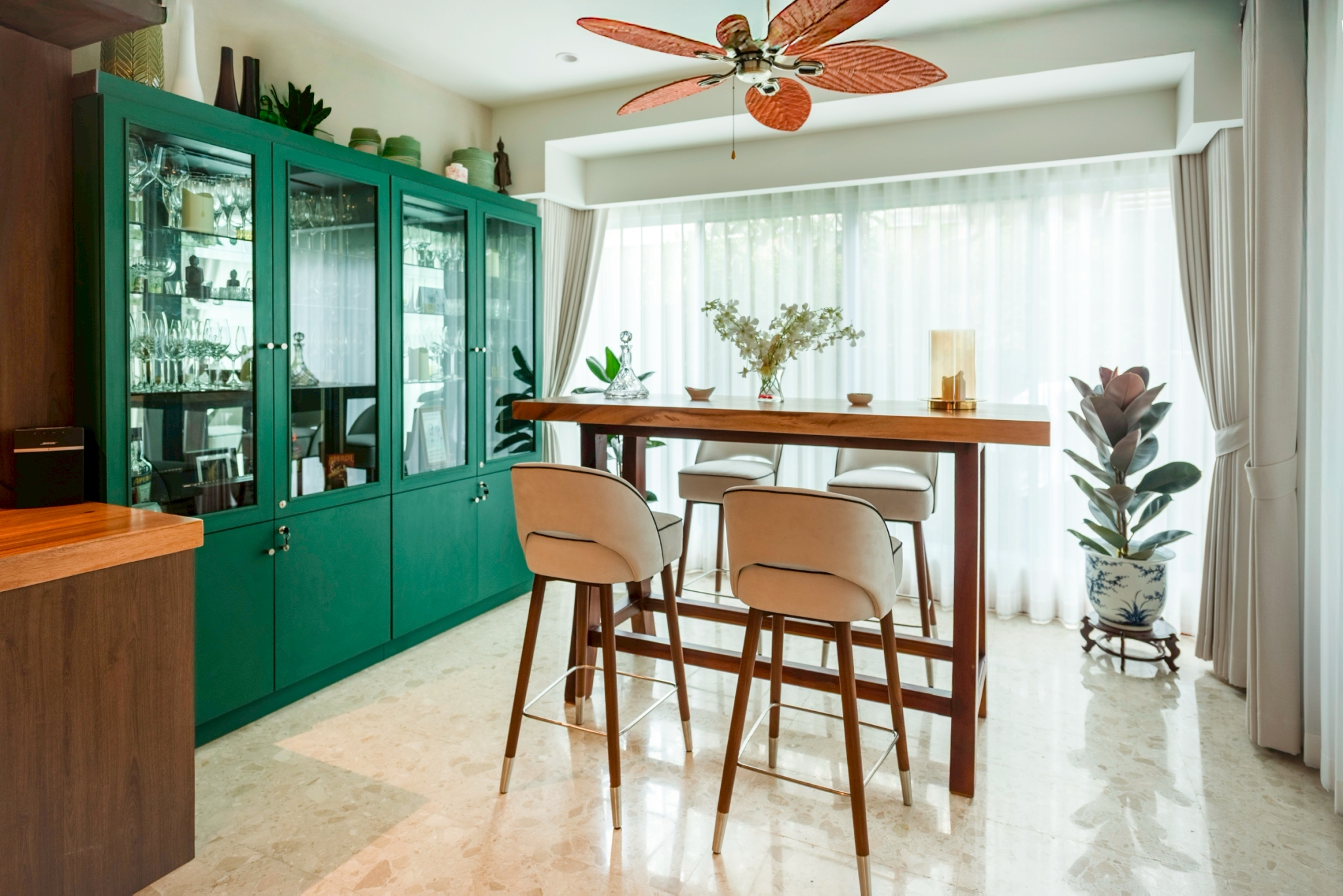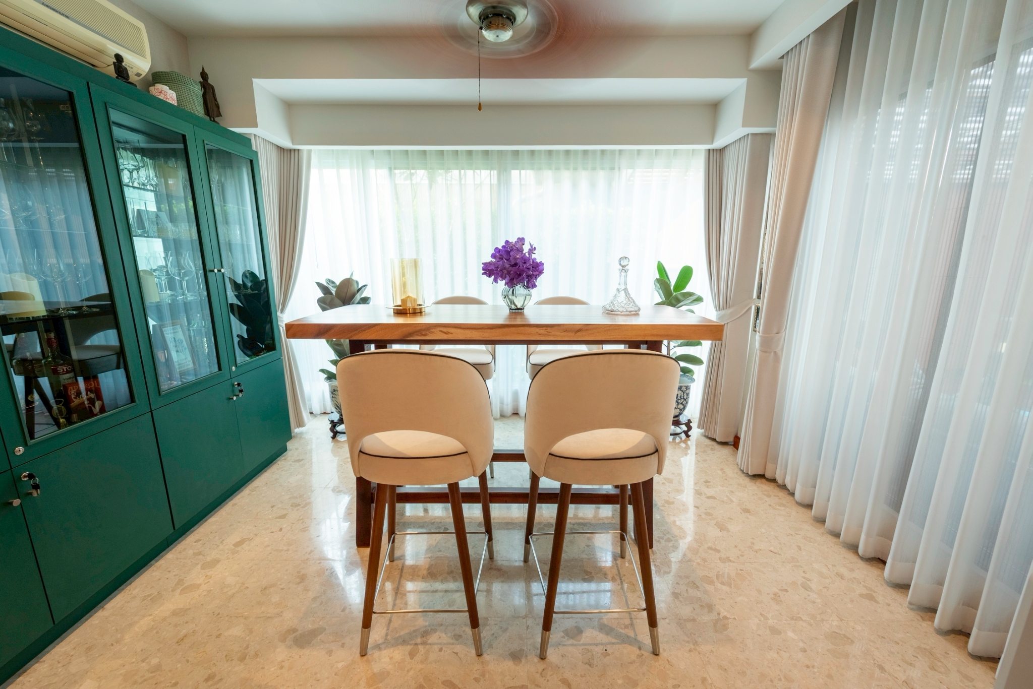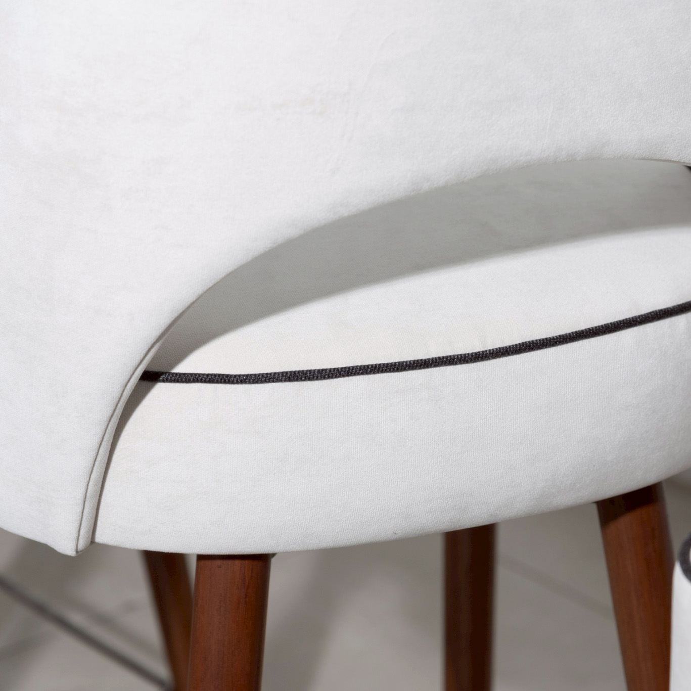 A sleek, refined chair that blends the warmth of genuine teak wood with high-quality upholstery. Solid teak legs provide strength, stability, and a timeless natural grain, complemented by a metal underframe for added durability and a contemporary touch. The seat and backrest are upholstered in light-colored fabric for a soft, comfortable feel and good ergonomic support, with seam-edge detailing that enhances refinement and luxury from every angle. The overall design feels modern, warm, and well-balanced—ideal for bar counters, dining rooms, or lounge areas that require furniture that is both beautiful and functional.