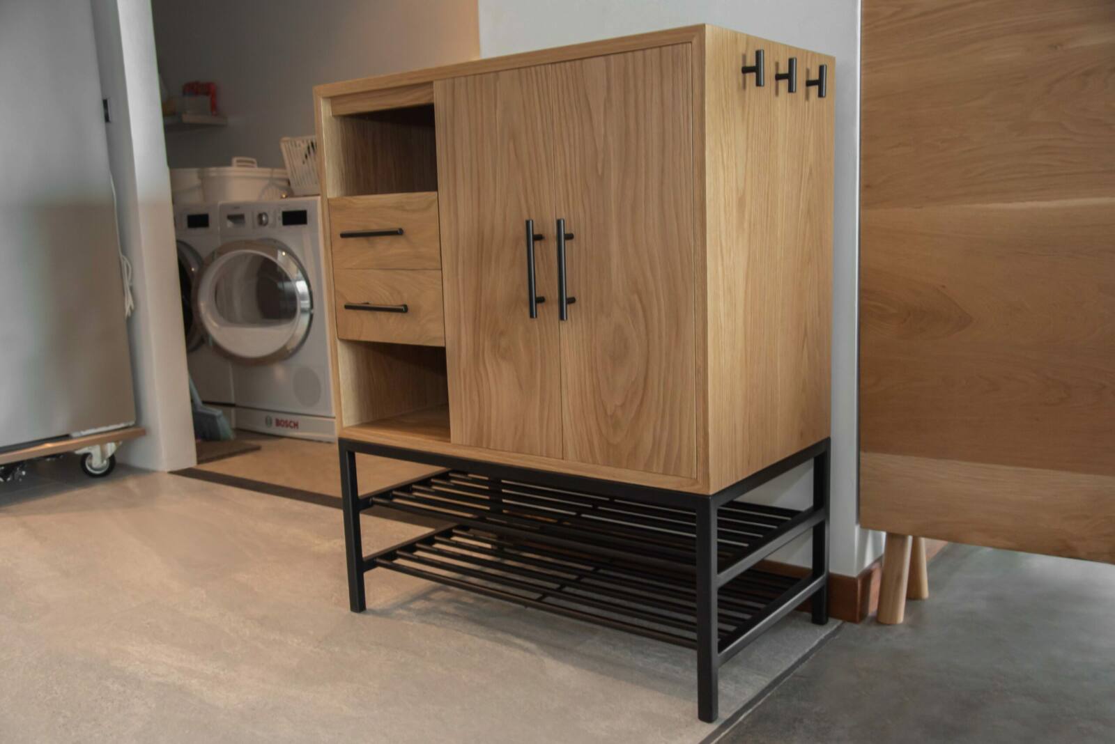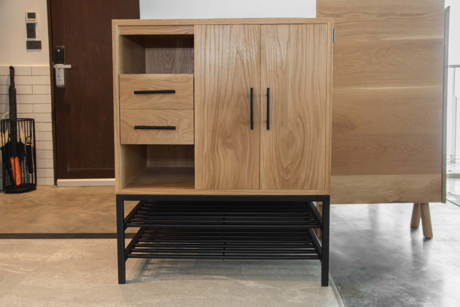 Our solid wood and steel cabinet is the perfect combination of rugged durability and refined style. Made from premium American oak with sturdy steel legs and bottom racks, it offers ample storage space while adding a touch of industrial elegance to your decor. With customizable options for wood type, wood finish, dimensions, and design, you can create a personalized cabinet that perfectly fits your space and elevates your style.