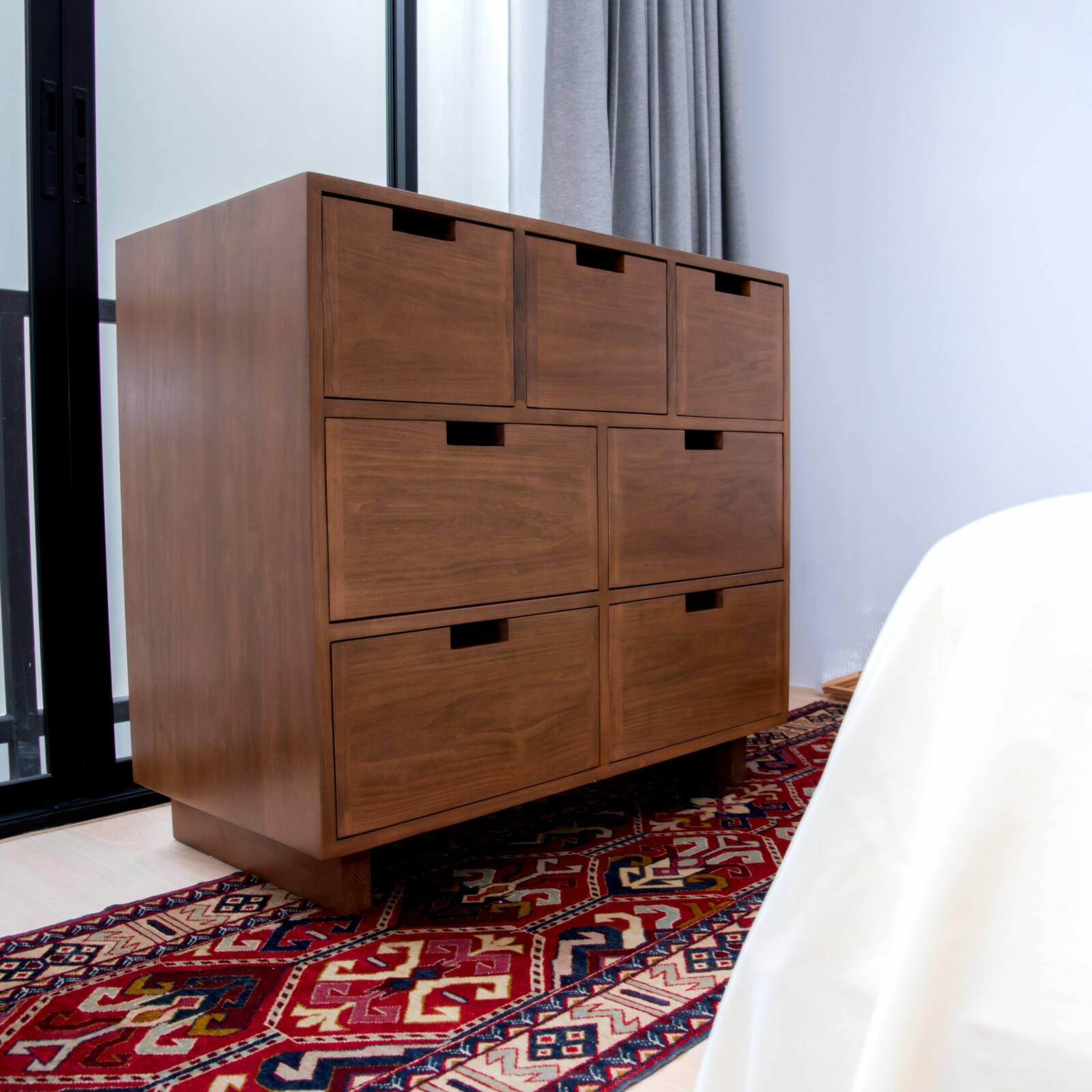 Our solid wood drawer unit is a masterpiece, meticulously crafted from stained American ash wood and expertly designed to provide maximum functionality. With its seven generously sized drawers, this unit offers ample storage space while adding a touch of sophistication to your decor. Customize the wood type, wood finish, dimensions, and design to perfectly match your personal preferences and create a unique drawer unit that complements your space.