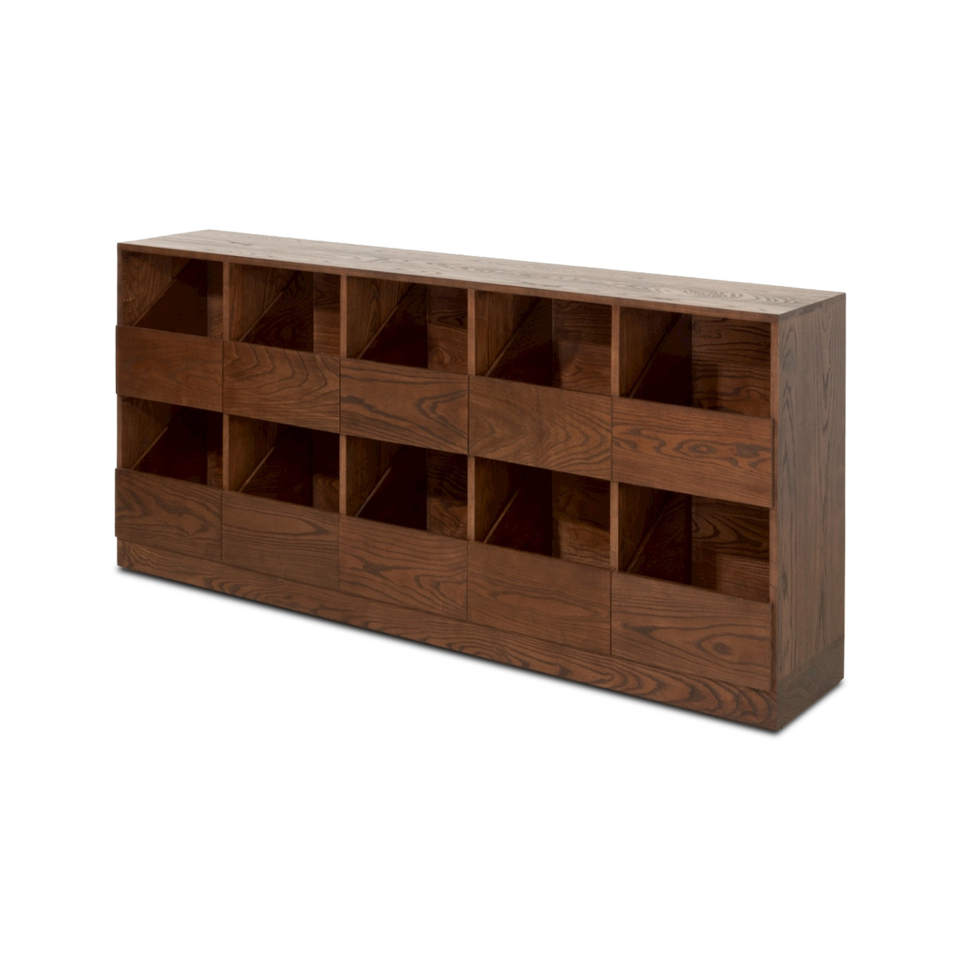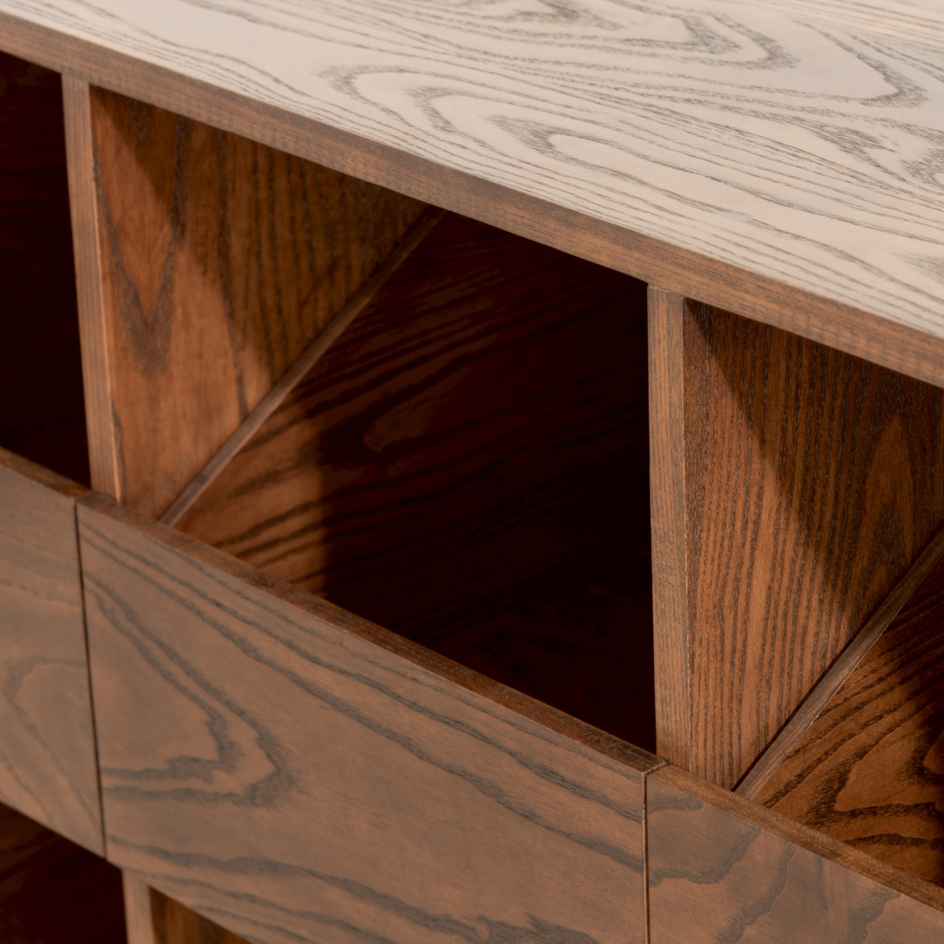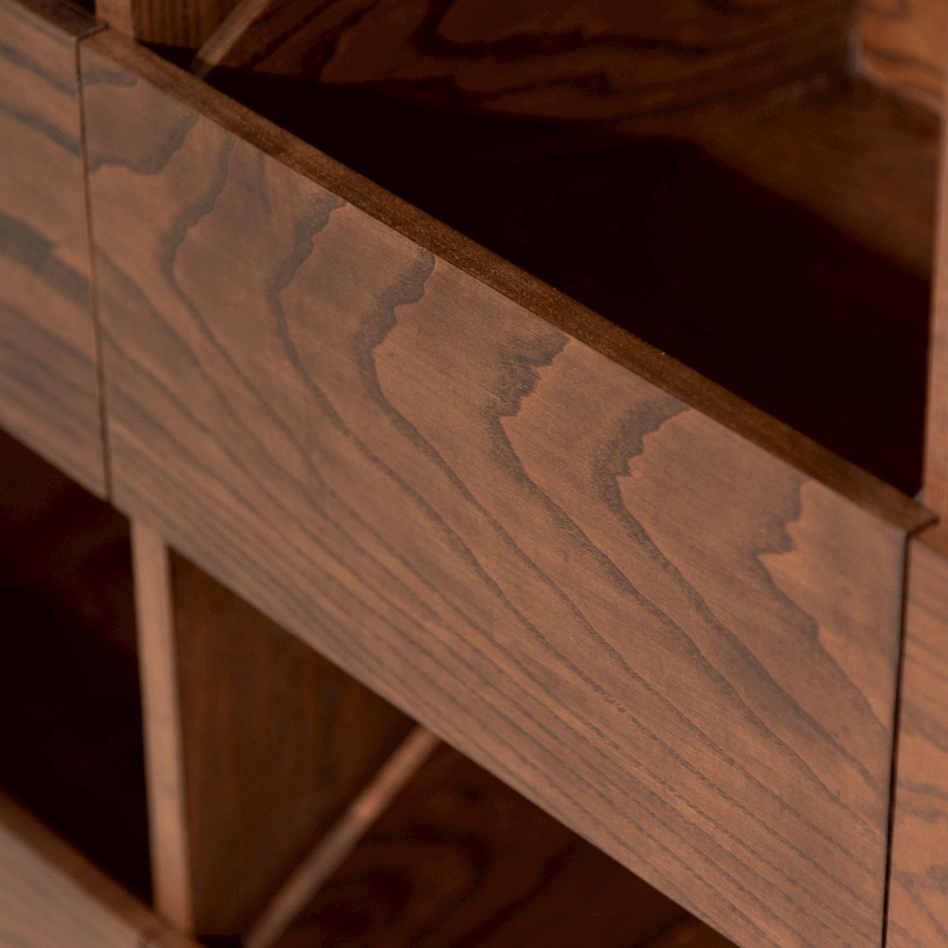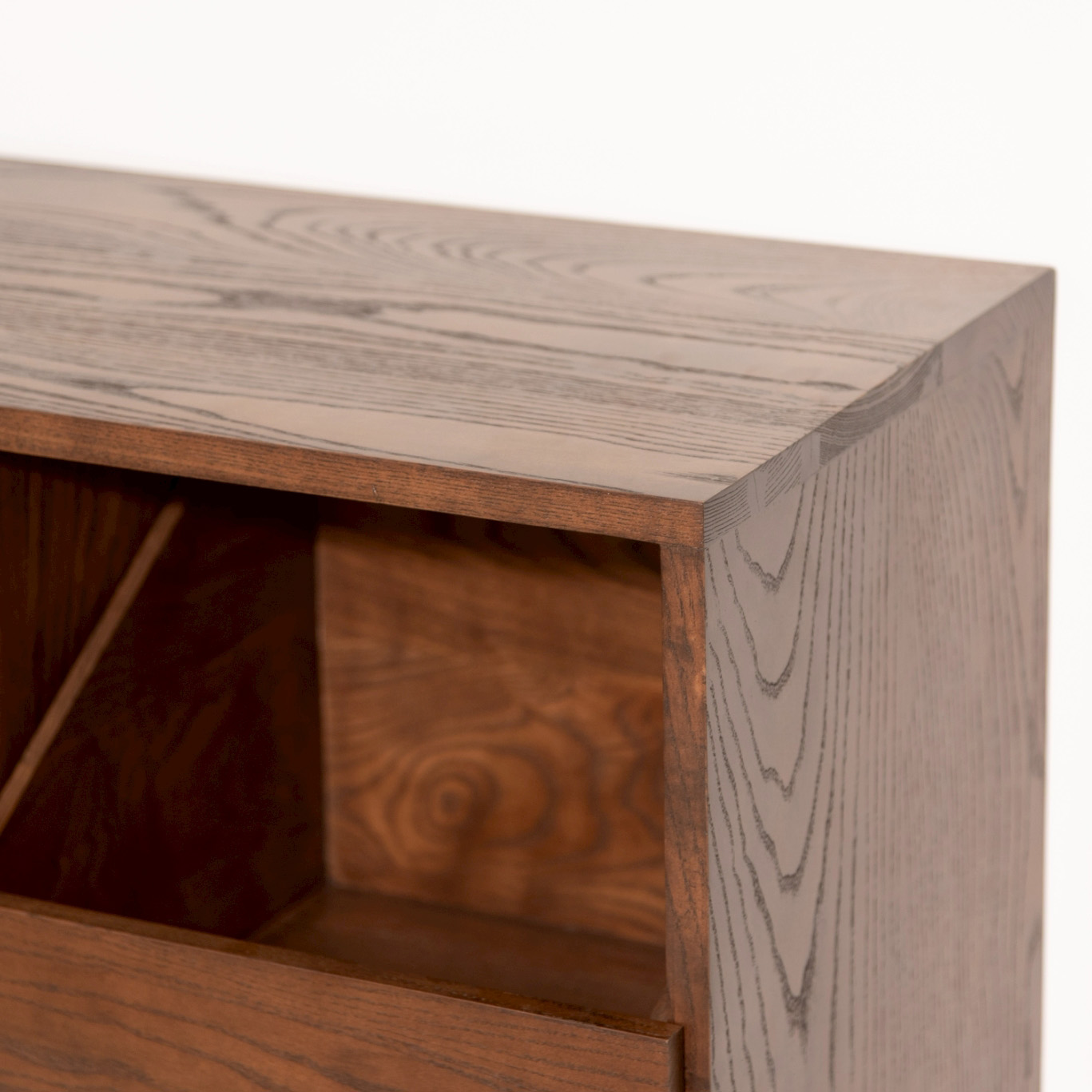 This ash wood drawer cabinet showcases the allure of genuine timber with a dark tone that accentuates the grain in every dimension, beautifully revealing ash’s distinctive natural patterns. Its sturdy, durable construction ensures reliable daily use, while the storage layout—organized into drawers and open compartments—reflects real user behavior, making organization systematic, items easy to access, and contents visible from every angle. Sharp cornering and precise lines highlight careful craftsmanship, resulting in a unique design piece that adds depth and refined taste to any home space.