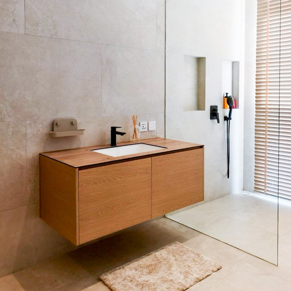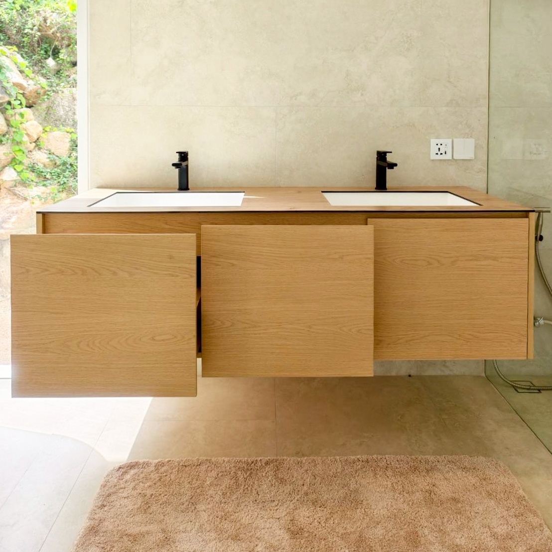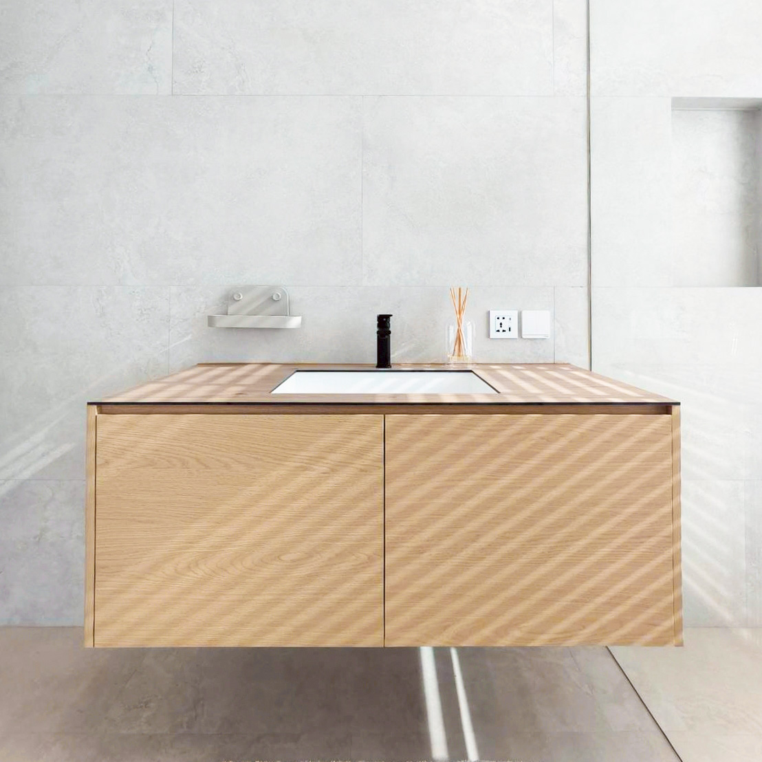 This elegant under‑sink cabinet is crafted from genuine American Ash, showcasing natural wood grain and a warm, light tone that adds a premium feel to any bathroom. The sturdy, durable construction features a clean, refined design with crisp lines that create a sense of openness and cleanliness. Inside, the layout is organized for efficient storage, while the floating cabinet design lends a modern look and makes cleaning easier. It can also be customized to fit the actual space, delivering both beauty and functionality throughout the home.