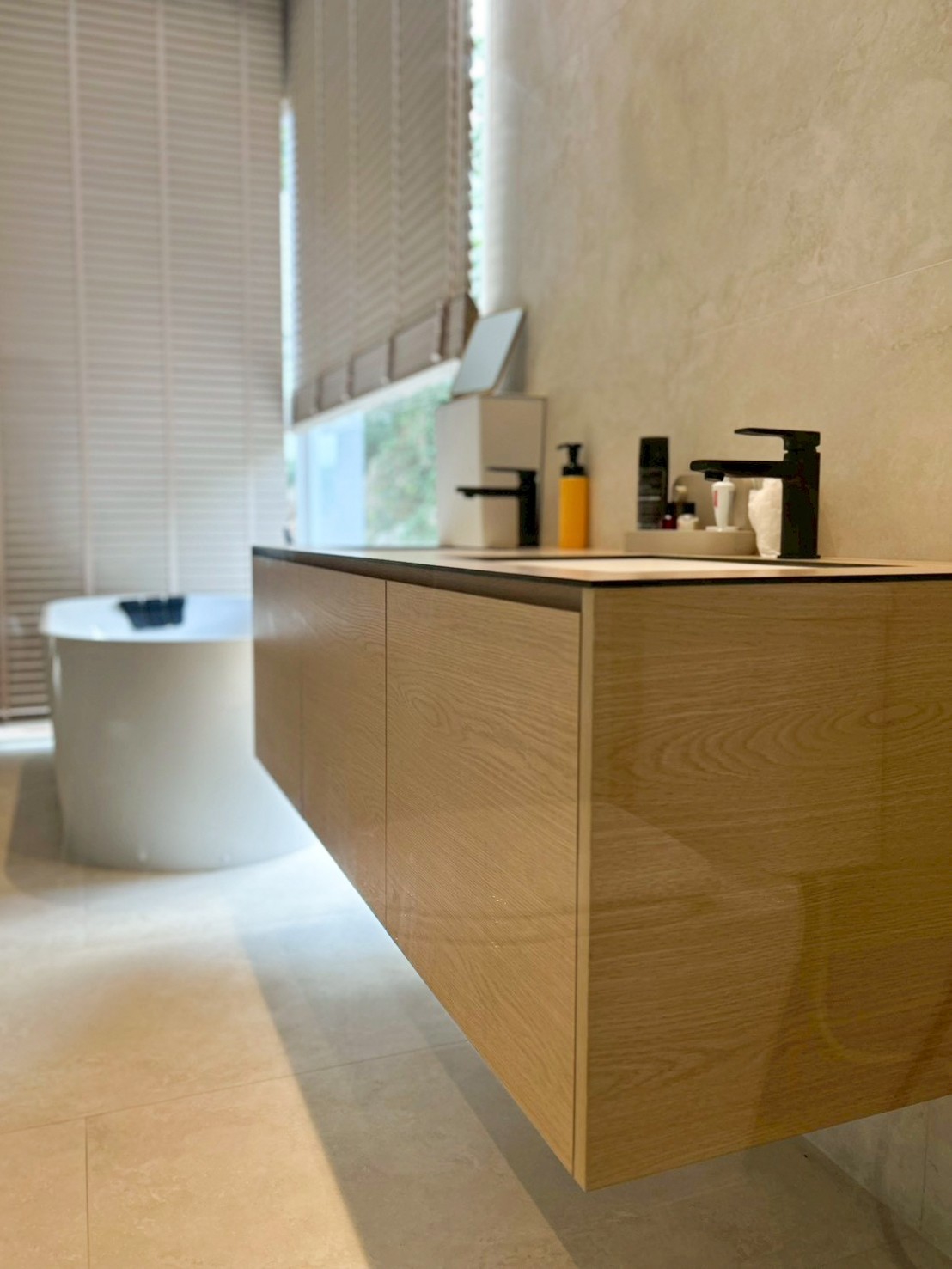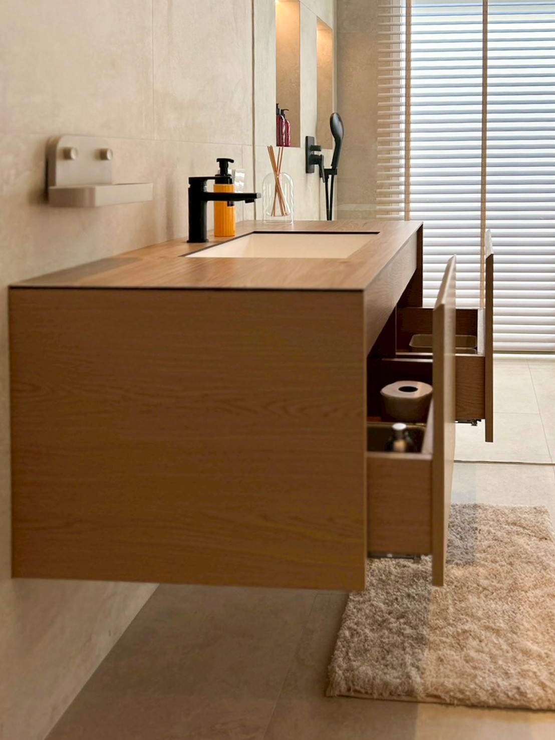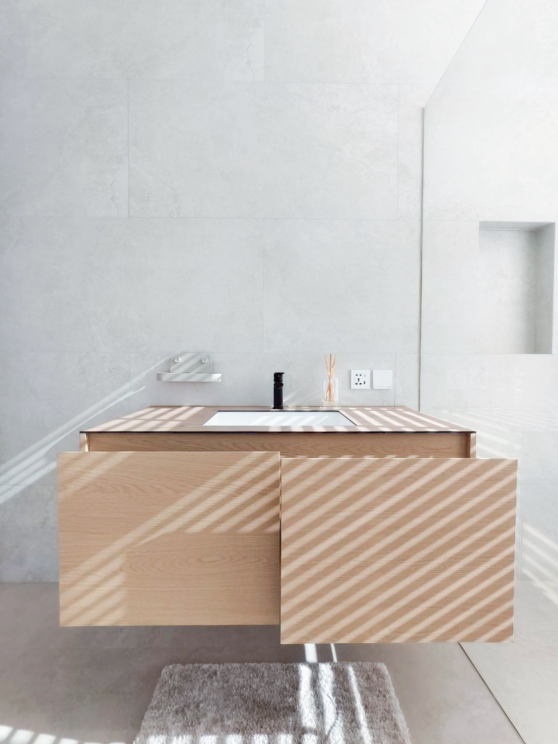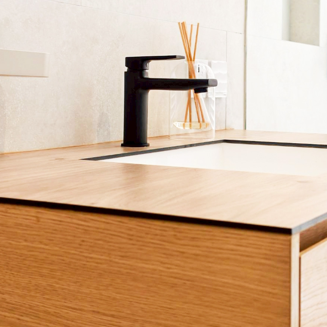 This elegant under‑sink cabinet is crafted from genuine American Ash, showcasing natural wood grain and a warm, light tone that adds a premium feel to any bathroom. The sturdy, durable construction features a clean, refined design with crisp lines that create a sense of openness and cleanliness. Inside, the layout is organized for efficient storage, while the floating cabinet design lends a modern look and makes cleaning easier. It can also be customized to fit the actual space, delivering both beauty and functionality throughout the home.