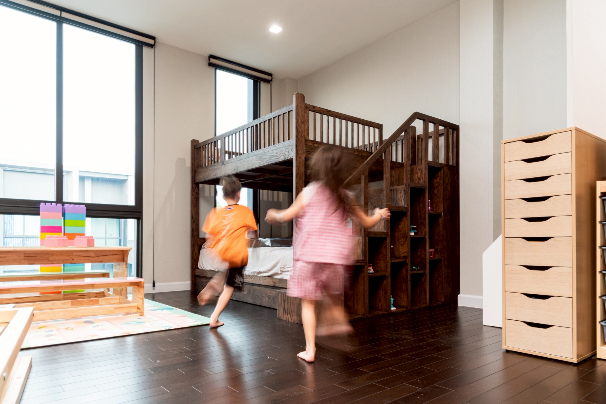 This bunk bed for kids is crafted from white ash stained in a darker tone, highlighting the wood grain for a warm, textured look. The frame is built solidly with safety in mind, featuring wide steps with a handrail so children can climb up and down comfortably and confidently. The staircase includes hidden storage, and there’s additional storage under the bed for toys, books, or personal items. It’s a thoughtfully detailed piece that looks great, makes efficient use of space, and grows with your child.