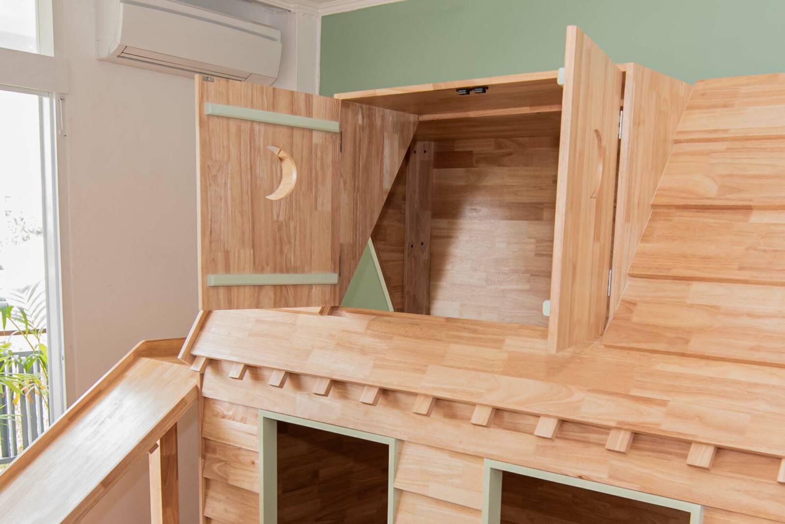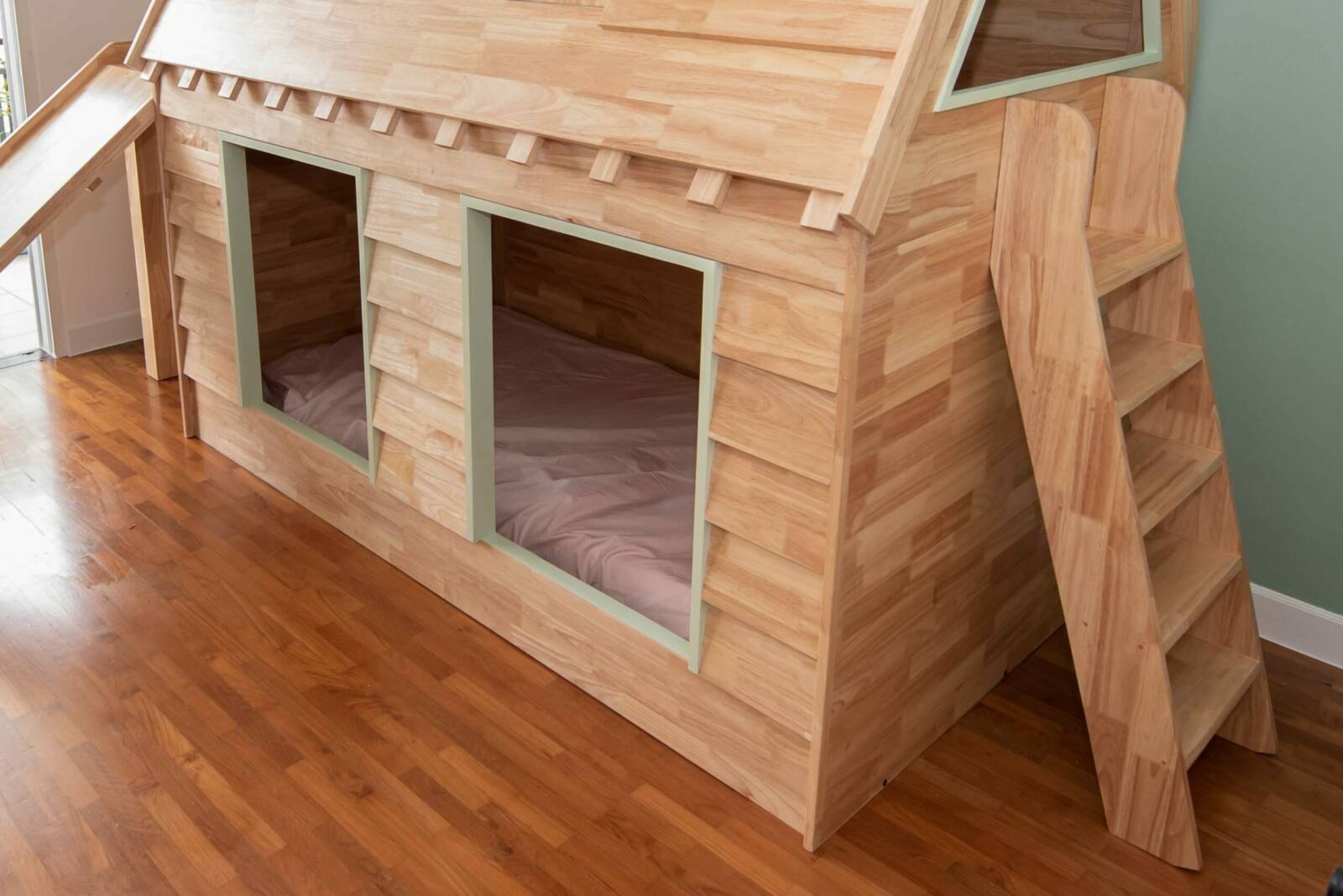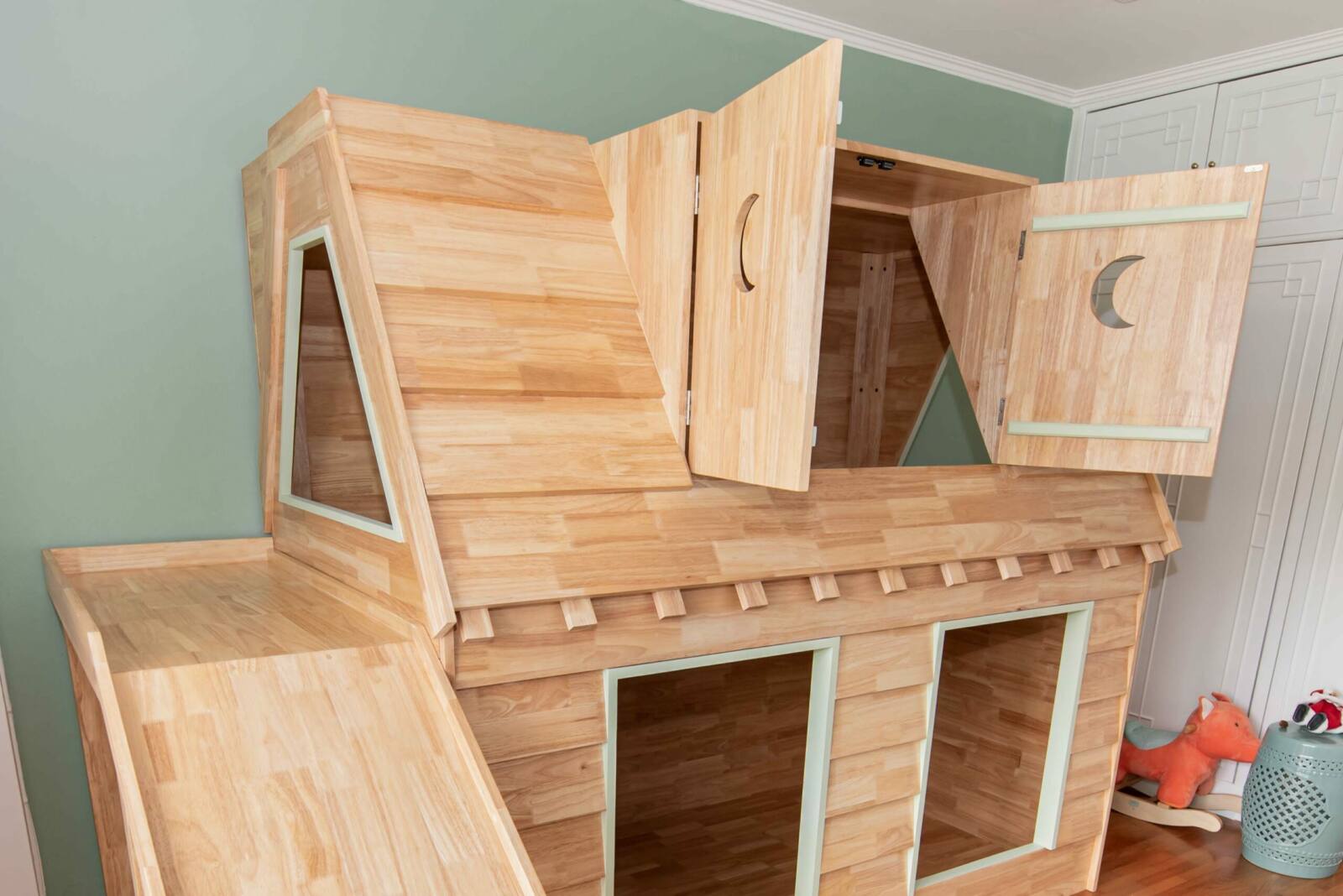 Immerse your child in endless fun and comfort with our solid wood bed and play area. Featuring a unique housetop style with an enclosed structure, this bed offers a combination of whimsy and security. The stairs and slide provide a playful way for your child to access the upper level, while the unique doors add an element of surprise and imagination. Customize the design, dimensions, and child-safe color options to create a personalized haven that fosters creativity, exploration, and blissful dreams.