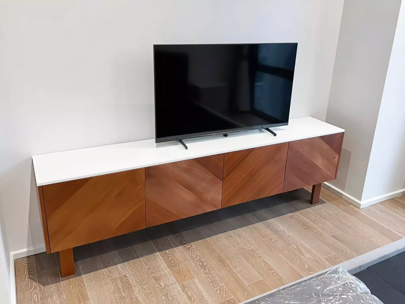 Add a touch of sophistication to your entertainment area with our solid mahogany TV console. This stunning piece features plenty of cabinet space to store all your media devices, while stylish cabinet handles add an elegant touch to the overall design. With customizable dimensions, wood type and color, you can create a personalized TV console that fits your unique taste and space needs, with a pristine white top providing a sleek finishing touch.