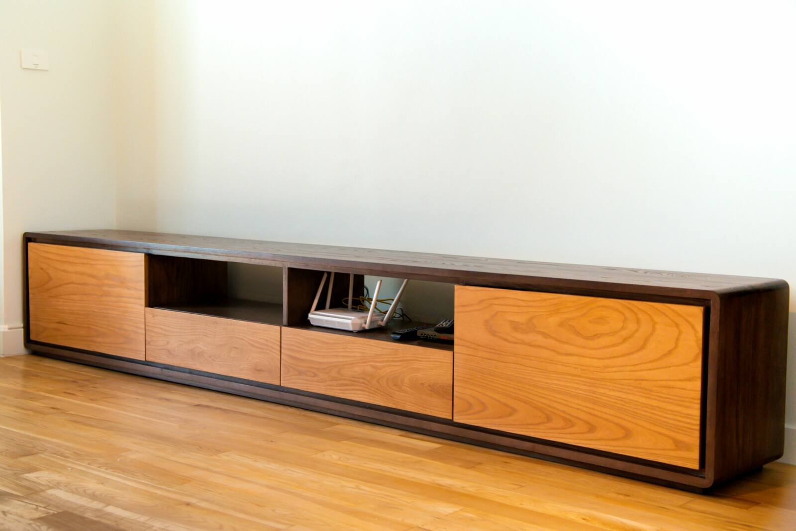 Indulge in the beauty of our custom-crafted solid ash TV console, meticulously designed for both functionality and style. With spacious storage areas, this console provides ample room to keep your media devices and accessories organized. The combination of two different wood finishes adds a touch of style, while the customizable dimensions, colors, and wood types allow you to create a console that perfectly suits your space and reflects your personal taste.