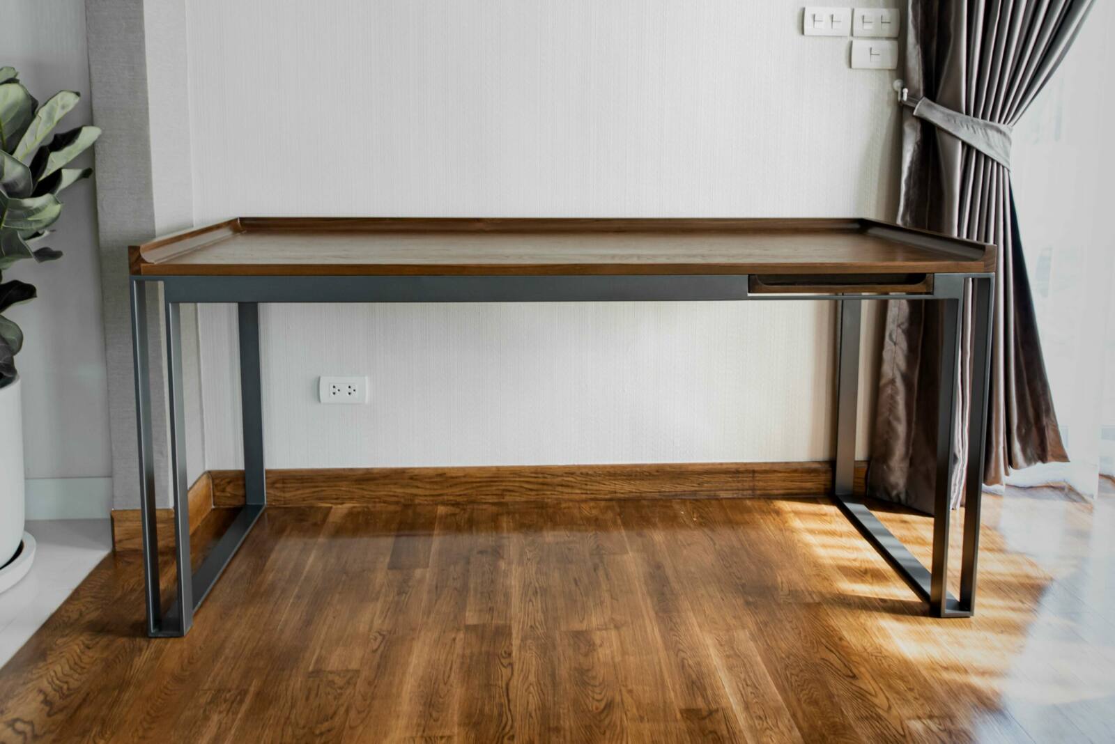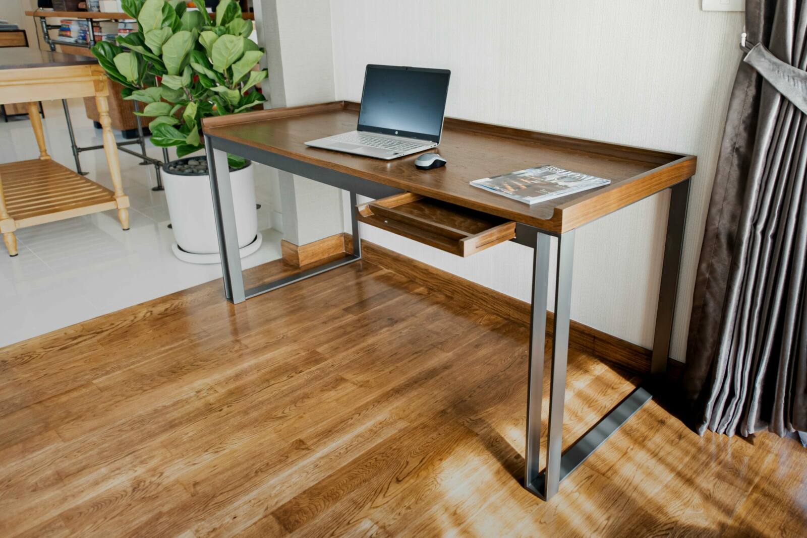 Discover the perfect addition to your workspace with our versatile desk. Featuring a stunning teak wood top and a sturdy steel frame and legs, it combines elegance and durability effortlessly. The slim drawer provides convenient storage, while the customizable options for wood types, finish, dimensions, and even steel powder coated color allow you to create a desk that reflects your individual style and needs.