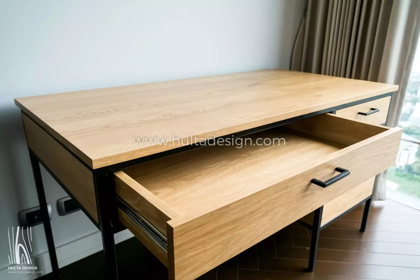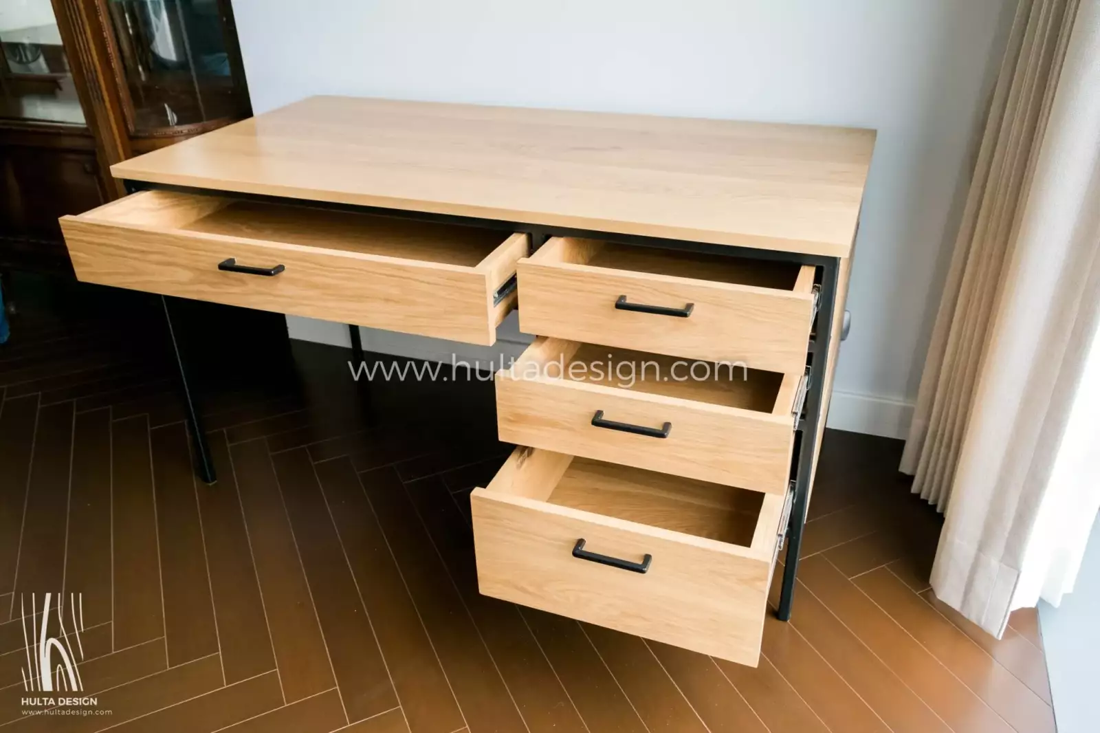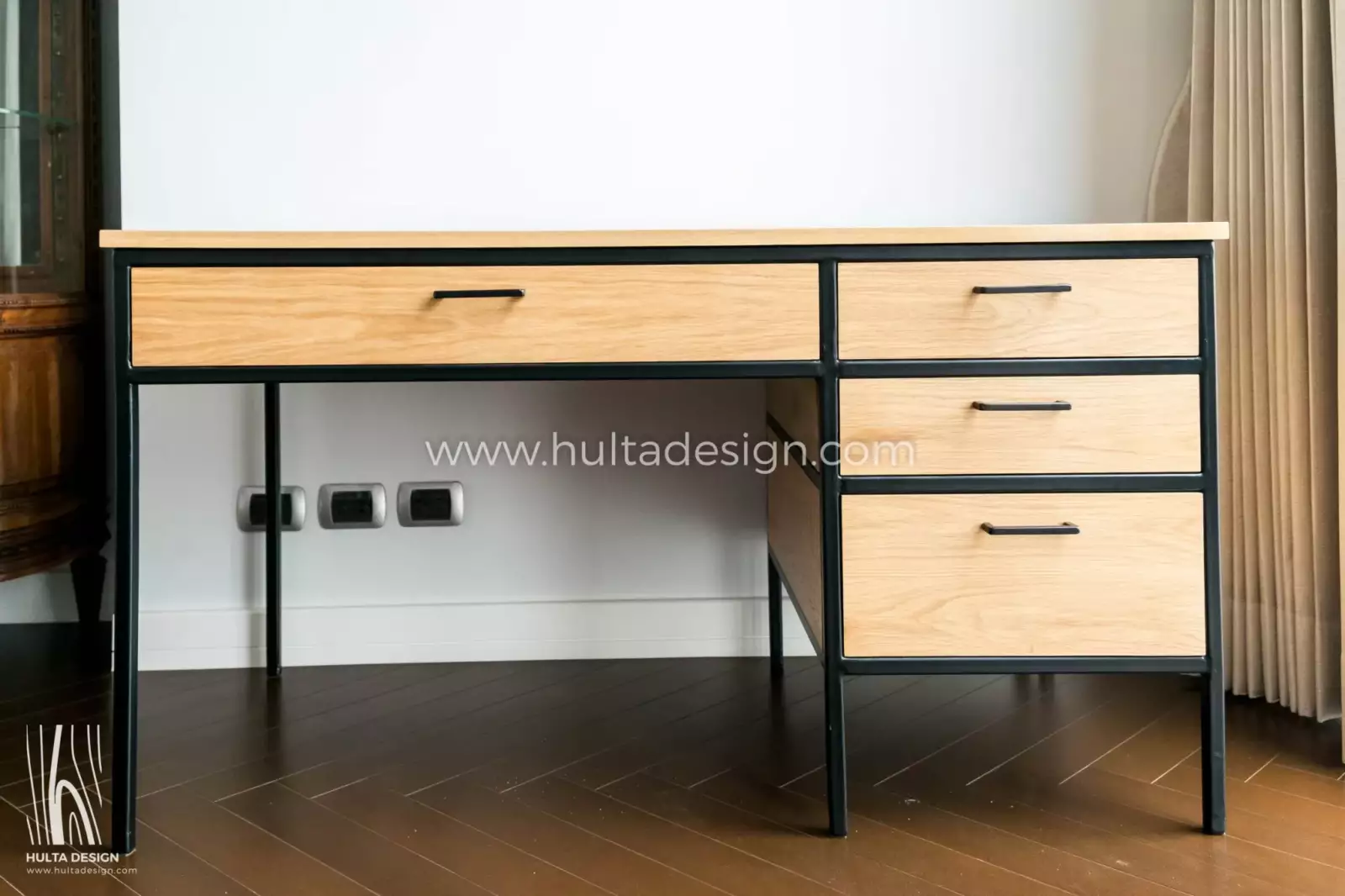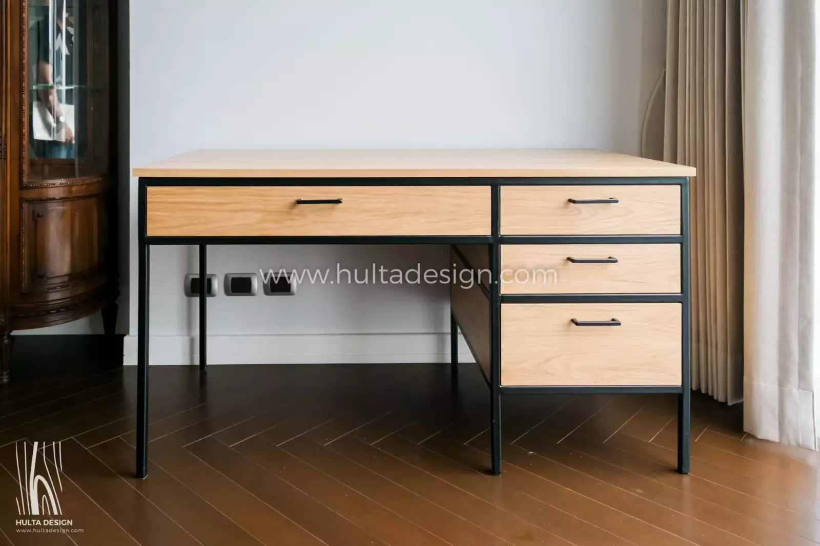 Experience the versatility and style of our wood and steel work desk. Featuring four drawers for convenient storage, and sturdy steel legs and frame. This desk combines functionality and contemporary design flawlessly. Customize the wood types, finish, and dimensions to create a personalized workspace that reflects your unique style and organizational needs.