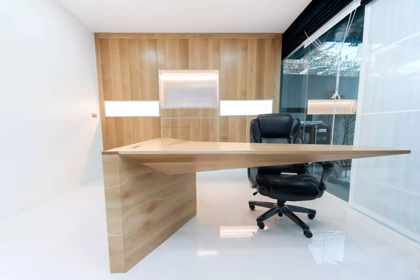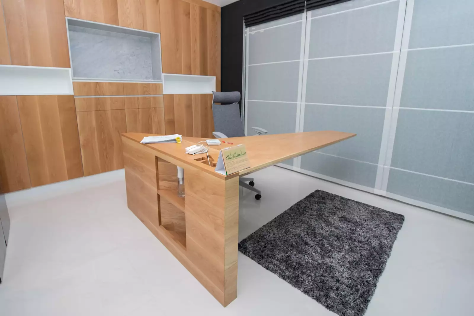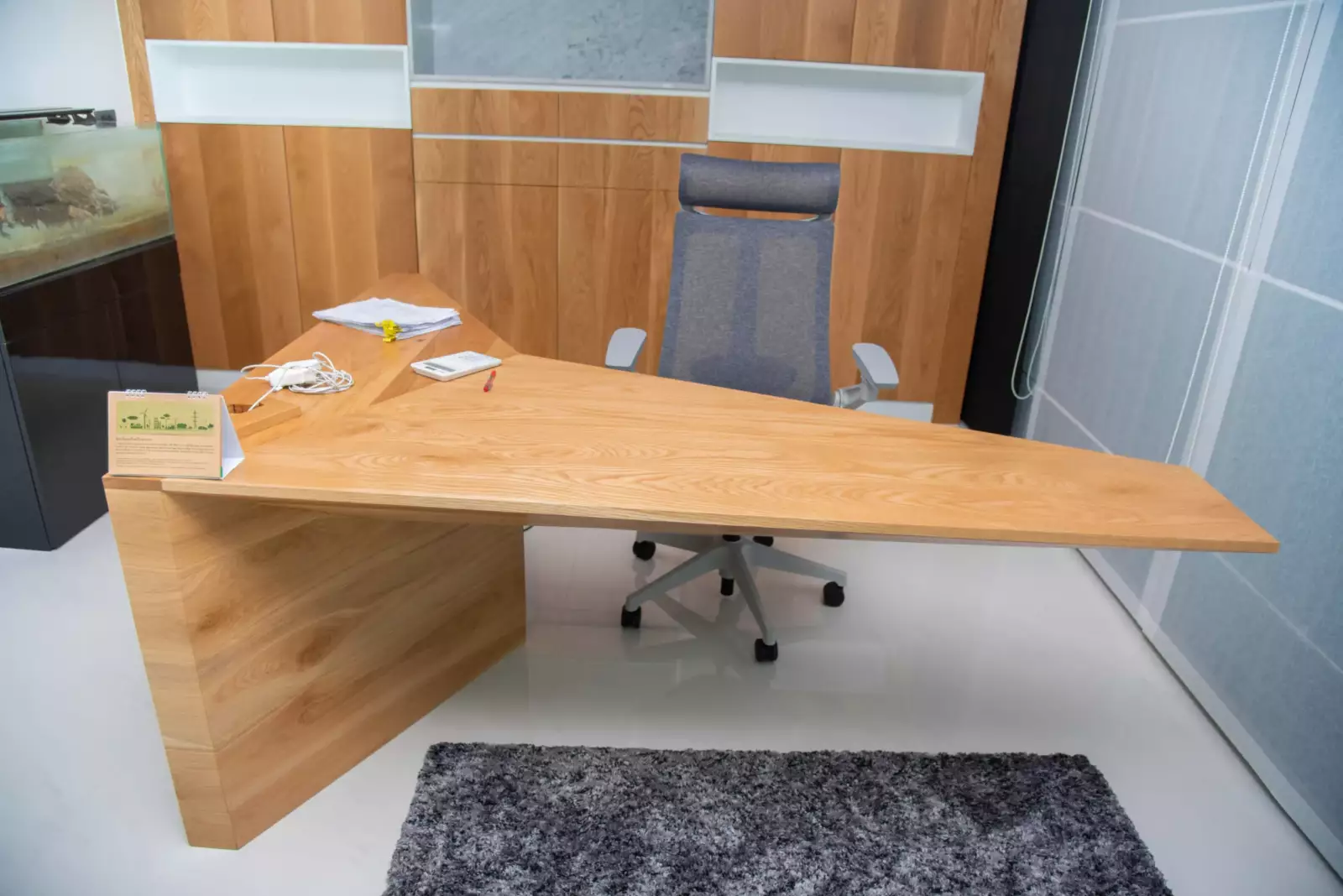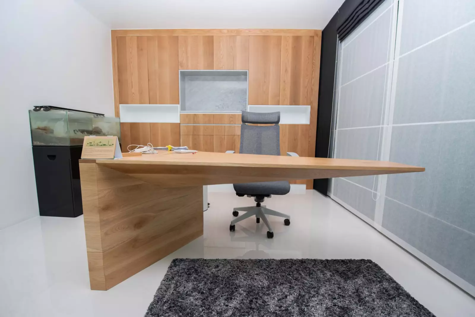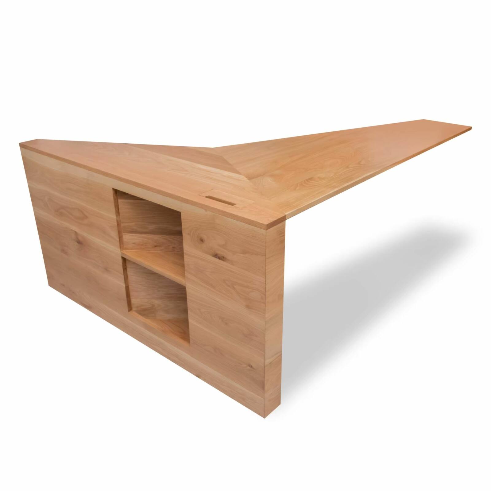 American oak. Experience ample storage space with cleverly built-in cabinets and shelves, keeping your workspace clutter-free and organized. Designed to fit perfectly into your living space, this desk offers customizable options for wood type, wood finish, dimensions, and design, ensuring a personalized piece that seamlessly blends functionality and style into your home.