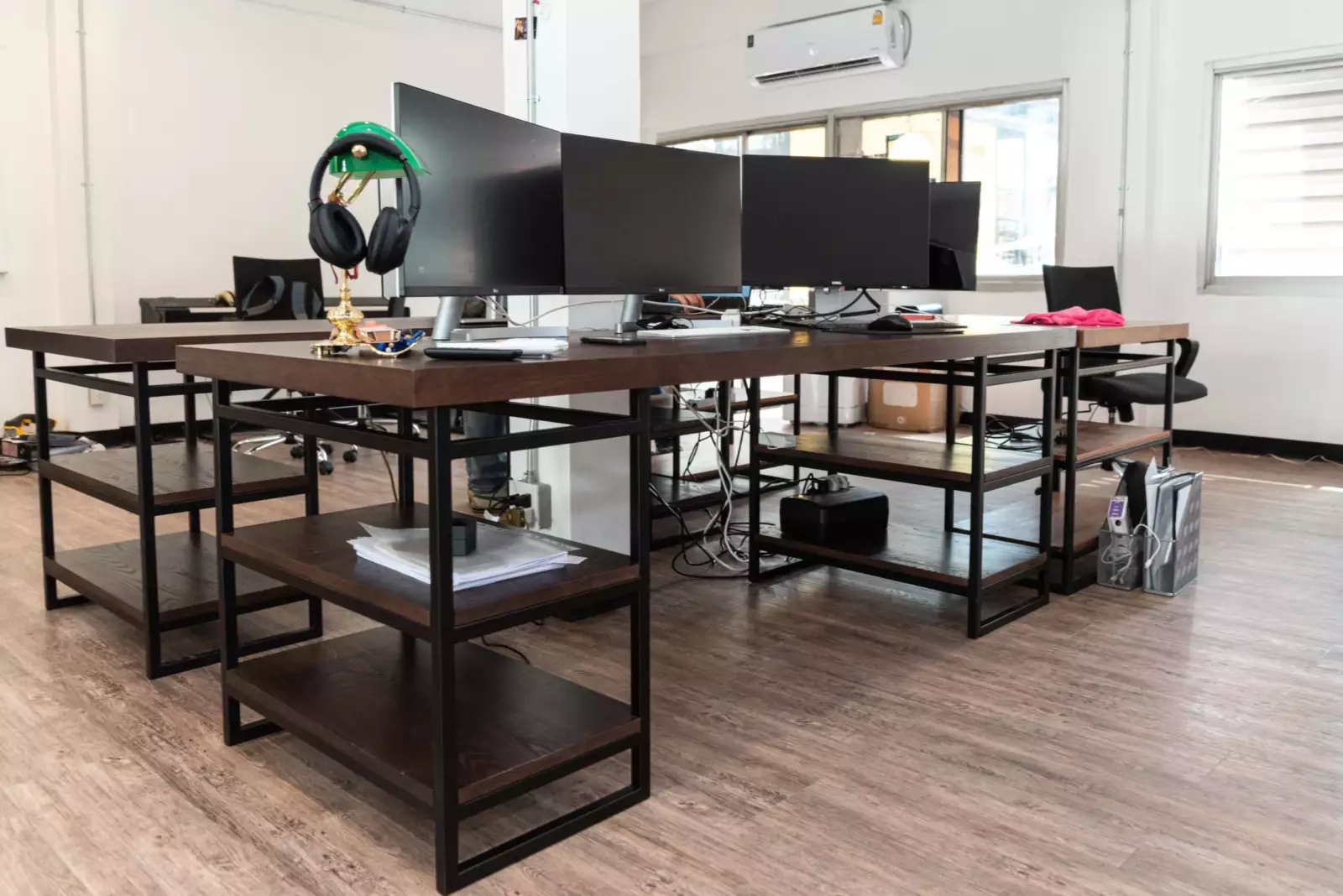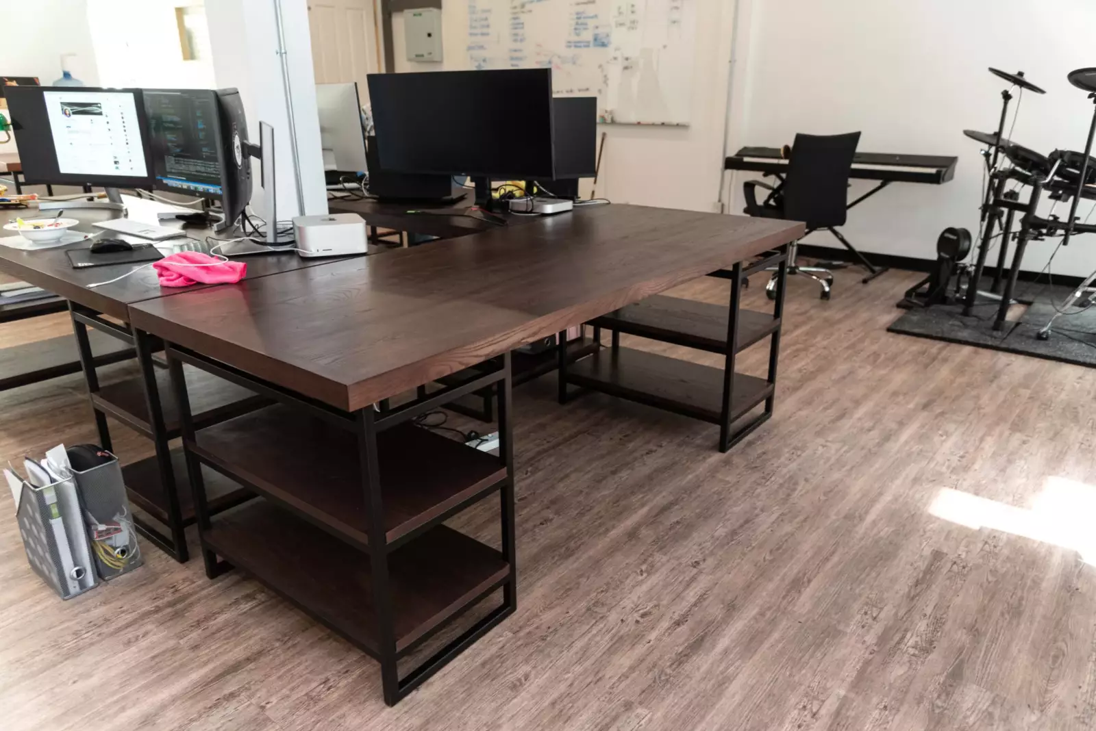 Enhance your workspace with our stunning solid wood desk, meticulously crafted from dark-stained American ash. The thick table top and four shelves provide ample storage and display space, while the sleek steel frame and legs ensure durability and a contemporary look. With customizable options for wood type, wood finish, colors, dimensions, design, and even the steel powder-coat color, you can create a personalized desk that perfectly suits your style and productivity needs.