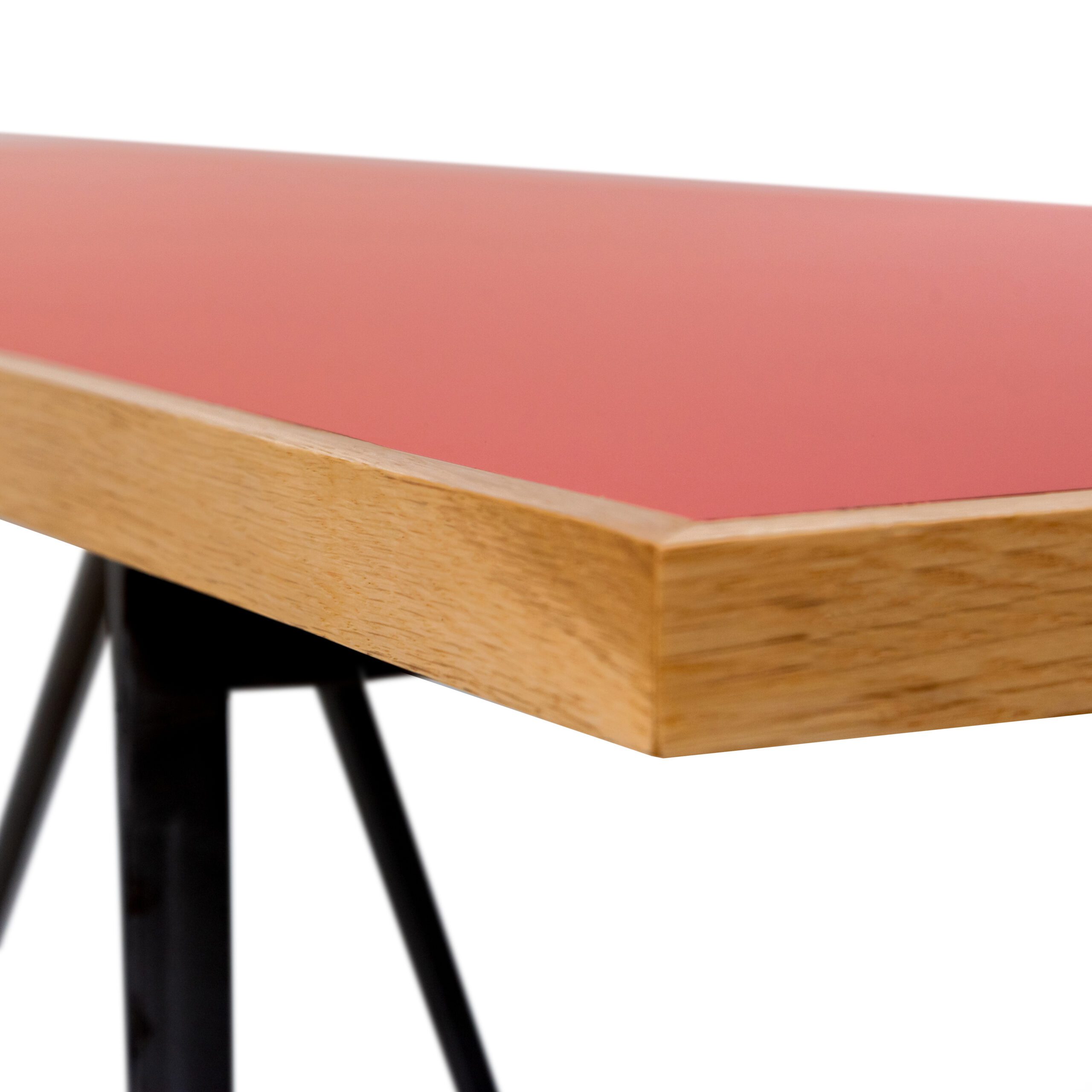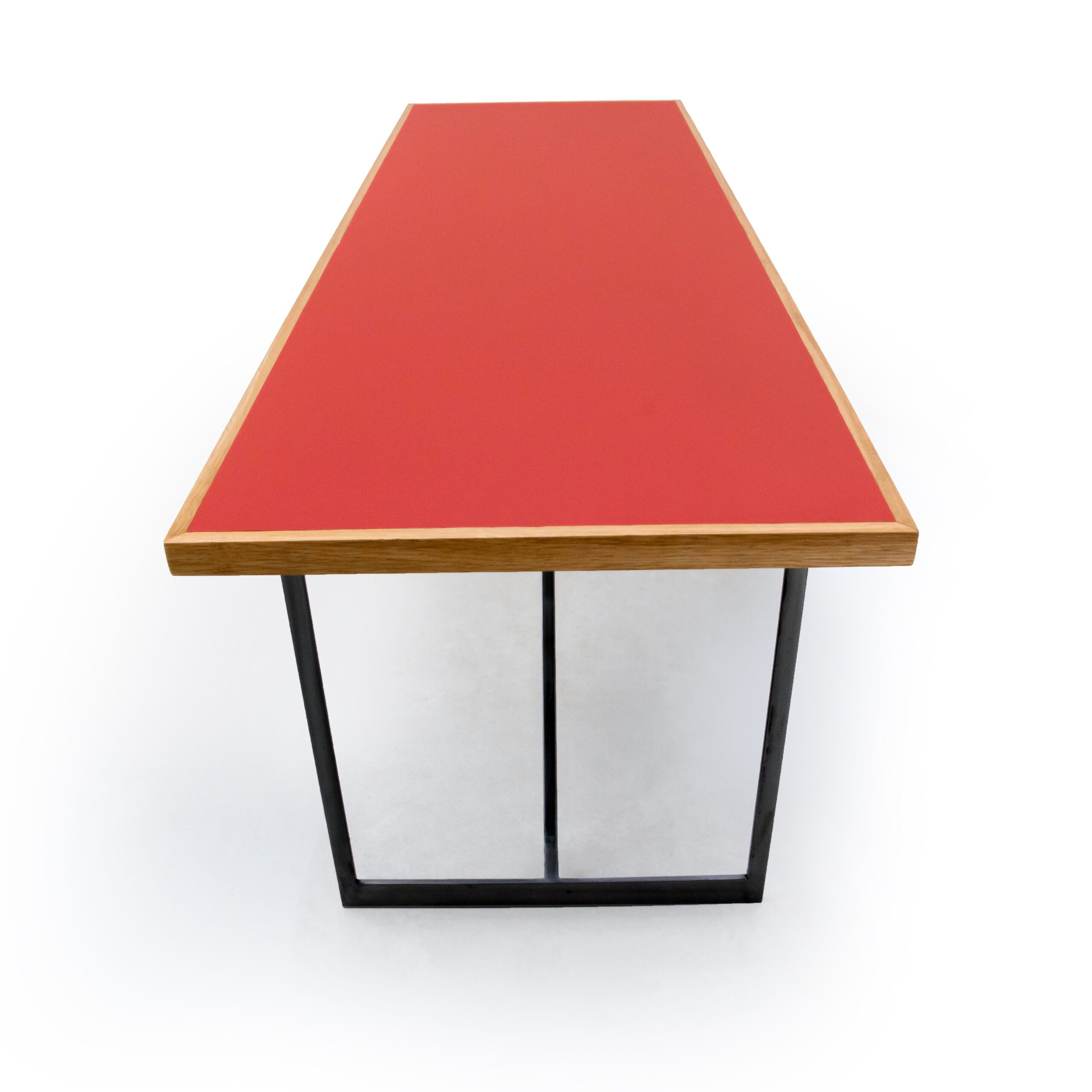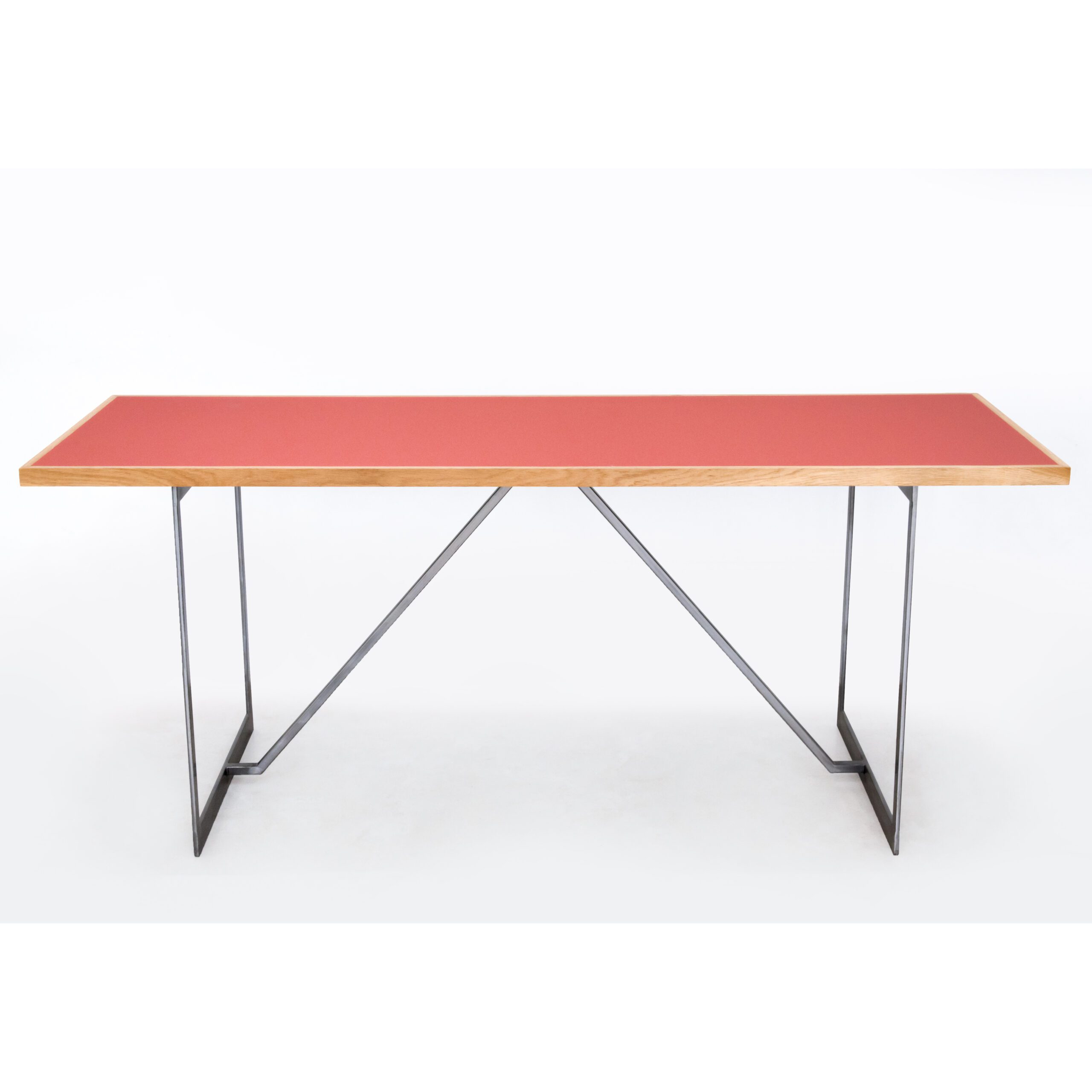 This striking contemporary table features a vibrant smooth red top framed by luxurious solid wood edging. Its robust geometric X-frame metal base ensures stability while making a bold visual impact. Perfect as a centerpiece in upscale offices or elegant dining spaces seeking bespoke style.