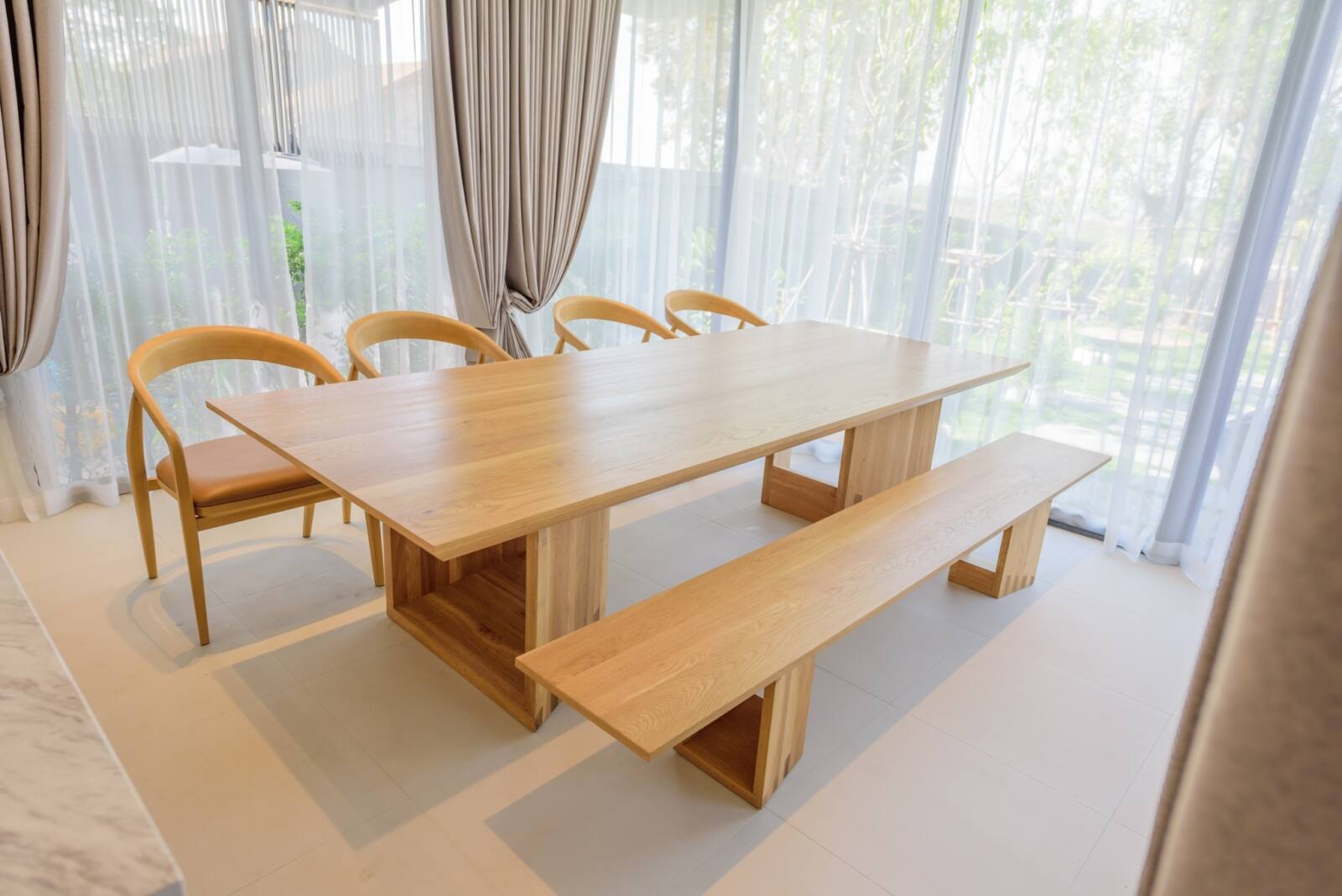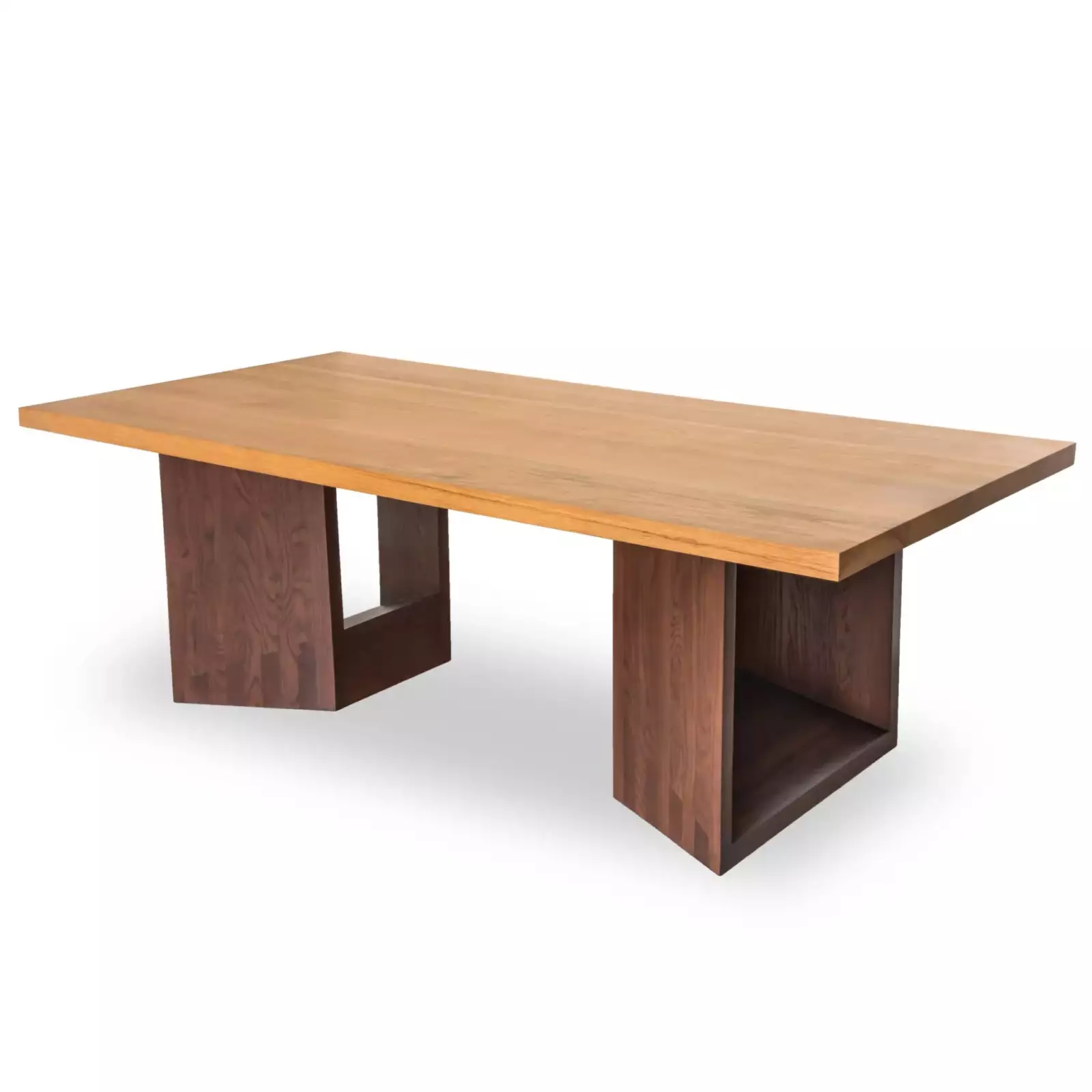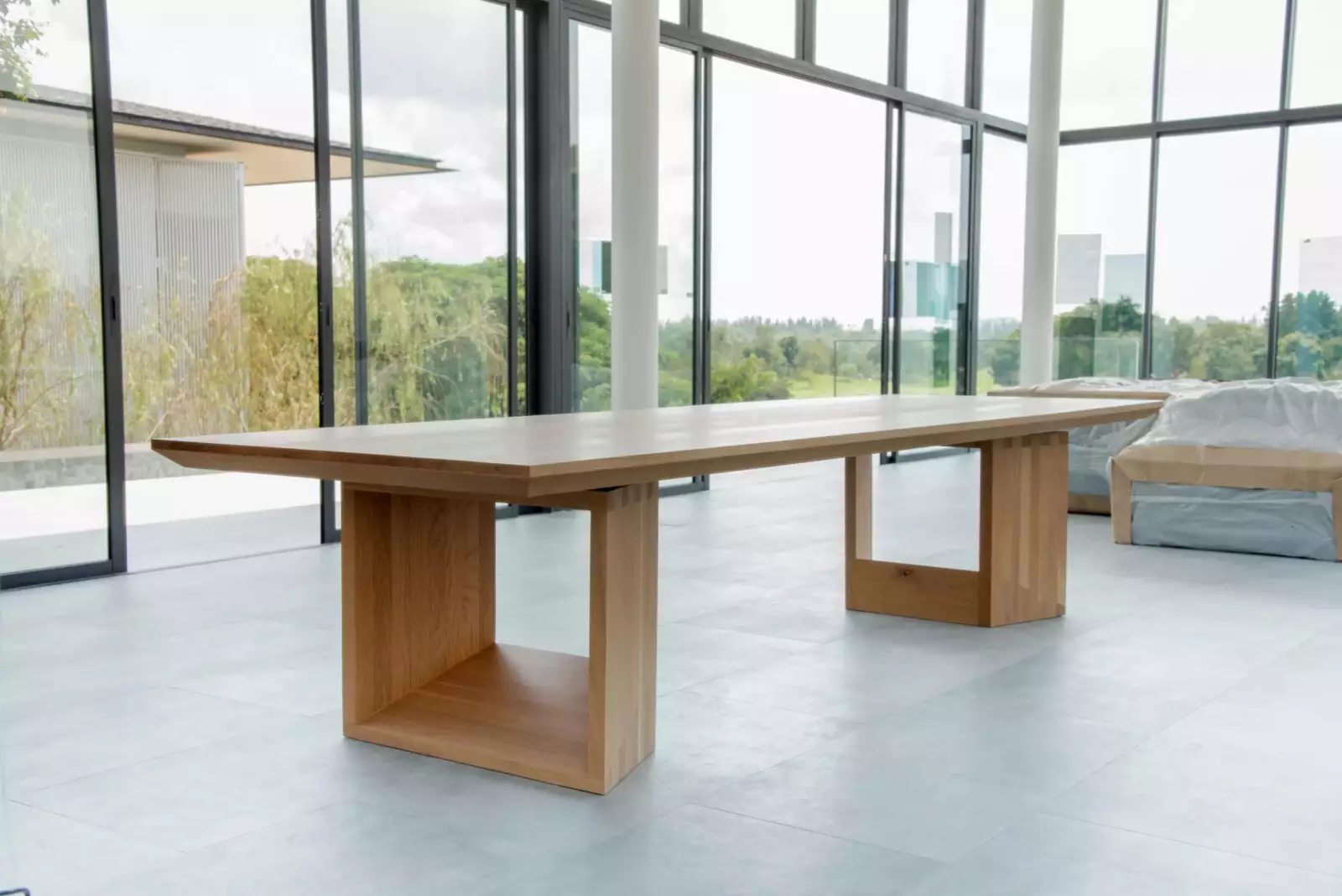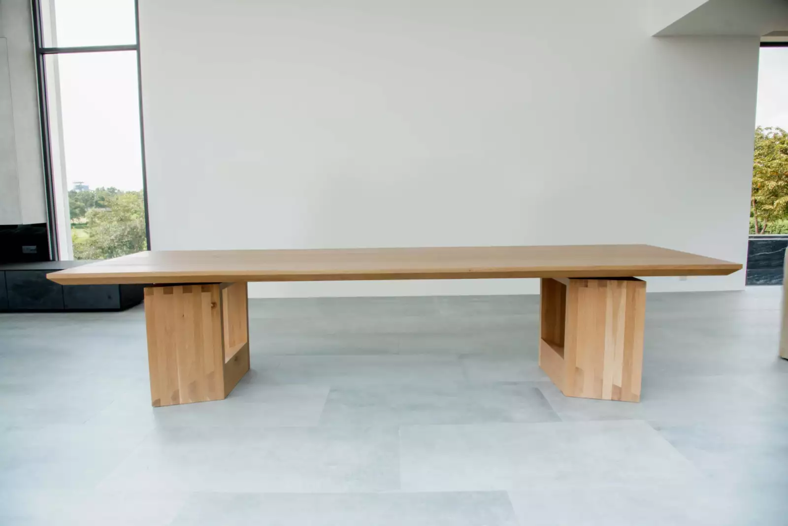 Introducing our exquisite solid wood dining table, expertly crafted from the highest quality American oak, complete with a striking thick solid oak leg design. Embrace the freedom to customize every aspect of your dining table, from the design, wood type, and wood finish to the dimensions, allowing you to create a one-of-a-kind centerpiece that seamlessly blends with your unique style and space. This table is not only a functional piece but also a work of art that will elevate your dining experience with its timeless beauty and undeniable durability.