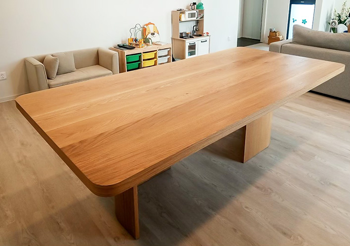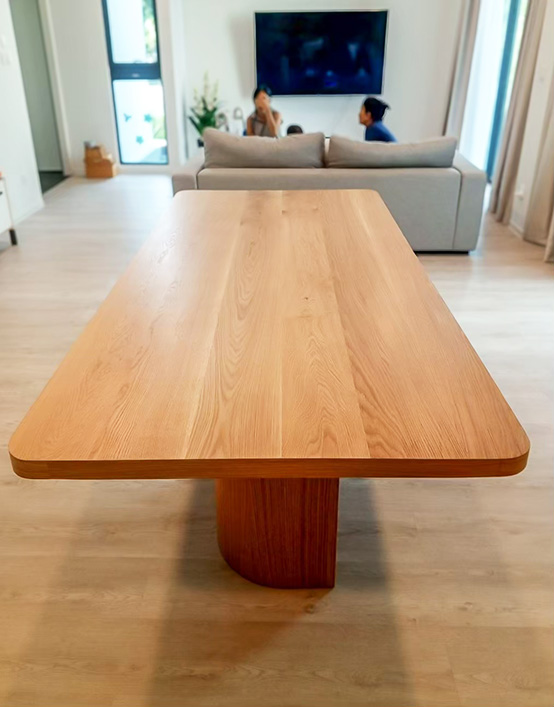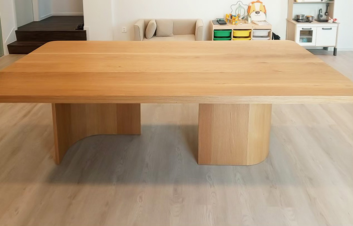 Introducing a stunning white oak table featuring elegant curved legs and a gently curved