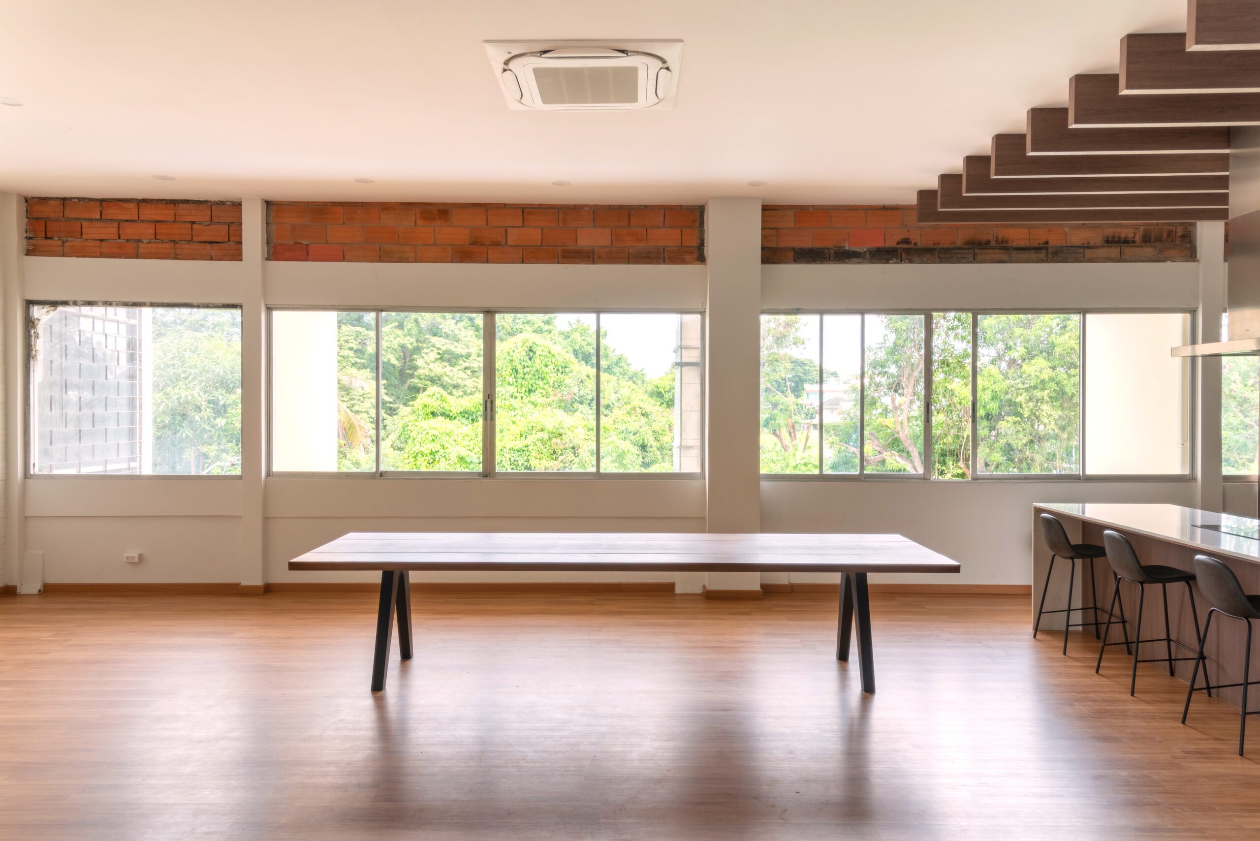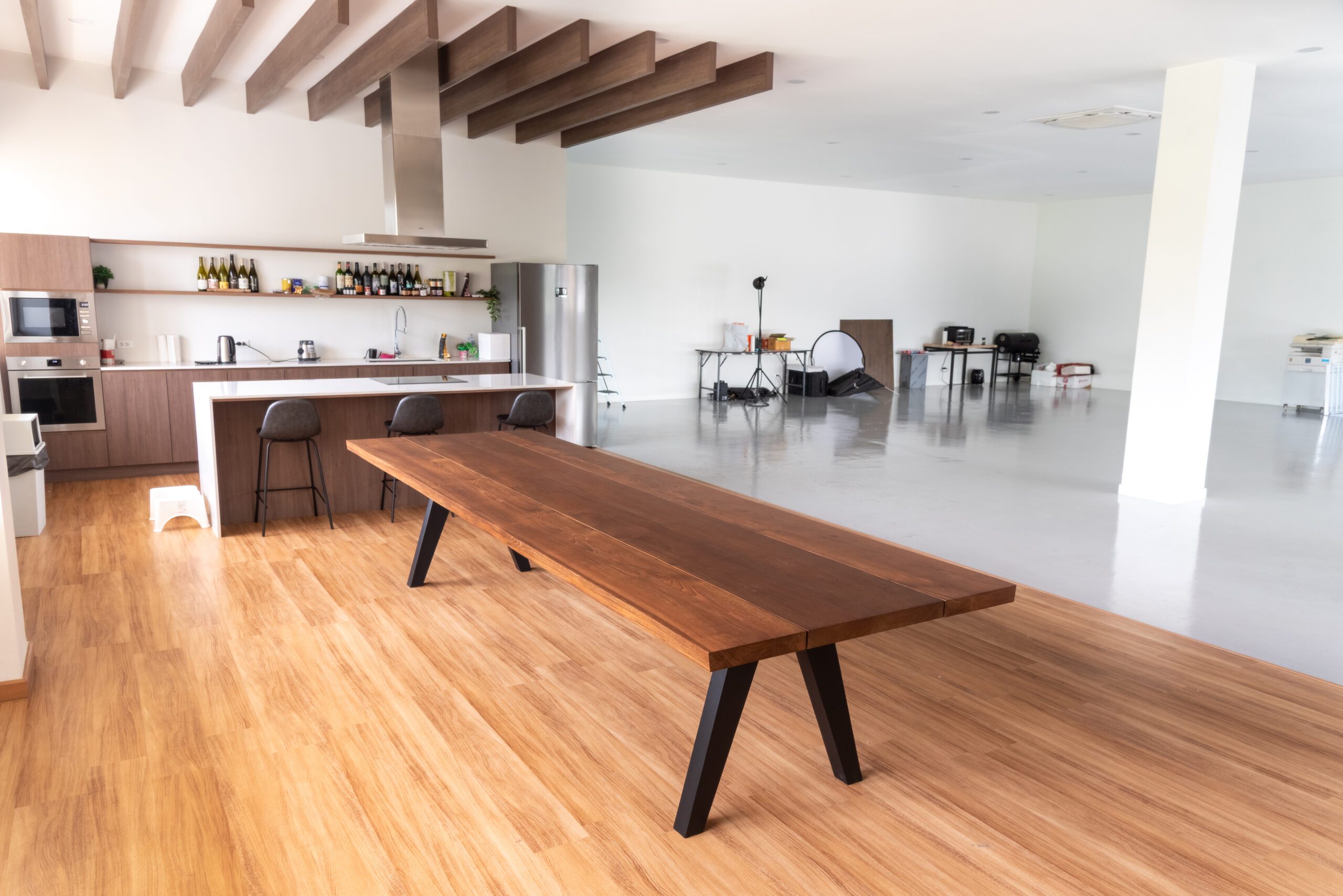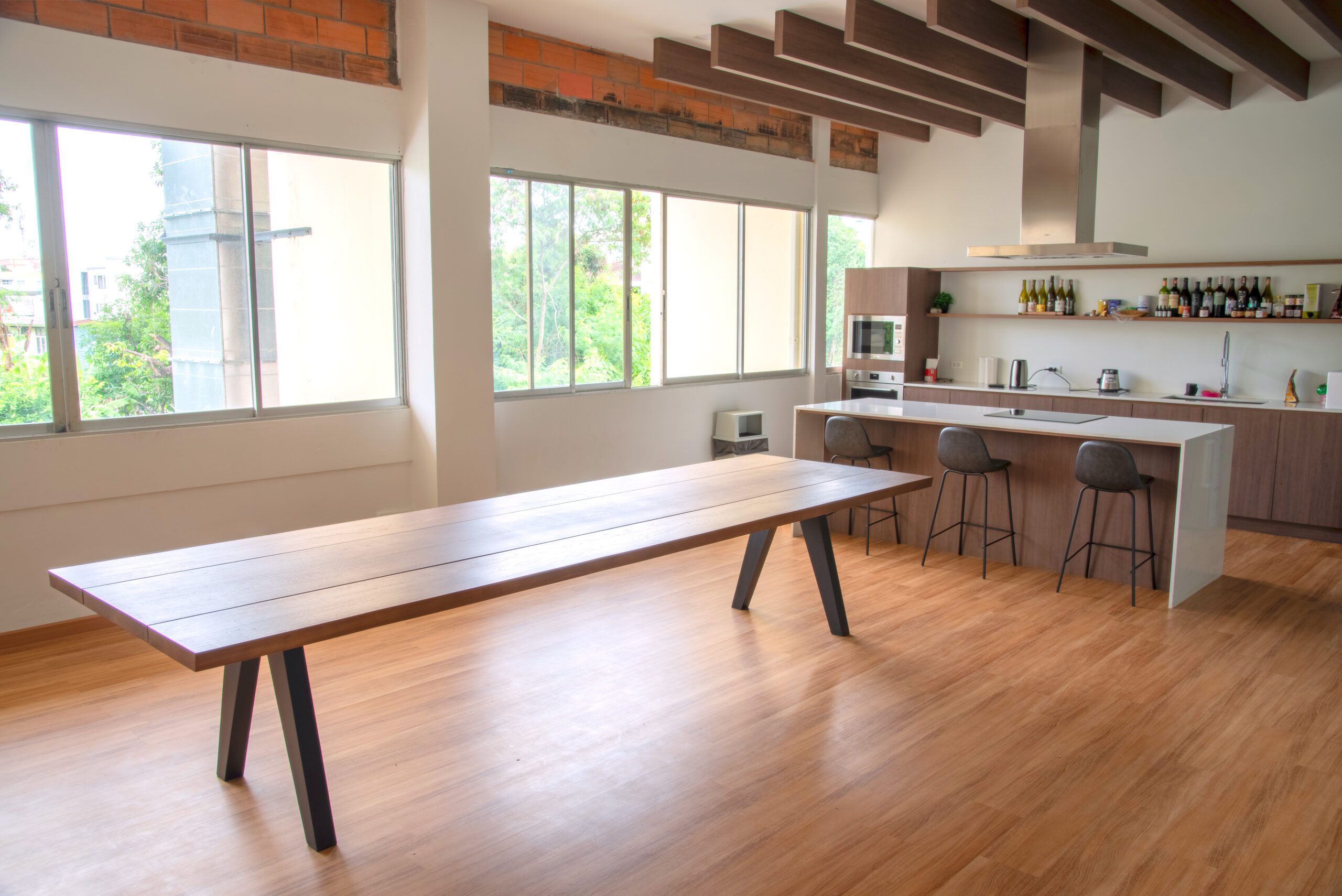 Experience the natural beauty seamlessly blended with contemporary industrial design. This table features a premium teak wood top showcasing warm, distinctive golden-brown tones, supported by sleek black matte metal legs with angled edges. Combining strength and sophistication, it perfectly completes dining rooms or executive meeting spaces with its timeless, modern appeal and durability.