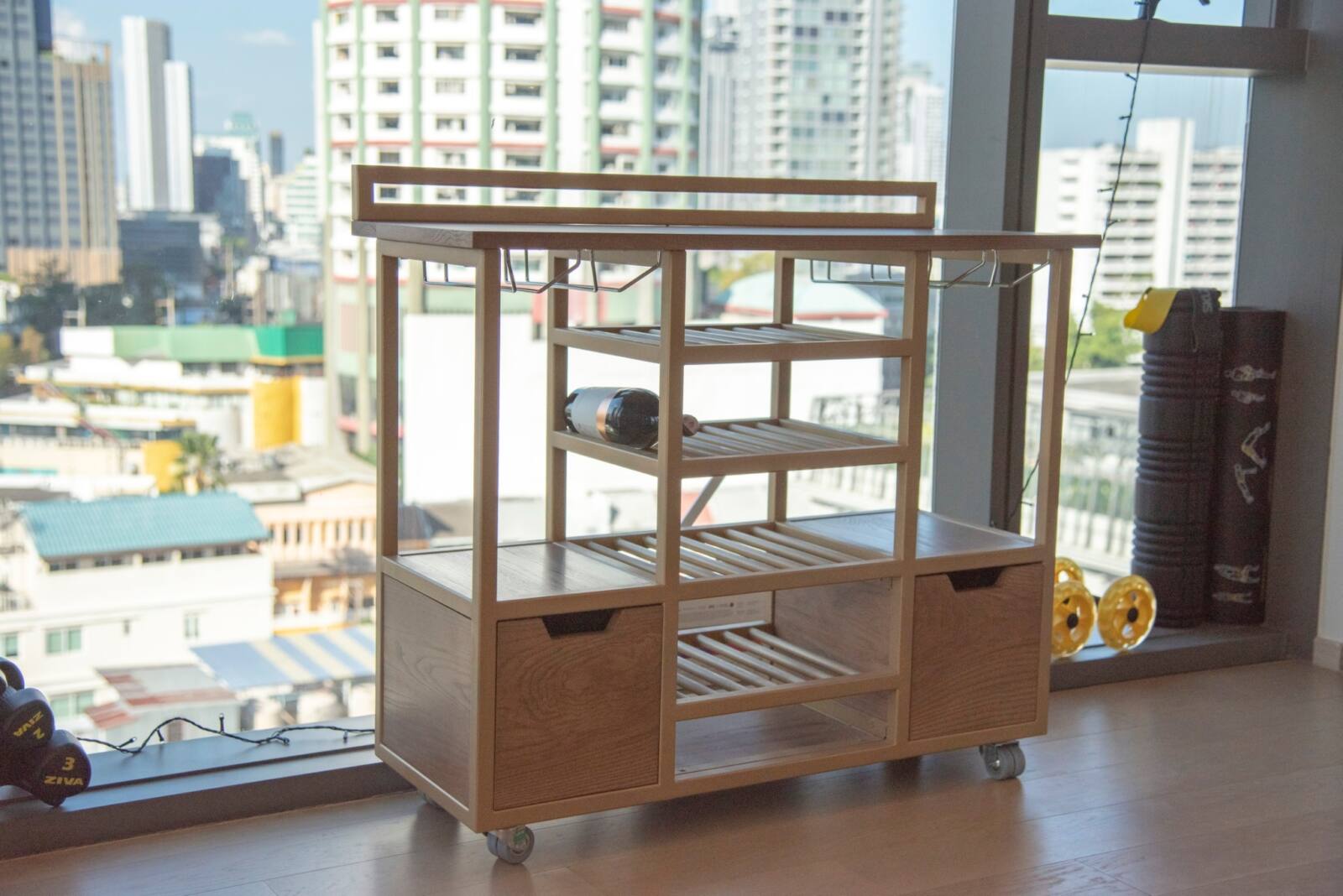 Experience convenience and flexibility with our portable shelving unit, equipped with wheels for easy mobility. This versatile unit combines the durability of powder-coated steel with the natural beauty of American ash wood, creating a harmonious blend of materials. With a customizable design that allows you to choose the wood type, wood finish, steel powder-coated colors, and dimensions, you can personalize this shelving unit to fit your exact preferences and seamlessly integrate it into any space in your home