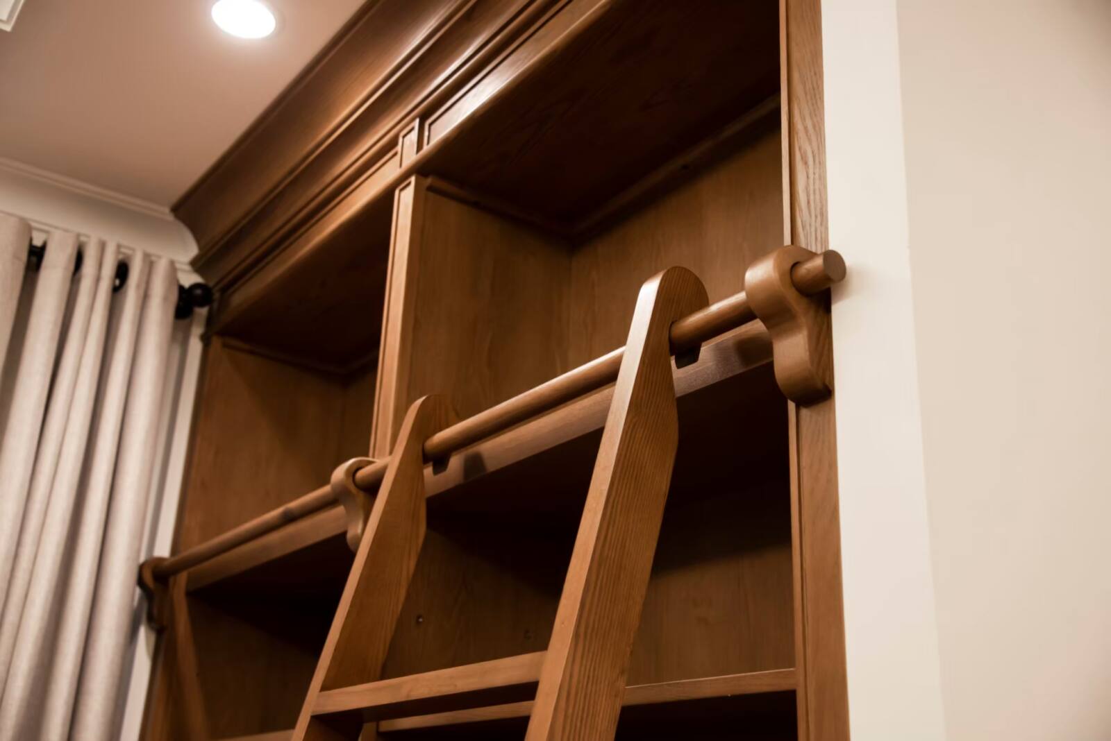 Enhance the functionality and elegance of your space with our built-in solid wood shelving unit, expertly crafted from premium American oak. This customizable shelving unit comes with an accompanying solid wood moveable ladder, allowing easy access to items stored on higher shelves. With options to customize the design, wood type, wood finish, and dimensions, you can create a shelving unit that seamlessly integrates into your surroundings while adding a touch of luxury and practicality.
