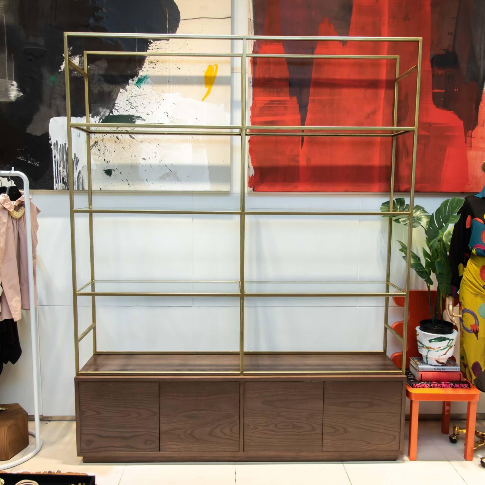 Experience the perfect blend of elegance and functionality with our multi-tiered shelf and cabinet unit, featuring a luxurious dark-stained American oak base and cabinets, accentuated by stunning gold powder-coated steel frames and glass shelves. The customizable design offers a selection of steel powder-coated colors, wood types, and finishes, allowing you to create a personalized piece that complements your unique style. With customizable dimensions, this unit can be tailored to fit any space, providing both storage and display options for a sophisticated and organized living space.