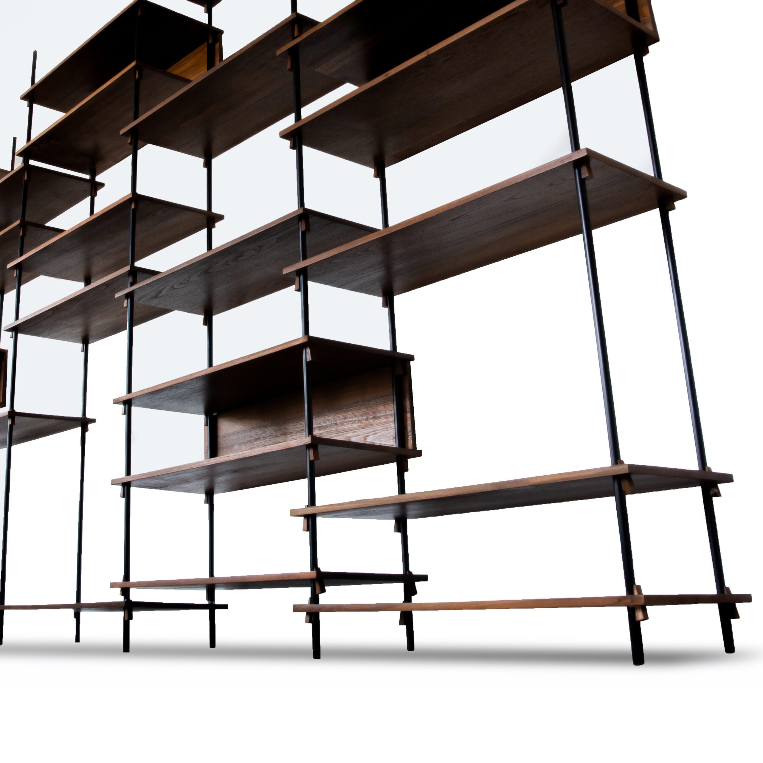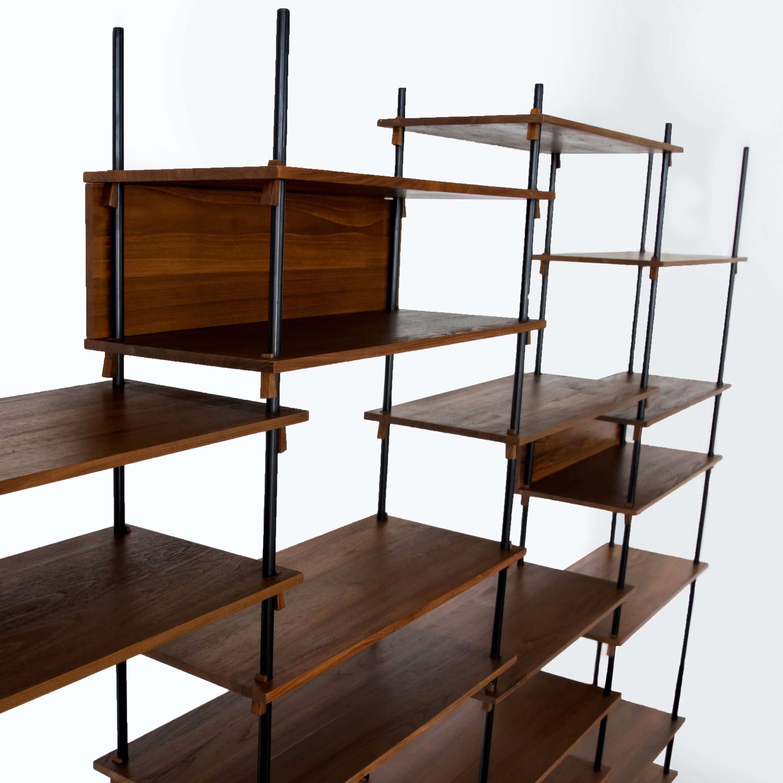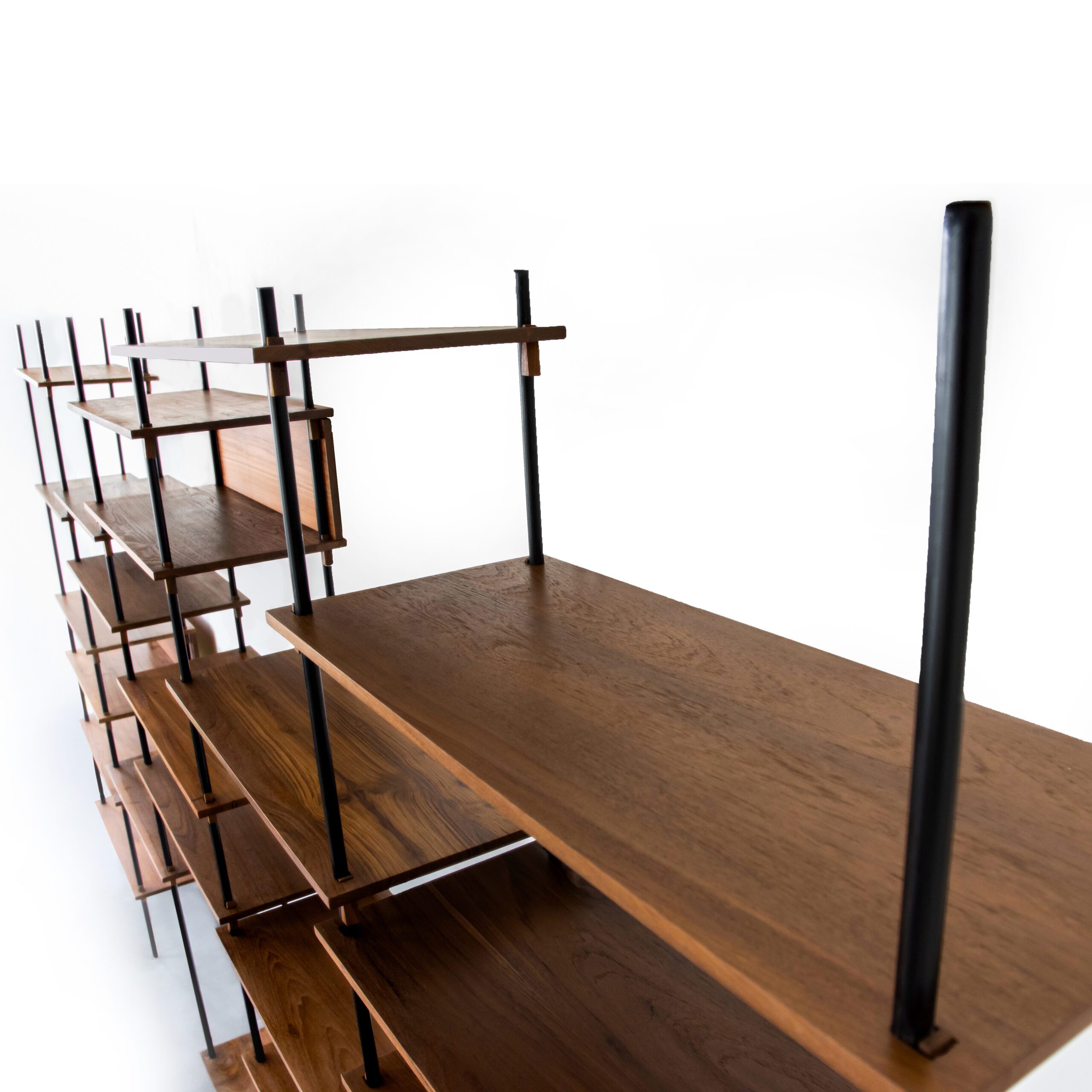 Embrace the charm of reclaimed teak with our stunning shelf unit, featuring a distinctive steel cylindrical base and legs that add a touch of modern industrial style. The unique rustic teak stabilizers not only enhance the visual appeal but also provide sturdy support for your displayed items. With a customizable design, you have the freedom to choose the wood type, wood finish, and dimensions, allowing you to create a truly personalized shelf unit that exudes character and fits perfectly into your space.