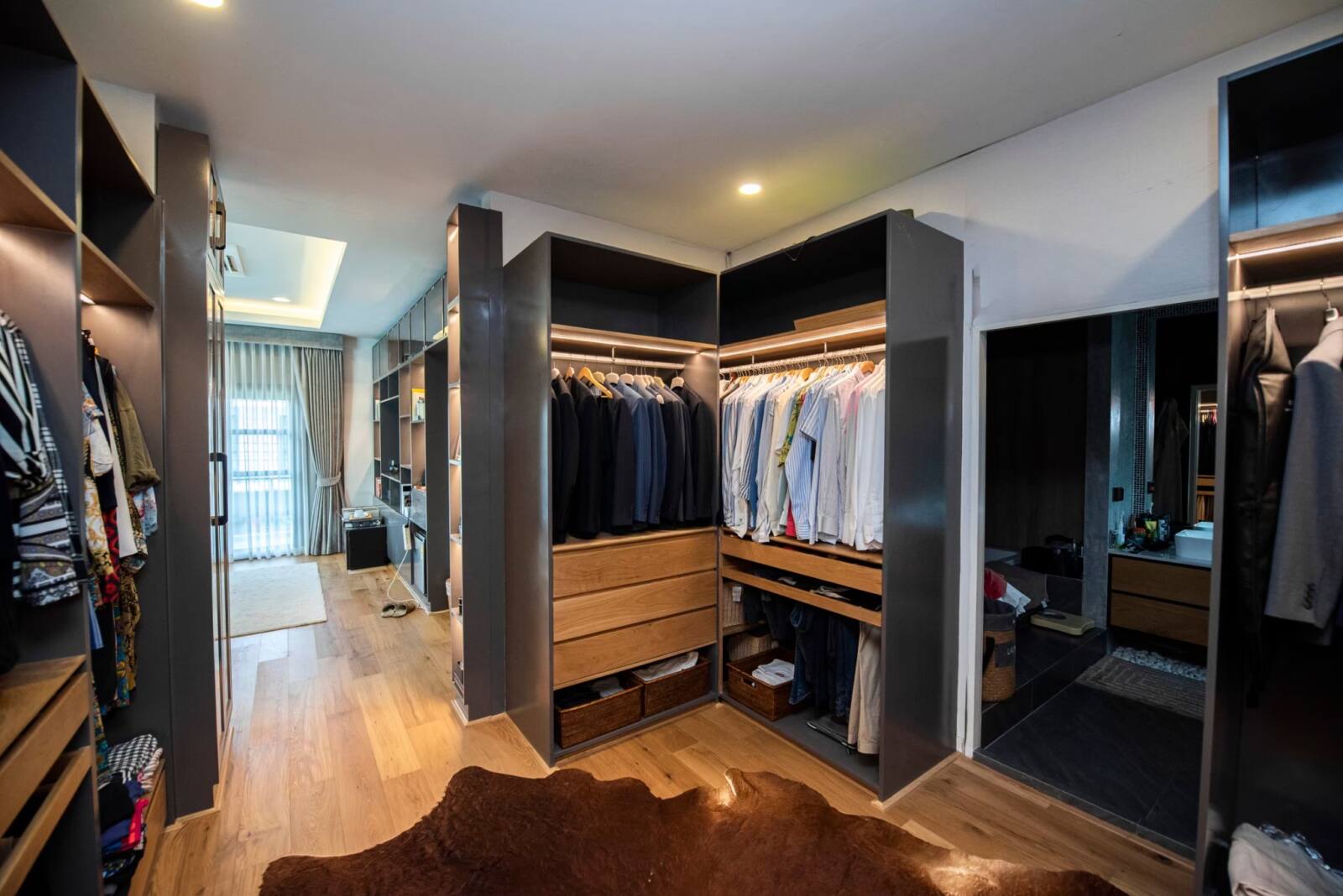 Step into the walk-in closet of your dreams with our customized solution. Featuring sleek glass doors, multiple tiers, and compartments, this closet offers endless possibilities for organizing your wardrobe and accessories. With customizable options for design, dimensions, and paint colors, you can create a personalized space that not only meets your storage needs but also reflects your unique style and taste.