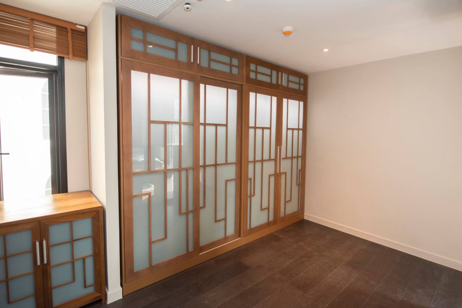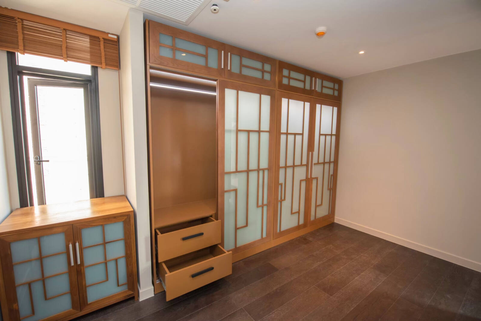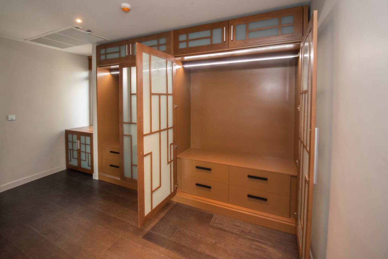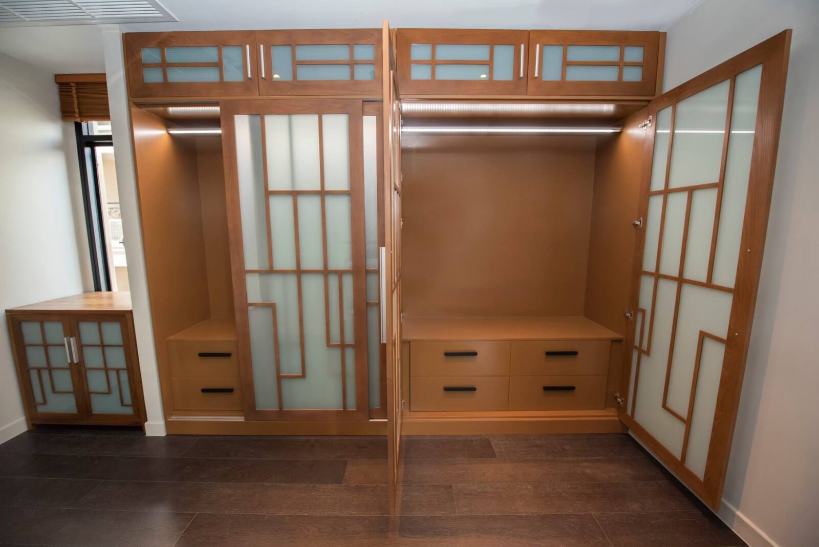 Experience elegance and innovation with our customized wardrobe, artfully crafted from solid American ash with tinted door windows, uniquely framed and adorned with exquisite woodwork. The sliding doors effortlessly glide to reveal a well-organized interior, illuminated by ambient LED lights that create a captivating atmosphere. With customizable options for dimensions, design, wood type, and wood finish, create a wardrobe that not only complements your space but also reflects your personal style, making a lasting impression.
