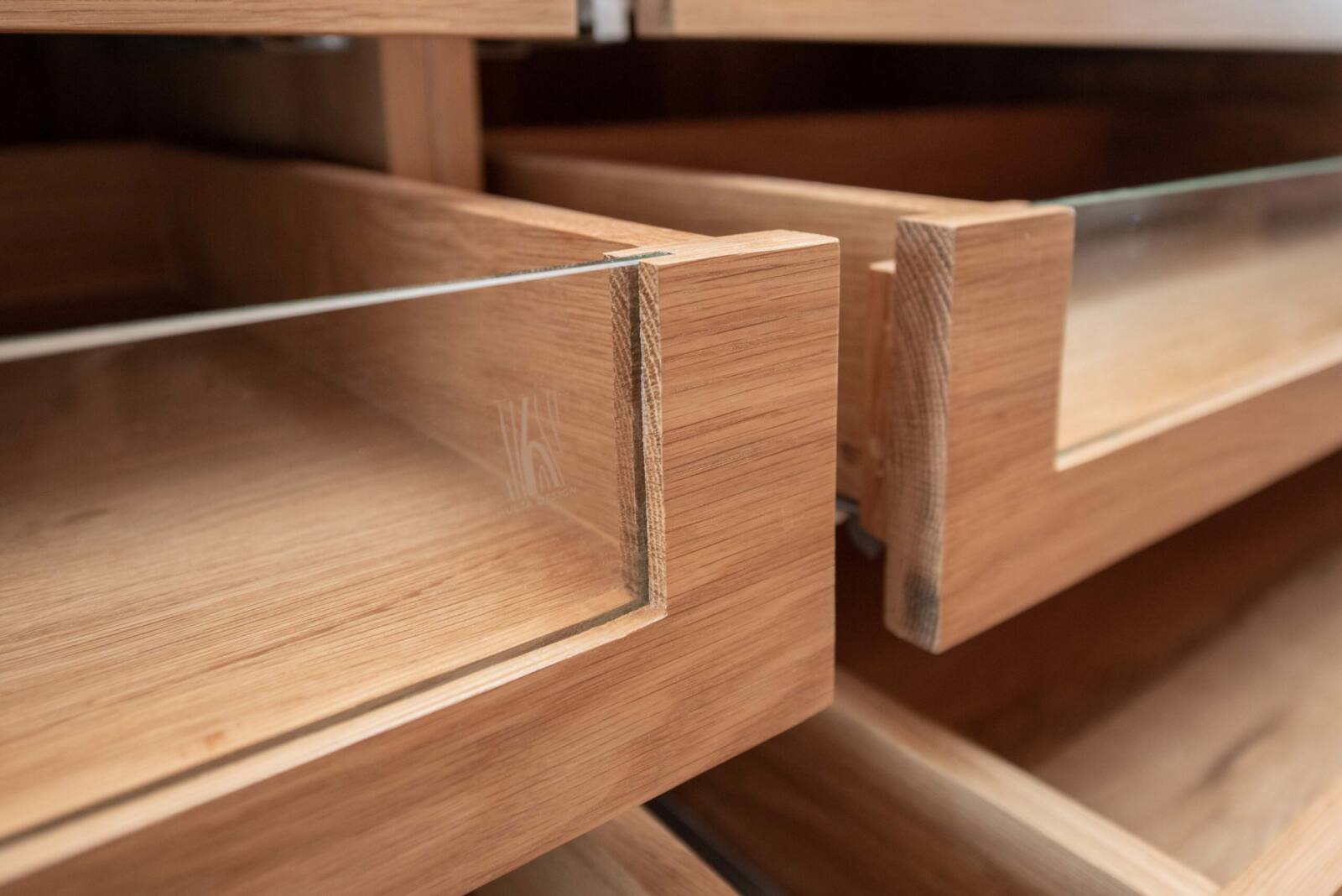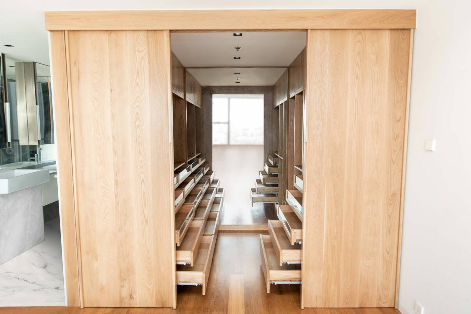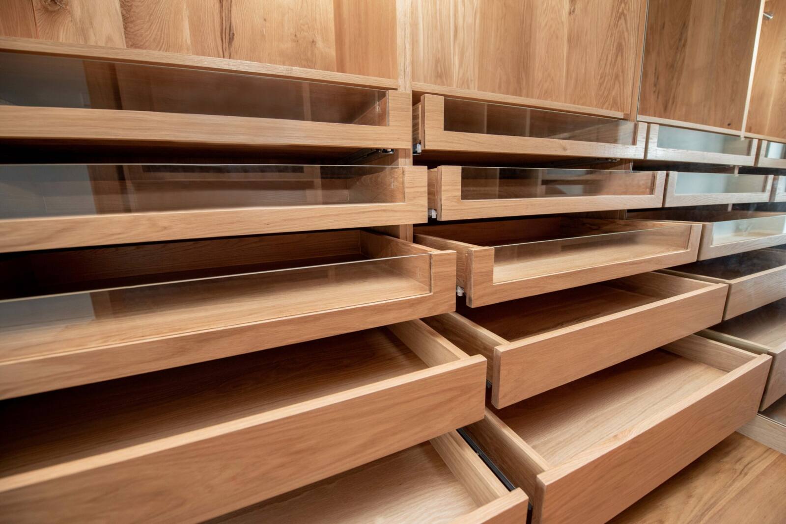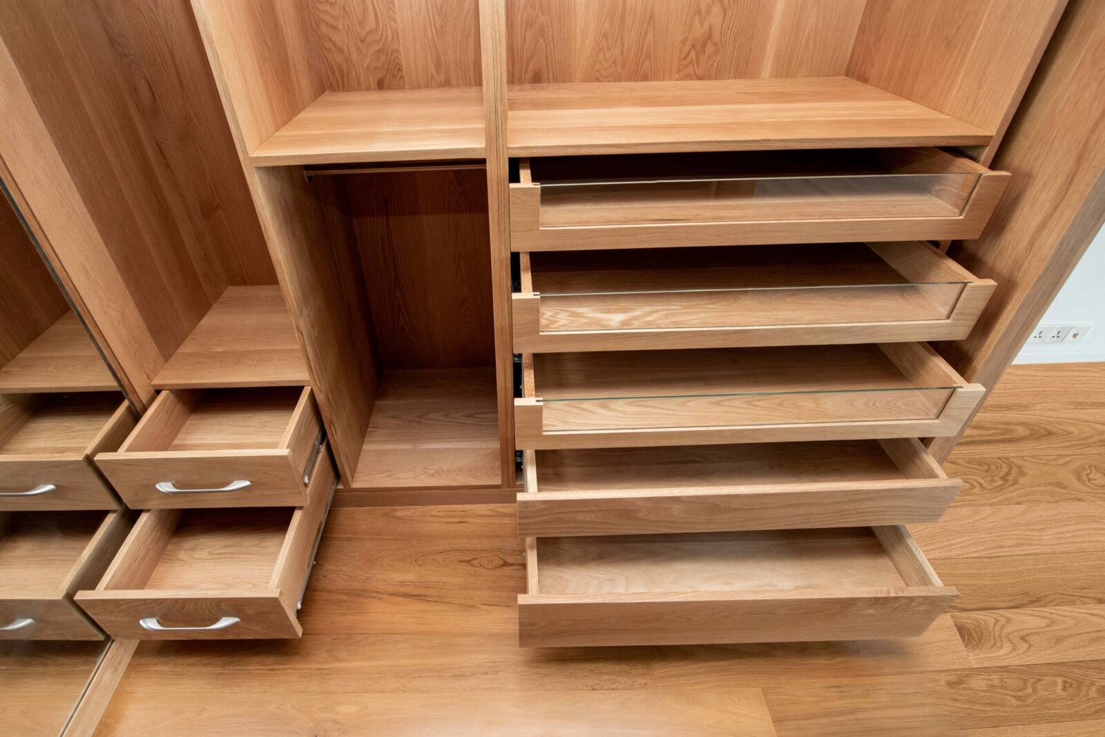 Organize your wardrobe in style with our solid wood walk-in closet, expertly constructed from premium American oak, offering ample space and multiple drawers, some with glass doors, perfect for showcasing your prized possessions. The closet is designed and built to fit perfectly in your home, adding sophistication and charm to any space. With customizable options for dimensions, design, wood type, and wood finish, create a walk-in closet that is uniquely suited to your needs and preferences.