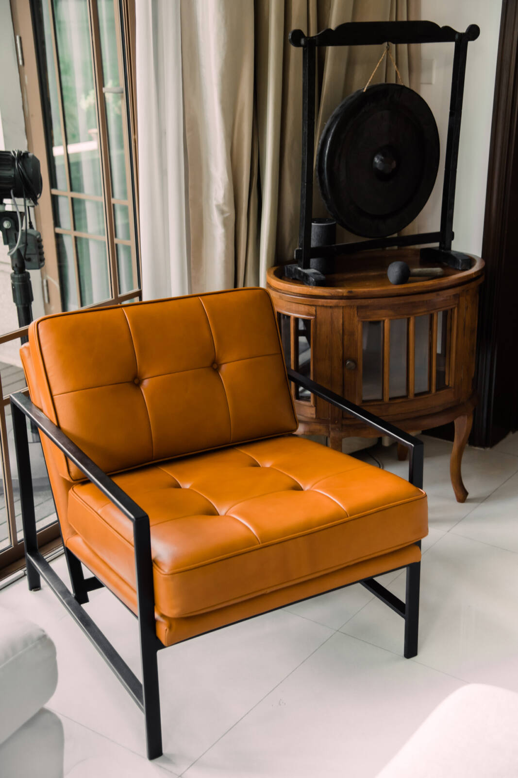 ผ่อนคลายบนอาร์มแชร์ตัวนี้เพื่ออ่านหนังสือหรือให้ความบันเทิงแก่แขก เบาะหุ้มหนังและโครงเหล็กทำให้อาร์มแชร์ตัวนี้มีสไตล์ สบาย และทนทาน ปรับแต่งสีและขนาดหนังเพื่อให้เก้าอี้ตัวนี้เหมาะกับคุณและบ้านของคุณ
