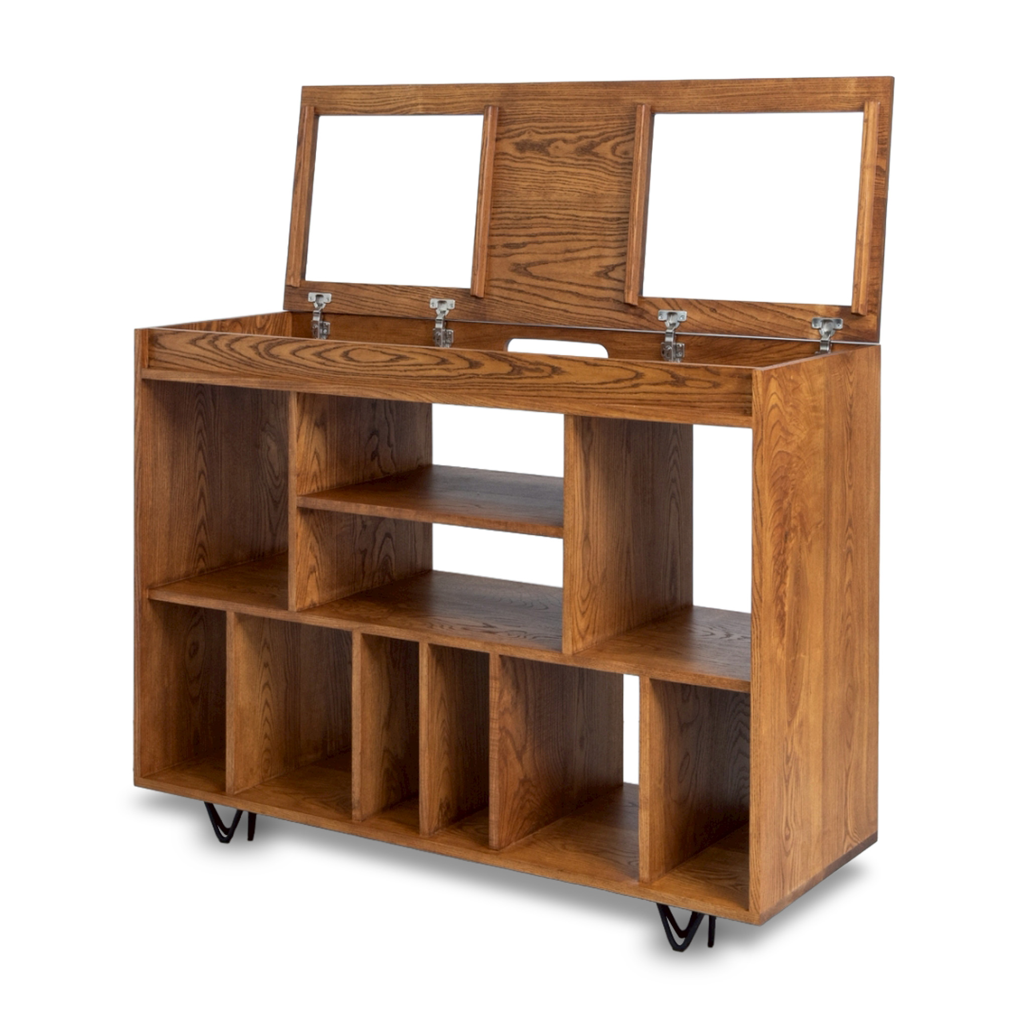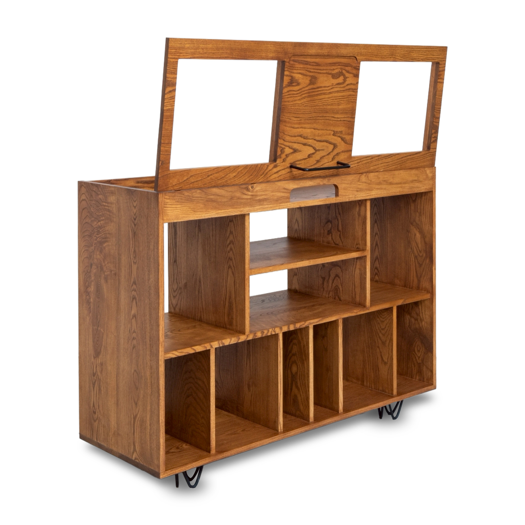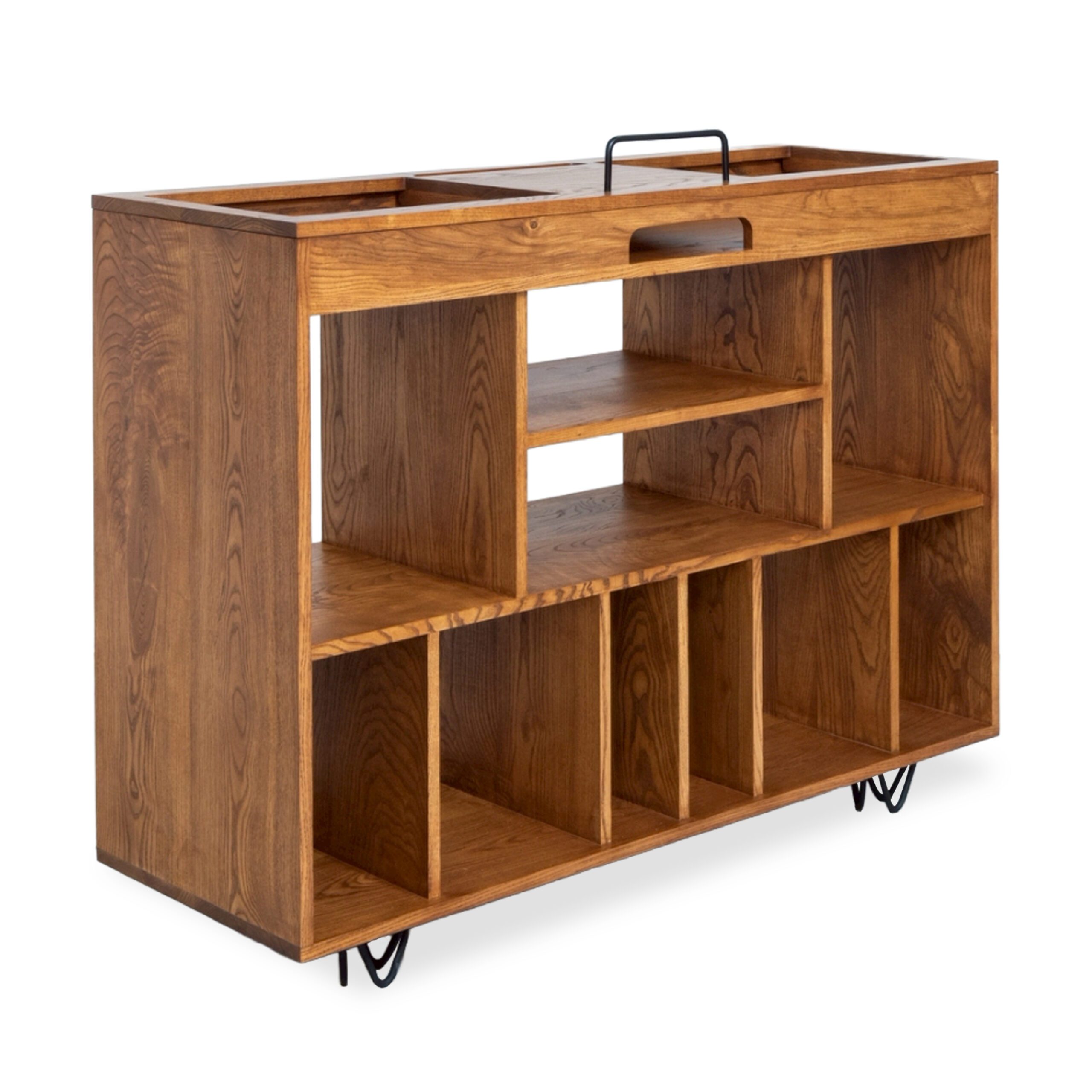 A purpose-built DJ console crafted from premium white ash and coated with a teak finish to enhance its appearance, the console showcases natural grain that elevates its character. The top panel opens smoothly to reveal a dedicated setup for professional DJ equipment—including turntables, mixers, and accessories—while the lower compartments are thoughtfully divided to organize vinyl and gear. High-quality casters provide effortless mobility, making it ideal for restaurants, bars, cafés, or home music corners that value both beauty and function.