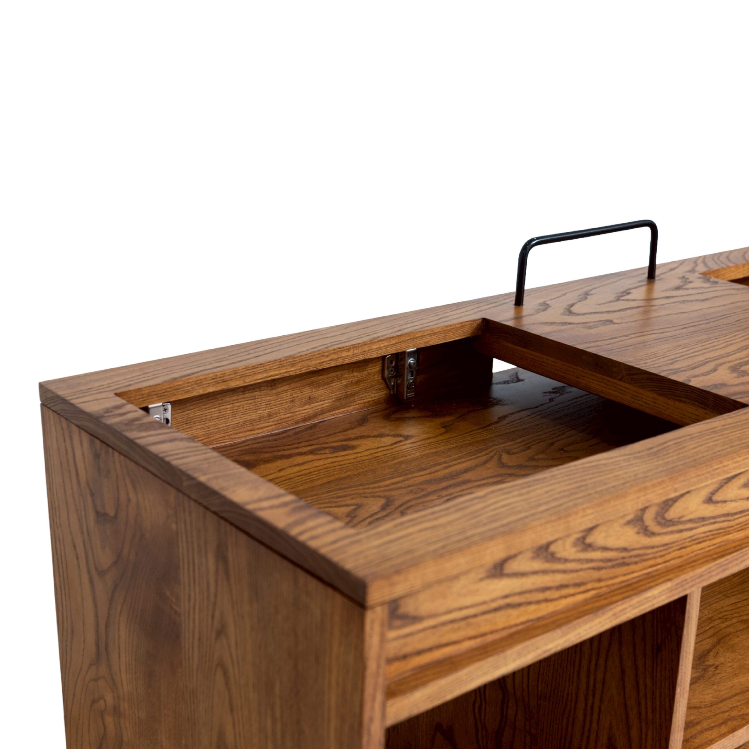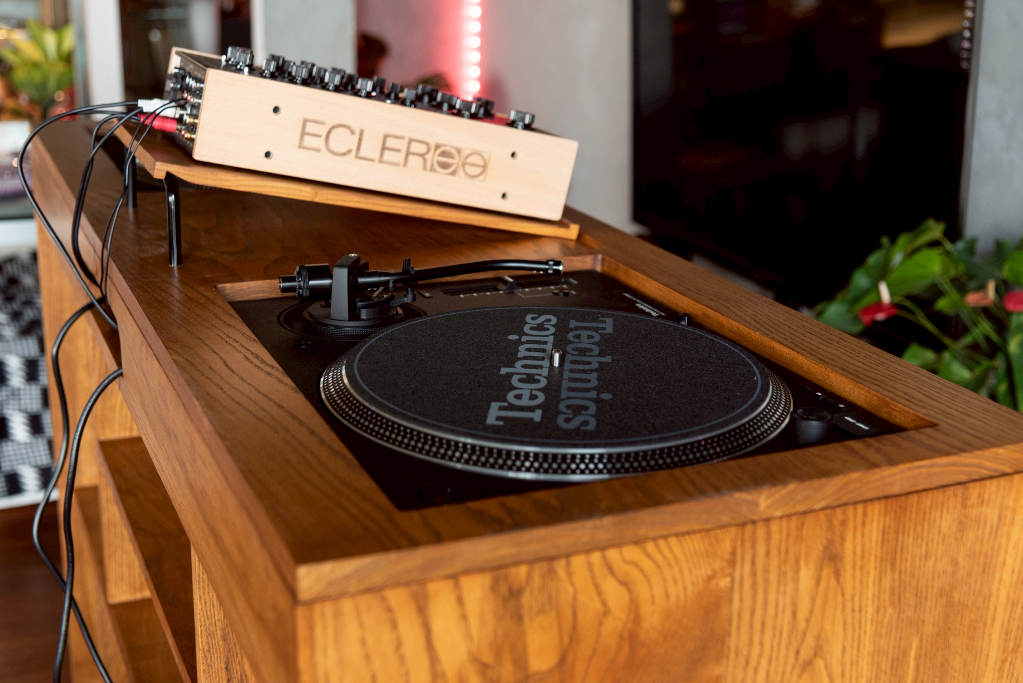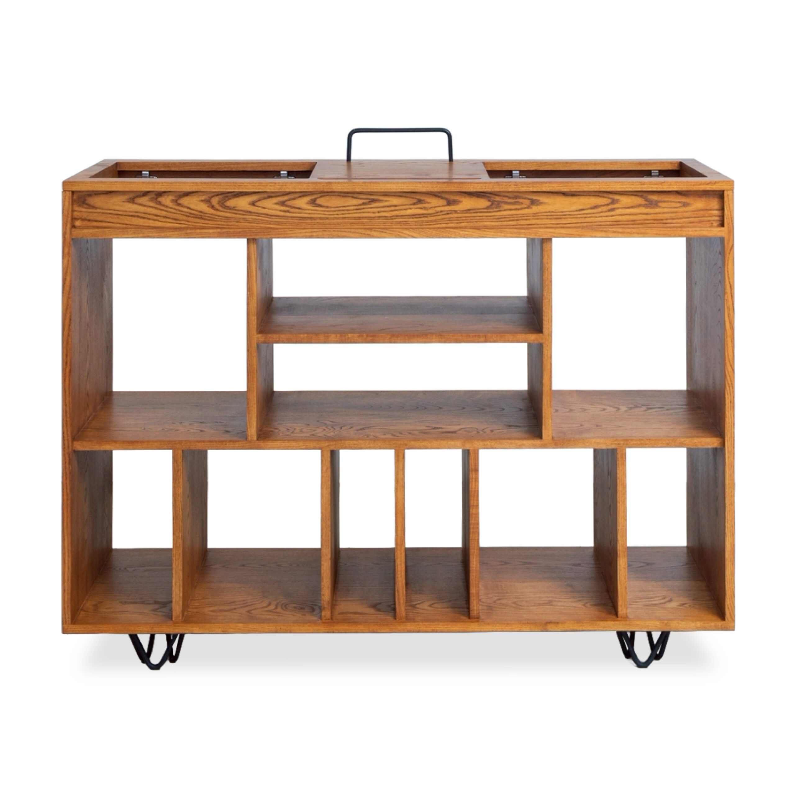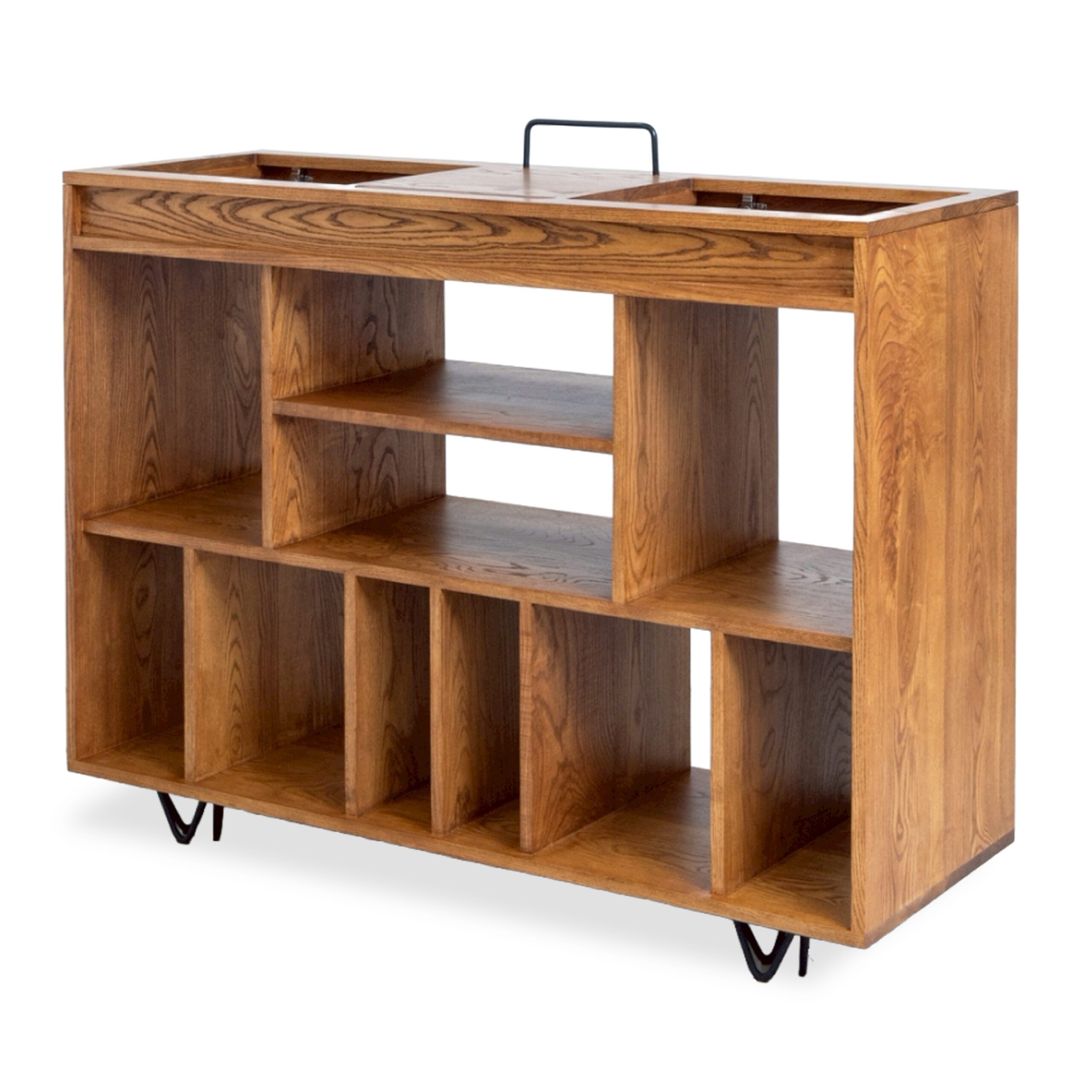 A purpose-built DJ console crafted from premium white ash and coated with a teak finish to enhance its appearance, the console showcases natural grain that elevates its character. The top panel opens smoothly to reveal a dedicated setup for professional DJ equipment—including turntables, mixers, and accessories—while the lower compartments are thoughtfully divided to organize vinyl and gear. High-quality casters provide effortless mobility, making it ideal for restaurants, bars, cafés, or home music corners that value both beauty and function.