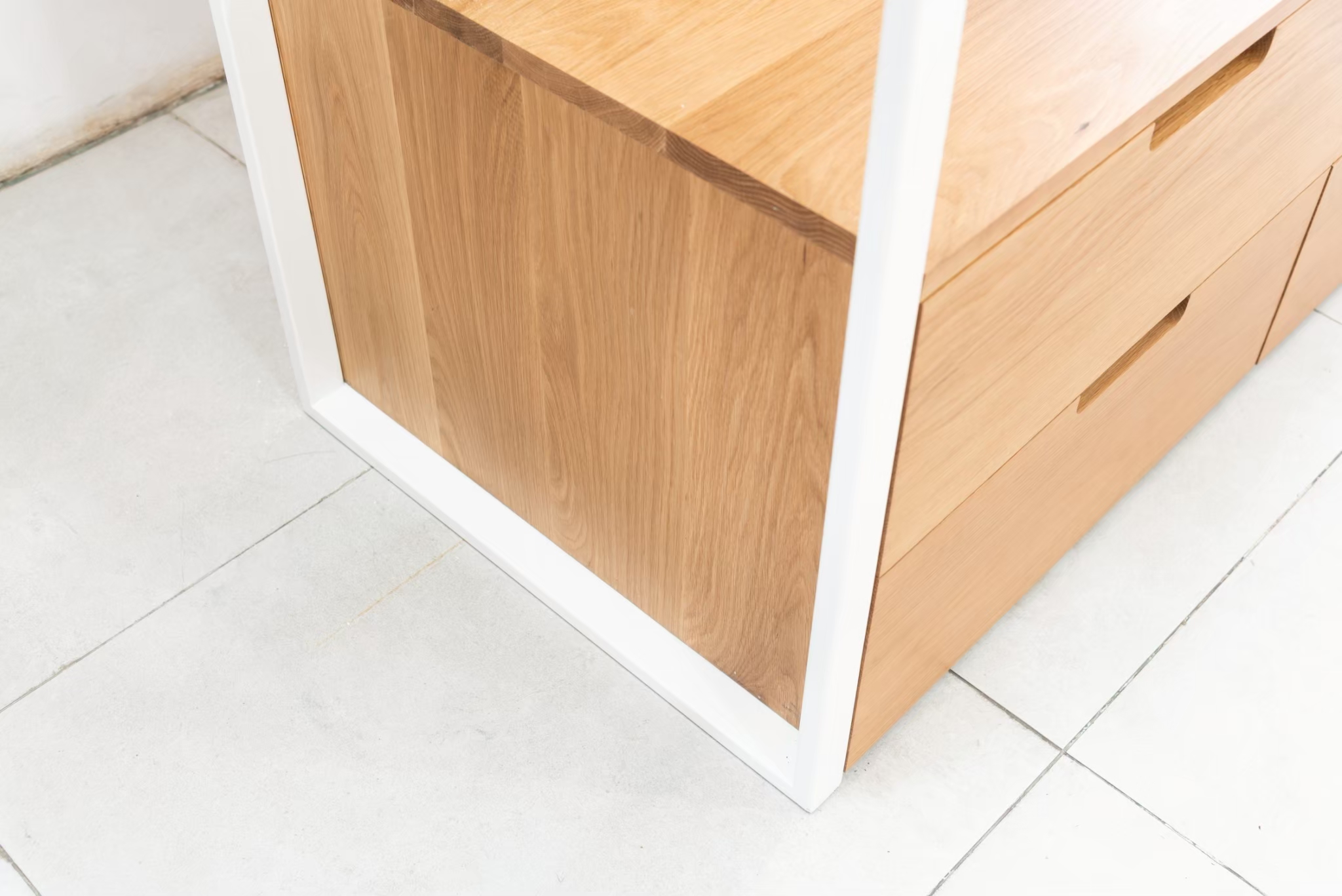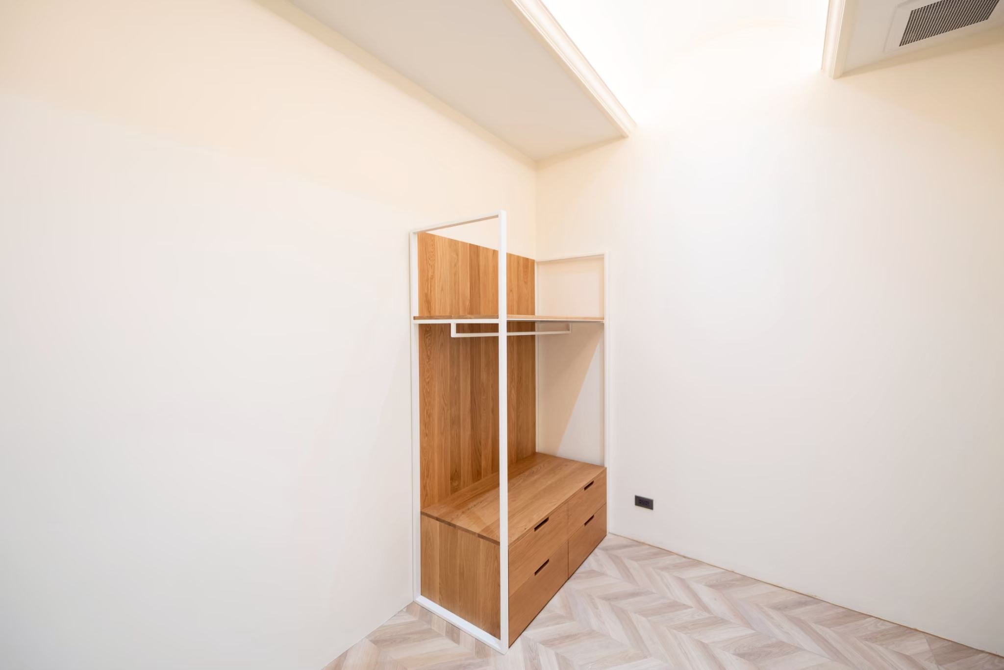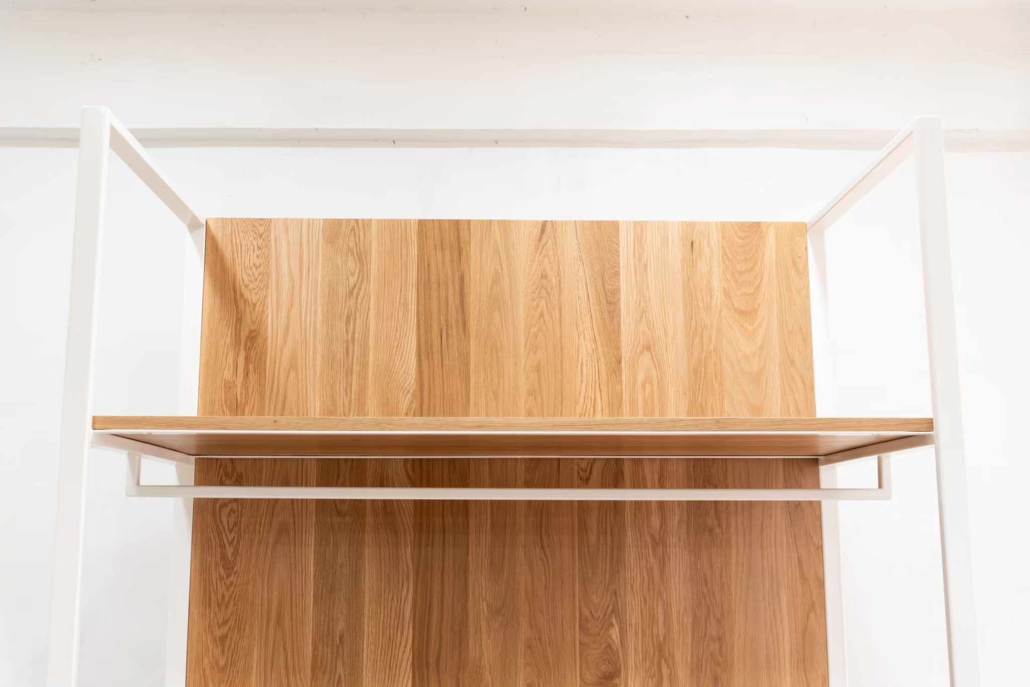 A versatile open wardrobe that blends function with warm, natural luxury. Its airy design features a sleek white steel frame perfectly paired with premium solid ash in a light natural tone, offering an elegant, calming presence. The top shelf and hanging rail provide easy-access storage, while the bottom drawers cleverly conceal clutter. Ideal for a walk-in closet, entryway display, or a modern, premium office storage solution.