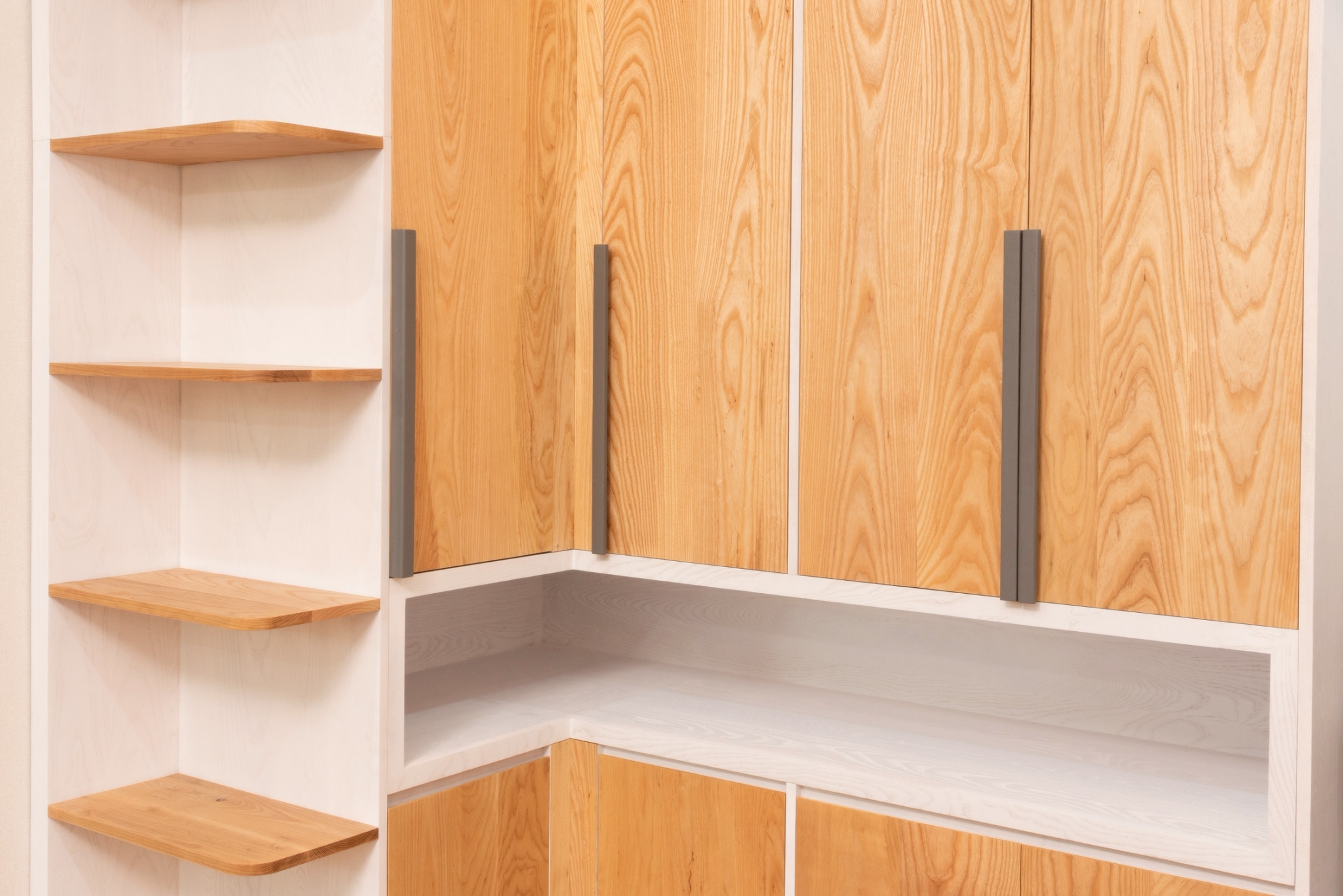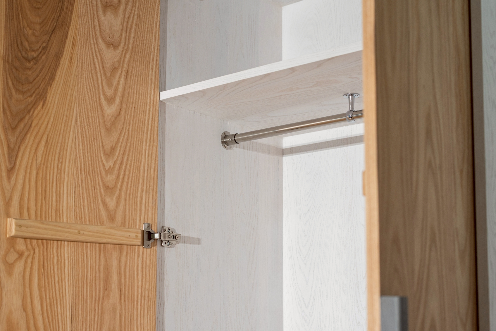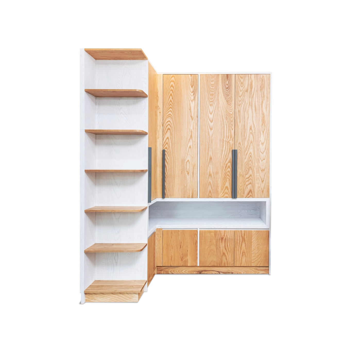 เติมบรรยากาศให้ผนังห้องเด็กด้วยตู้เสื้อผ้าดีไซน์โมเดิร์นที่ผสมความอบอุ่นของไม้แอชทำสีโทนอุ่นกับโครงสีขาวสะอาดได้อย่างลงตัว ลายไม้ชัดเจนช่วยให้พื้นที่ดูมีมิติและใกล้ชิดธรรมชาติ ด้านข้างเป็นชั้นวางแบบเปิดเรียงระดับ ทำให้หยิบของเล่นหรือของใช้บ่อย ๆ ได้สะดวกและเป็นระเบียบ ภายในตู้แบ่งสัดส่วนครบทั้งราวแขวน ชั้นวาง และช่องเก็บของ ช่วยให้จัดแต่งได้เป็นระบบ เหมาะกับห้องของเด็กที่ต้องการความคล่องตัว แต่ยังคงความเรียบเท่พอให้ผู้ใหญ่ใช้ร่วมกันได้อย่างไม่ขัดแย้ง — ฟังก์ชันและโทนสีจึงตอบโจทย์ทั้งสองวัย